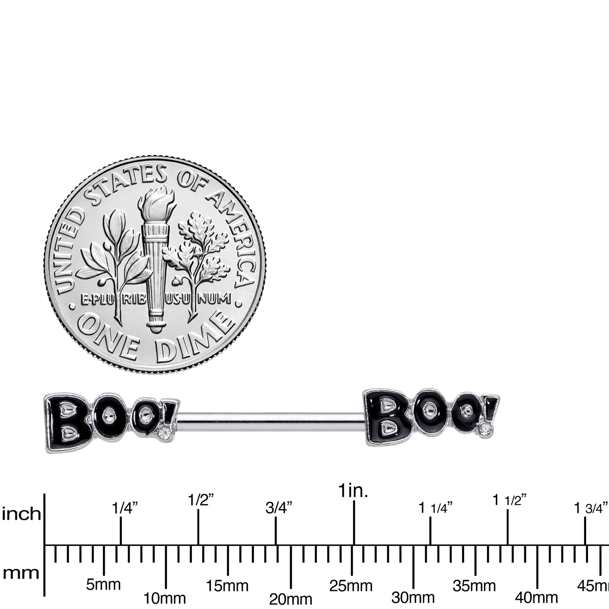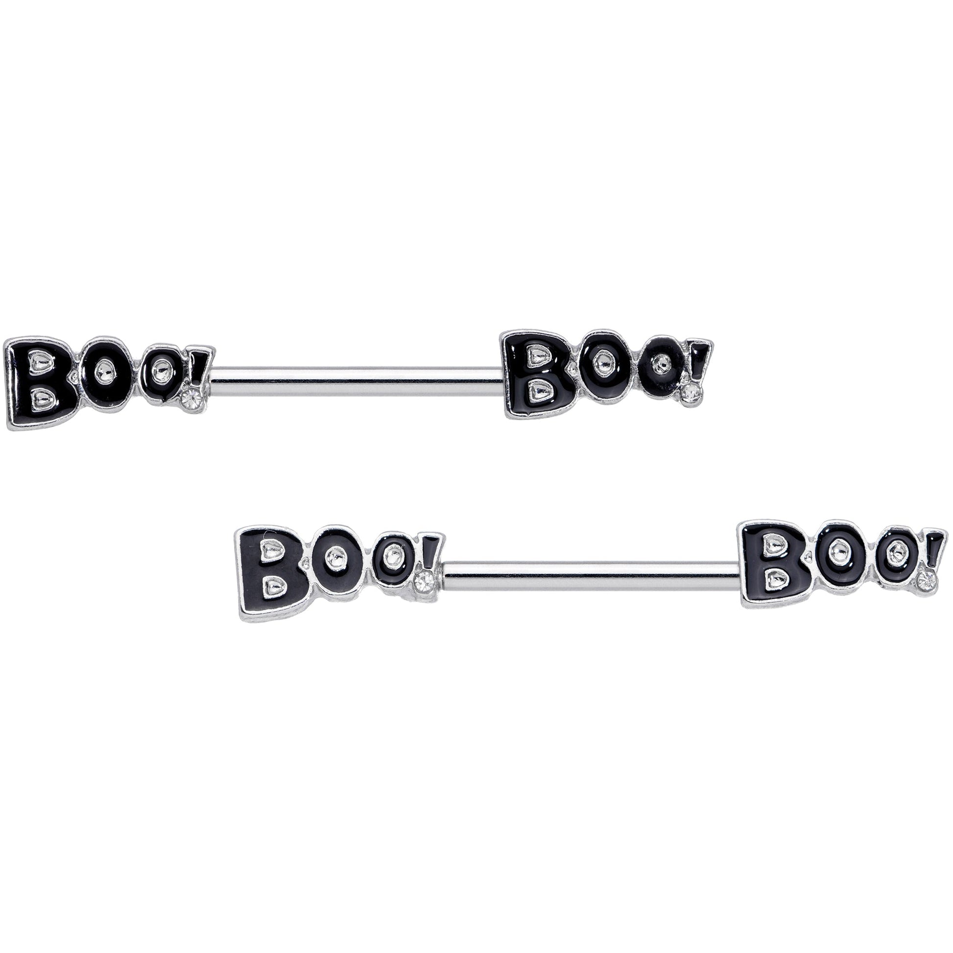 Give your look a little jump scare with this 14 gauge Halloween nipple jewelry! It's made with 16mm durable 316L surgical grade stainless steel straight barbells. Each end features a charm of the word "boo!", in angular, stylized lettering and embellished with a clear gem. It's inlaid in black, giving it a Halloween perfect appearance. This boo is sure to beautify your Halloween look! Sold as a set of two.Specifications