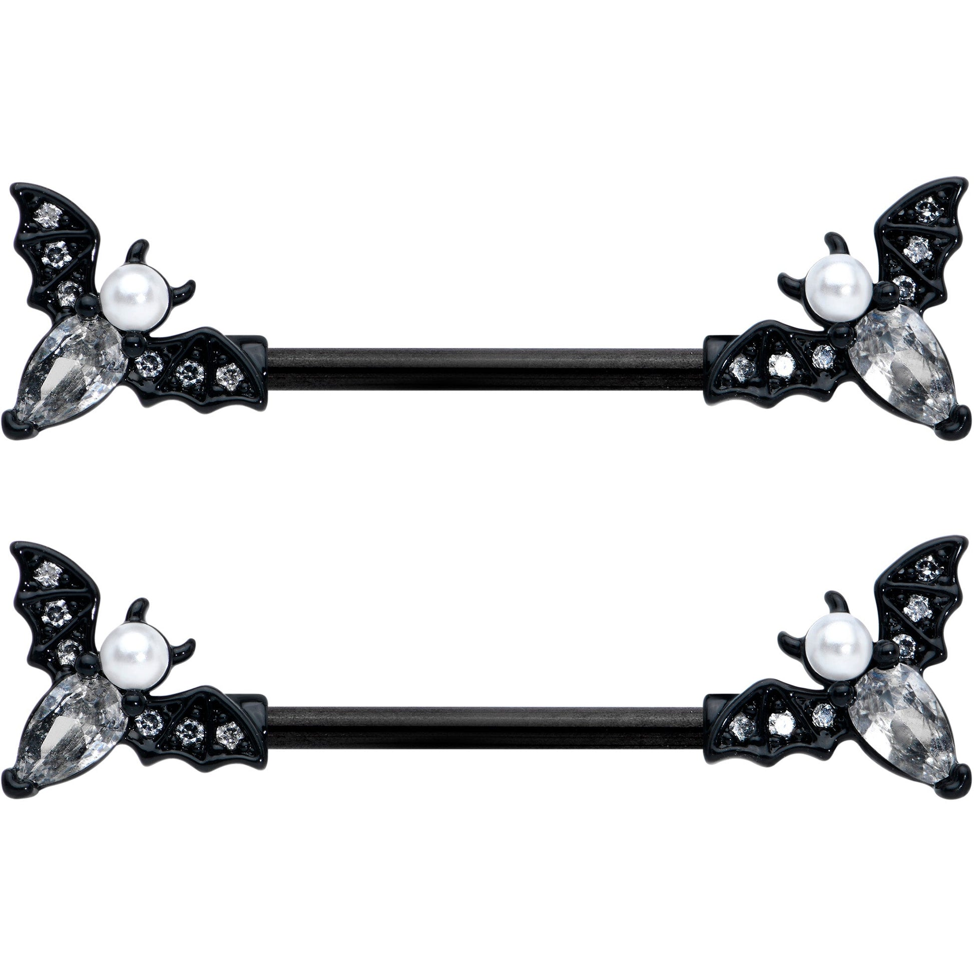 Let your piercings soar through the night skies like the bat on this 14 gauge nipple jewelry! It's made with 16mm black PVD over 316L surgical grade stainless steel straight barbells. The ends feature bat charms with their wings set with small clear gems. The bat's body is a single oval clear gem while its head is a white pearlescent orb. They're perfect for Halloween or to accessorize any gothic aesthetic. You're bound to be besotted with these Halloween bats! Sold as a set of two.Specifications