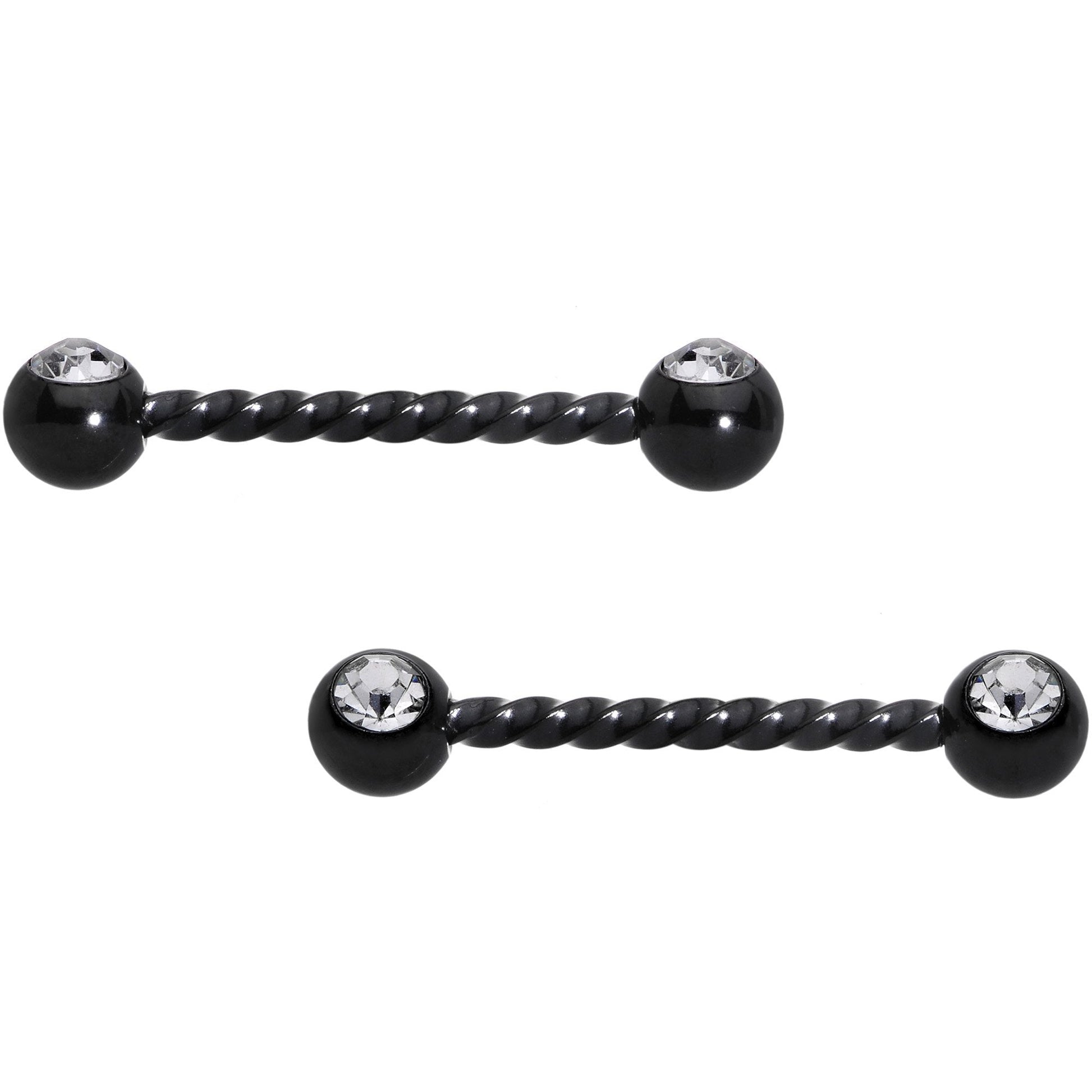 14 Gauge 5/8" Clear Gem Black Twisted Barbell Nipple Ring Set