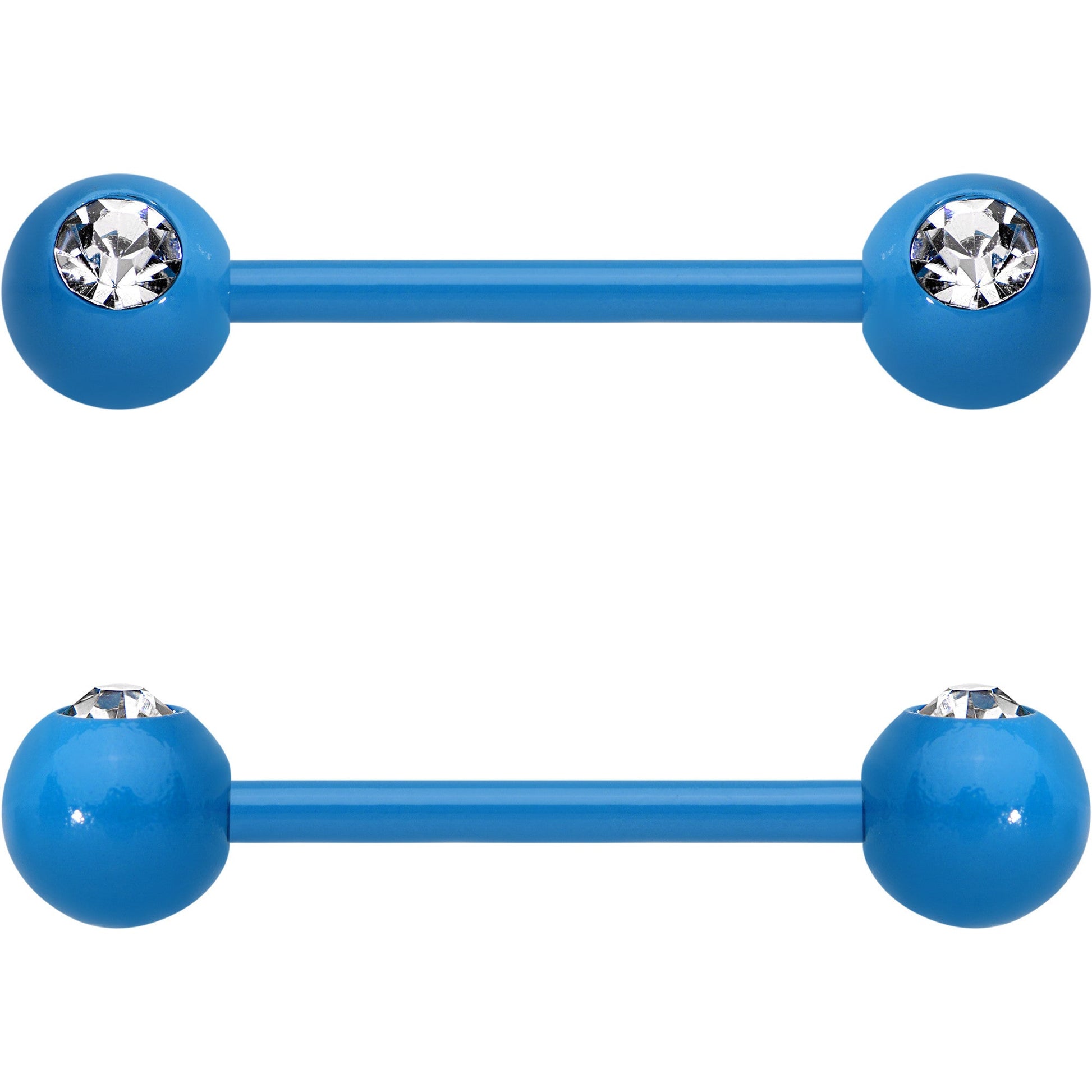 Hypoallergenic jewelry for sensitive skin.14 Gauge 5/8" Clear Gem Blue Acrylic Over Steel Nipple Barbell Set