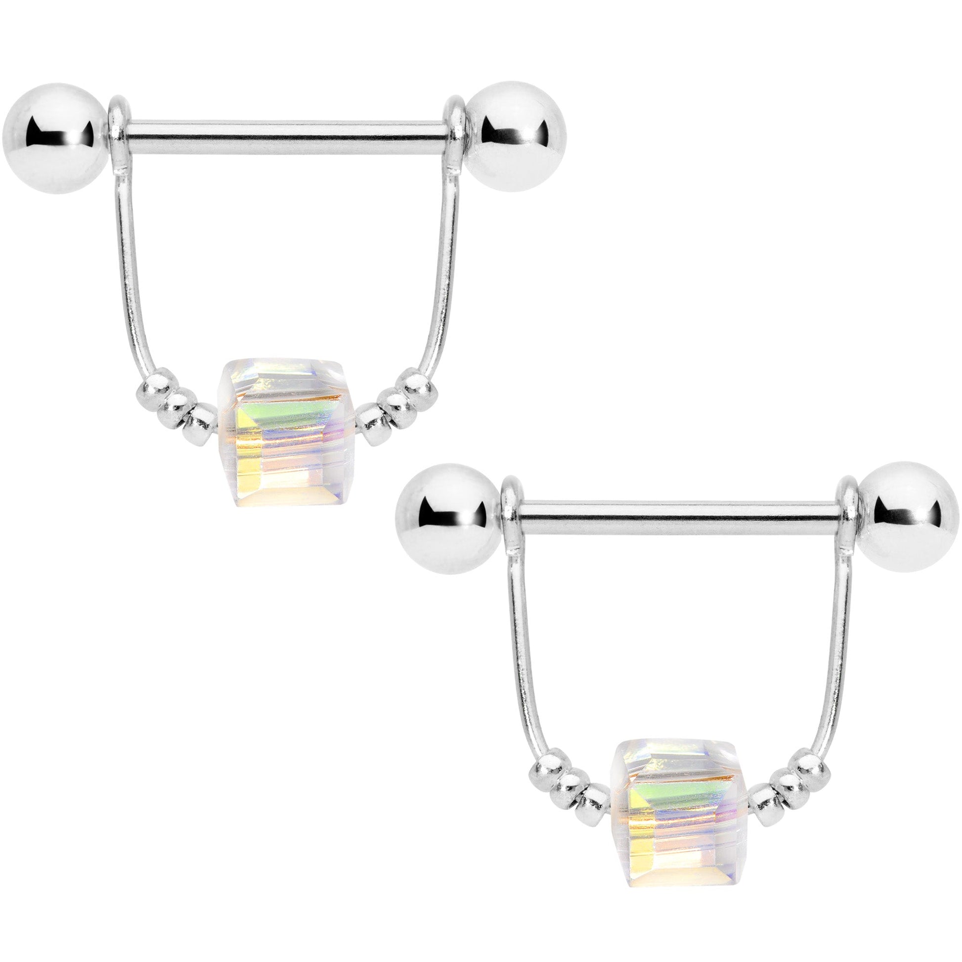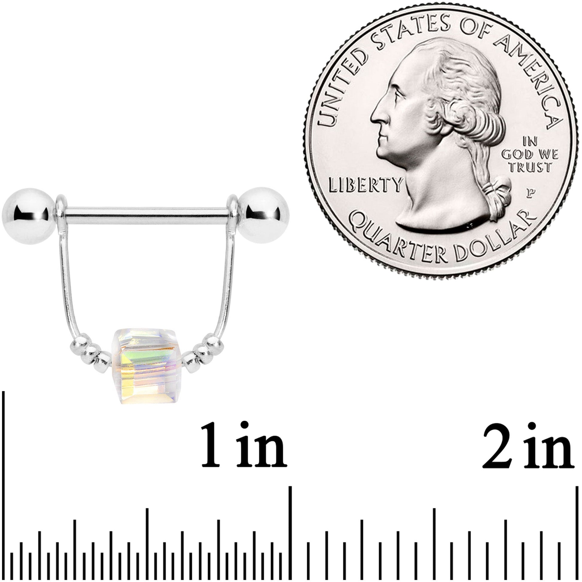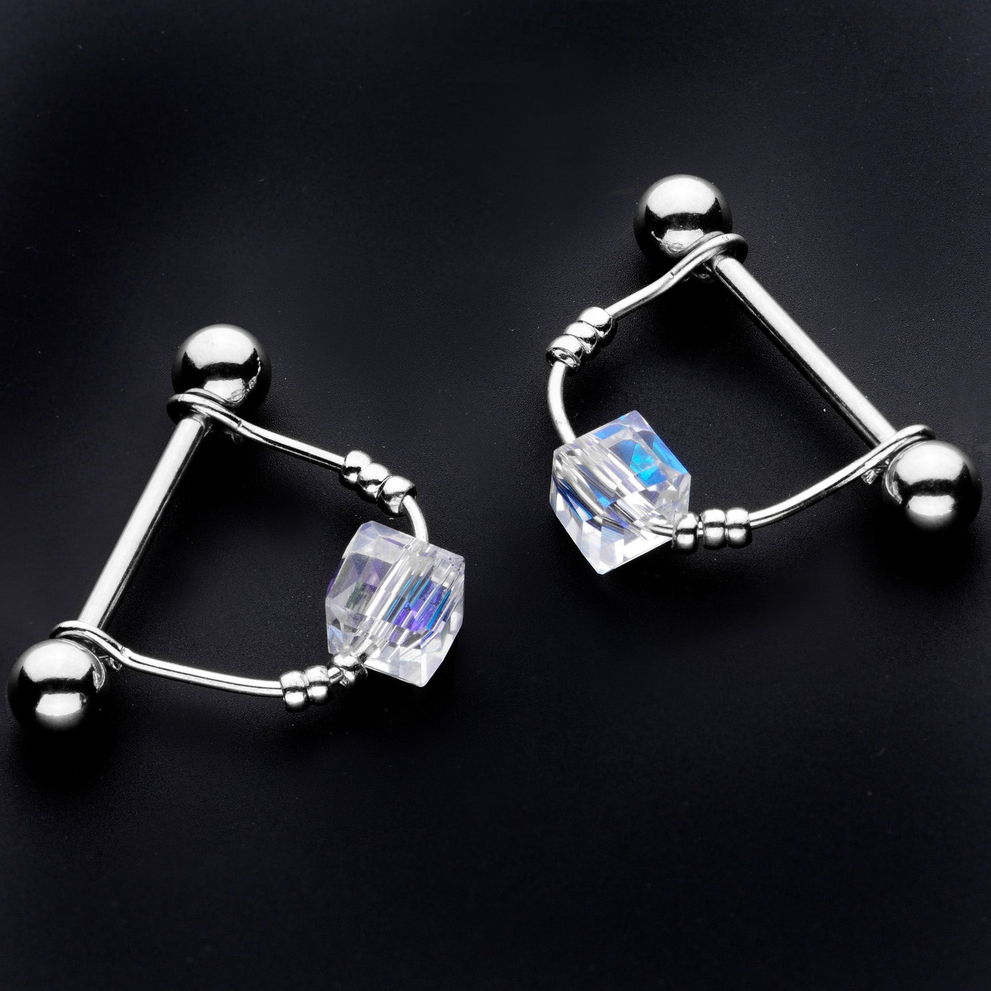 Saddle up and get ready to ride into style with this 14 gauge nipple jewelry! It's made with 16mm durable 316L surgical grade stainless steel straight barbells with 5mm ball ends. Each of the u-shaped dangles features a clear cube-shaped gem, centered between six small beads. The simple, sophisticated flair makes for an elegant appearance that's perfect whether you're going to ride the trails or just quietly hang out at home. Sold as a set of two.Specifications