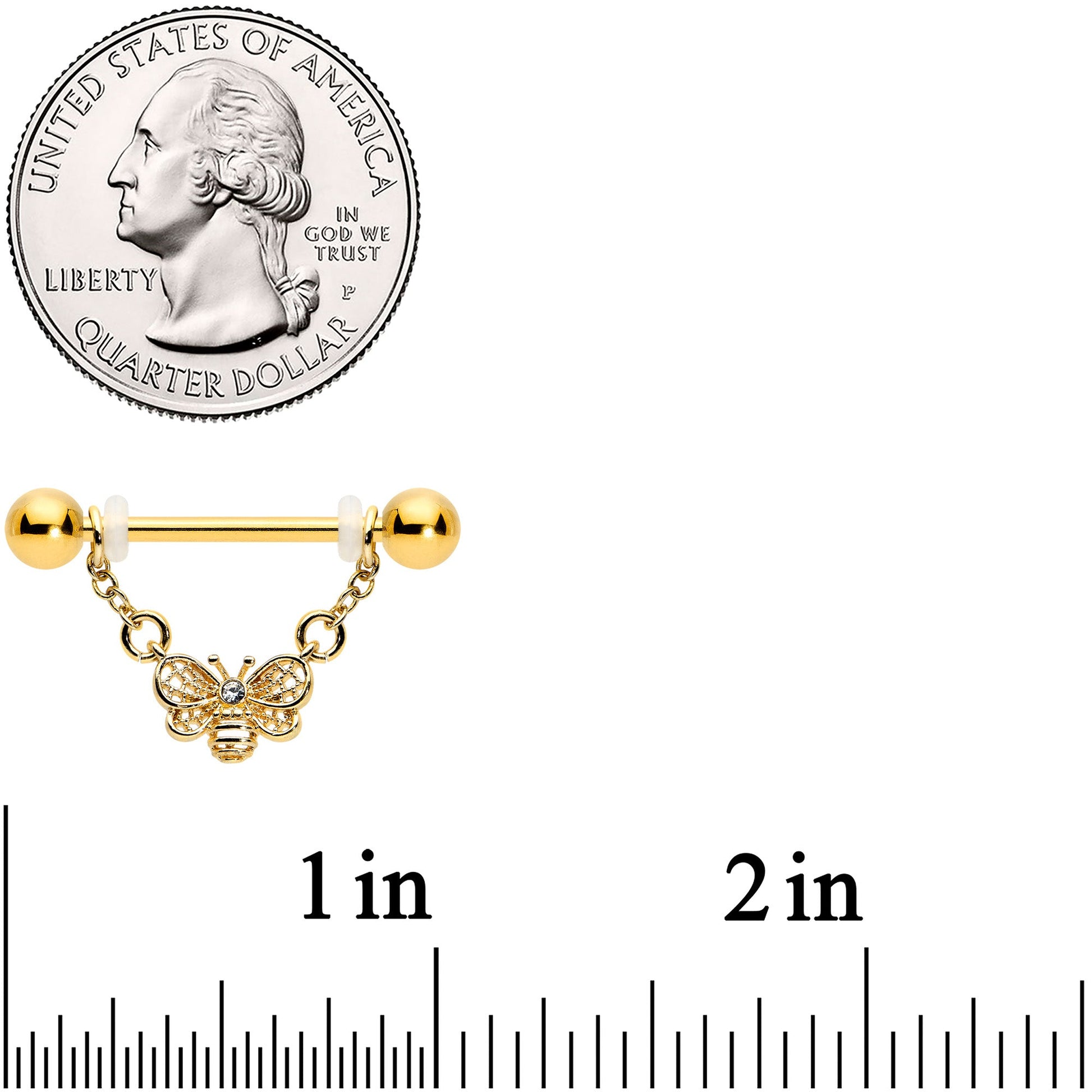 This 14 gauge nipple jewelry is sure to bee-utify your nipple piercings! It's made with a 16mm gold tone PVD over 316L surgical grade stainless steel straight barbells with 5mm ball ends. Each one features a bee charm supported by matching lengths of chain, with understated detailing and embellished with a tiny clear gem set at the heads. The bees also features openwork wings for a cohesive and airy appearance. This understated insect nipple piercing jewelry is sure to bee your favorite! Sold as a set of two.Specifications