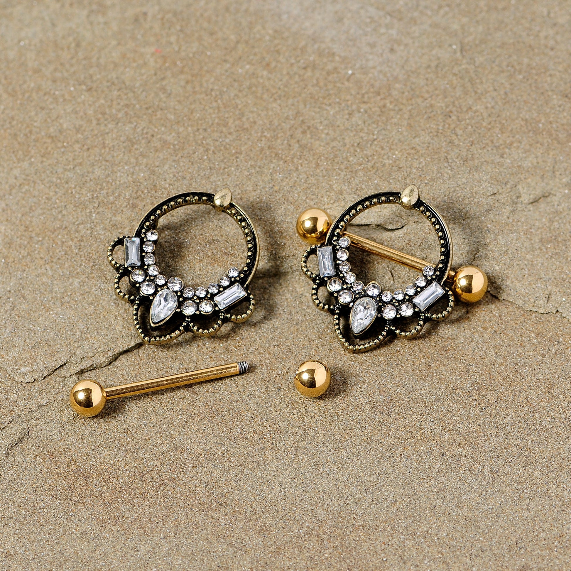 14 Gauge 5/8 Clear Gem Gold Tone Filigree Nipple Shield Set