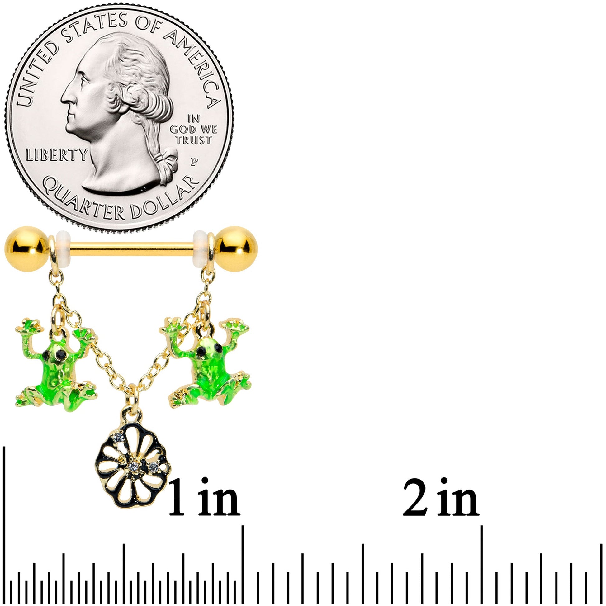 Bring the great outdoors inside with this 14 gauge nipple jewelry! It's made with 16mm gold tone PVD over 316L surgical grade stainless steel straight barbells with 5mm ball ends. Dangling from each is a length of matching chain which supports a flower charm with openwork petals. The flower is embellished with clear gems. The flower is flanked by a pair of green tree frog charms that even have realistic little toes! You can practically smell the fresh air when you're rocking this frog and flower nipple piercing jewelry! Sold as a set of two.Specifications