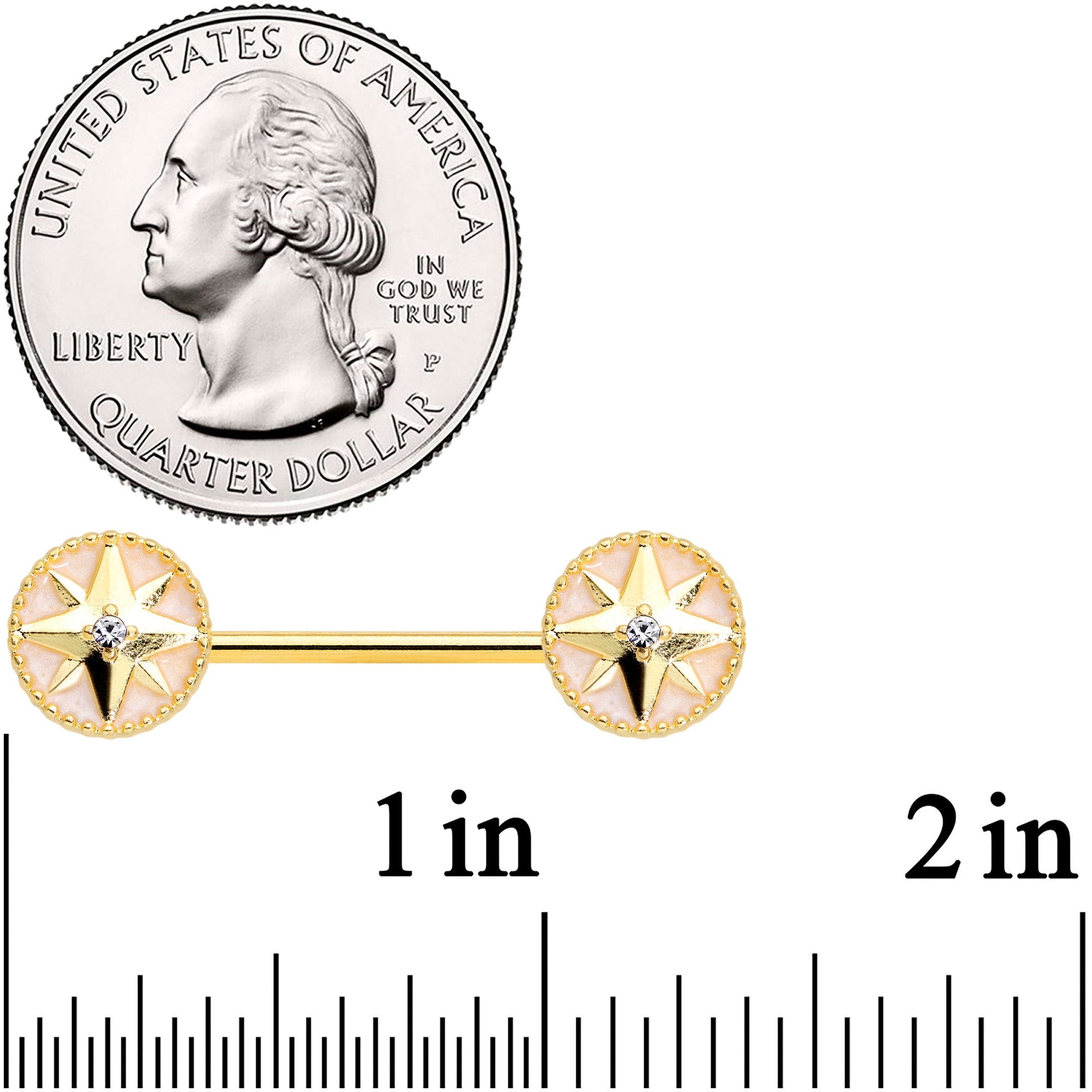 Set sail with confidence - this 14 gauge nipple jewelry tells the world that you know where you're headed! It's made with 16mm gold tone PVD over 316L surgical grade stainless steel straight barbells. The ends each feature a compass rose charm with the arms of the compass raised and a clear gem set at the center. Raise the anchor with this nifty, navigational nipple jewelry! Sold as a set of two.Specifications
