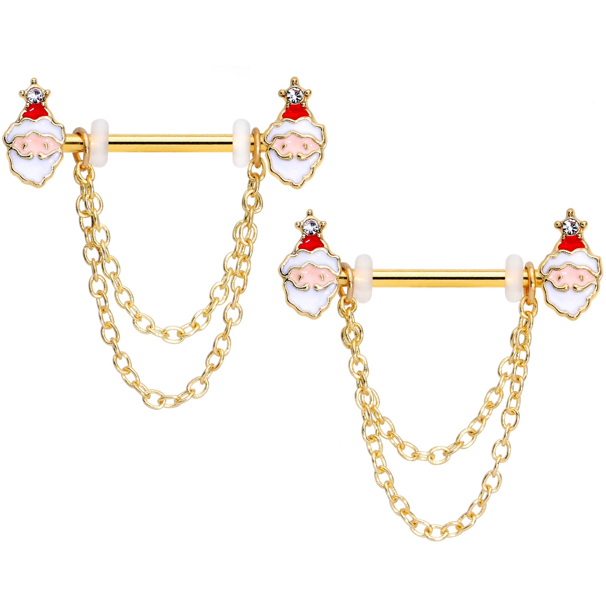 Santa Claus is coming to your nipple piercings, with this 14 gauge jewelry! It's made with 16mm gold tone plated over 316L surgical grade stainless steel straight barbells. The ends are red and white Santa Claus charms that are perfect for Christmas. Santa's hat is inlaid in red and white and topped with a small clear star-shaped gem. These nipple rings also feature a double length of chain that dangles down from the barbell. The chain is held in place by a pair of o-rings that you can adjust to get just the look you're after. Now that's sure to help you have a happy ho-ho-holiday! Sold as a set of two.Specifications