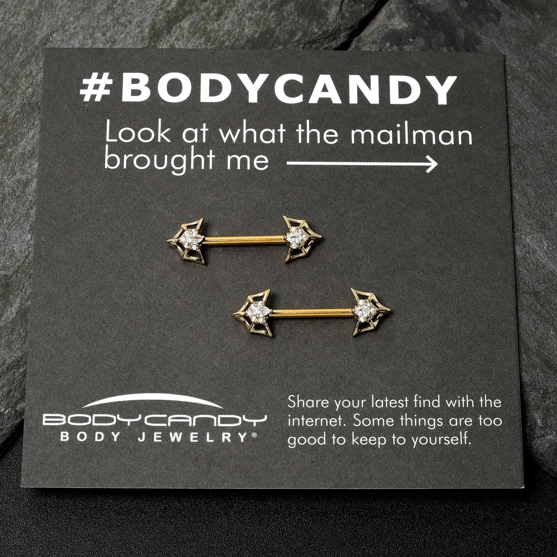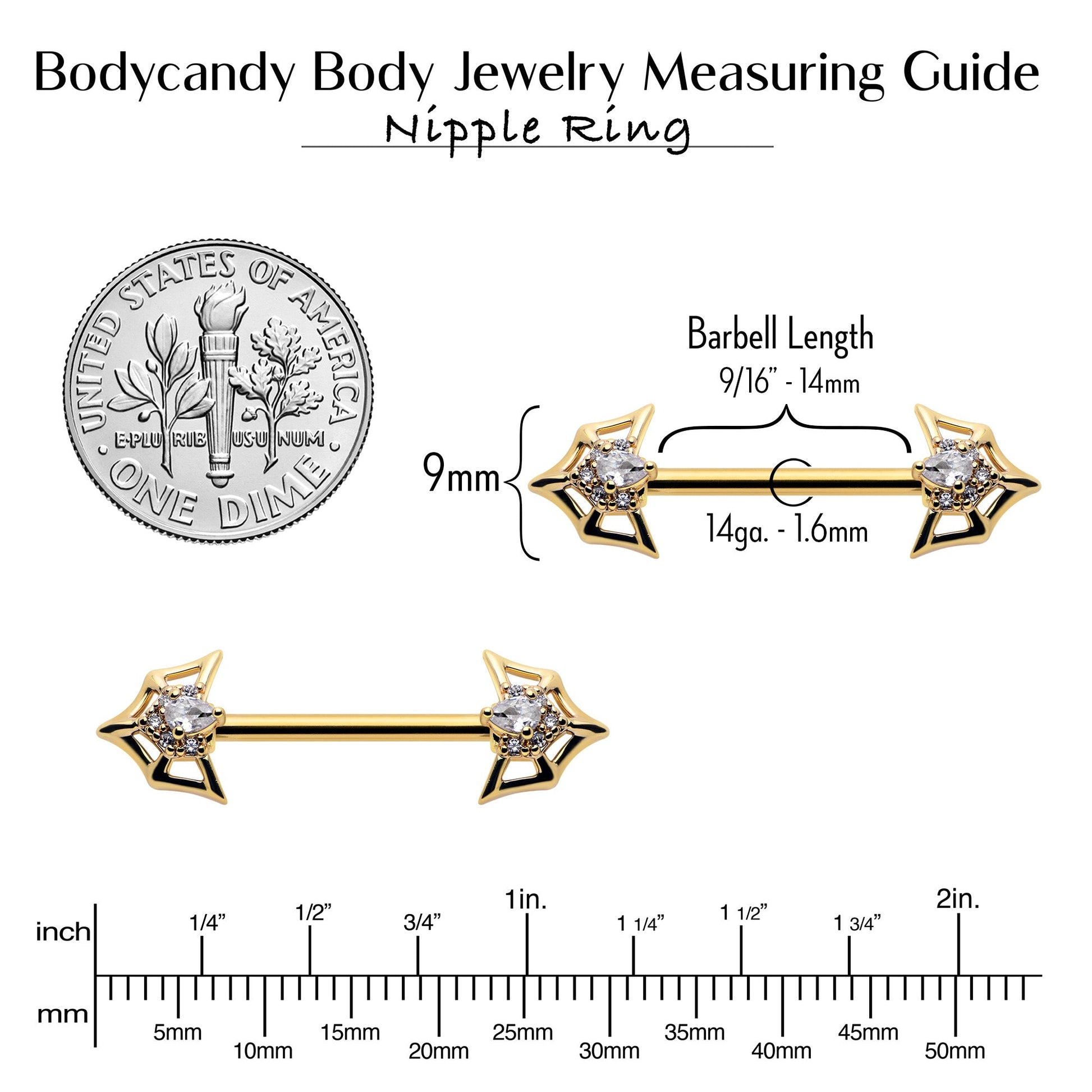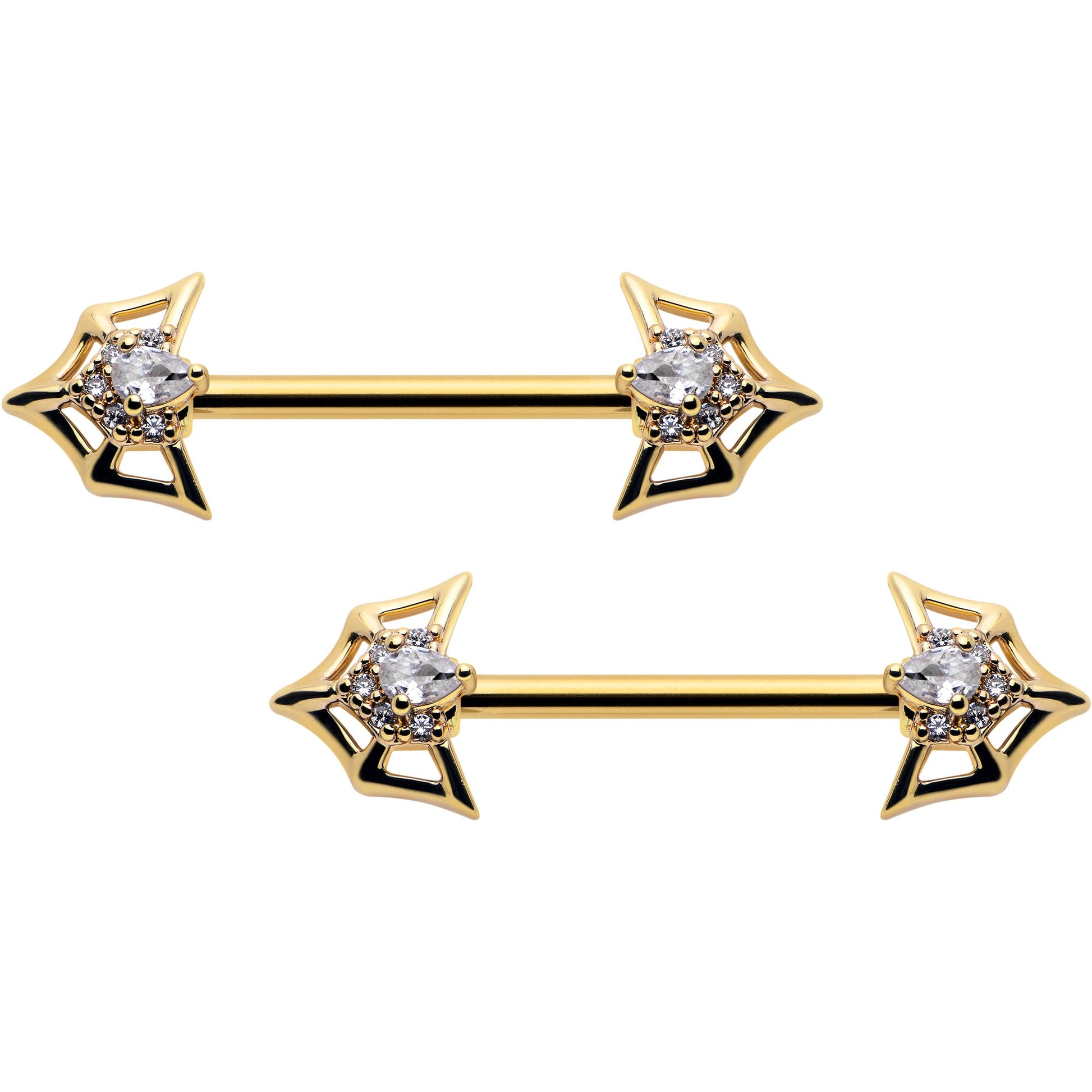 Show your appreciation for those stunning bats and spiders with this 14 gauge nipple jewelry. It is made with 16mm gold tone plated over 316L surgical grade stainless steel straight barbells. Each of the ends features a a bat-shaped spiderweb charm. Set at the centers are single large, clear gems which are surrounded by matching smaller clear gems. Show your fondness for all the awesome arachnids and beautiful bats with these gorgeous nipple piercing rings. Sold as a set of two.Specifications