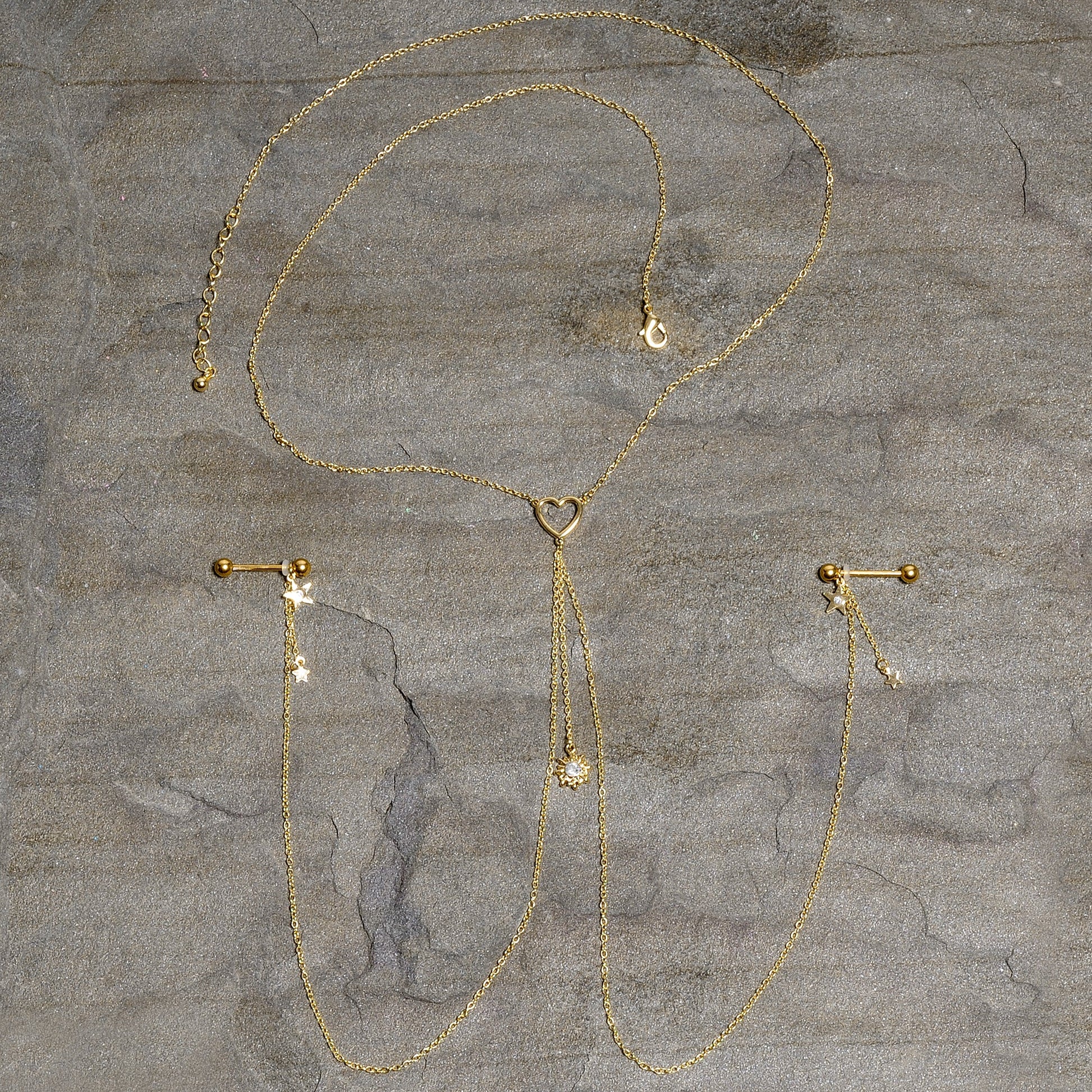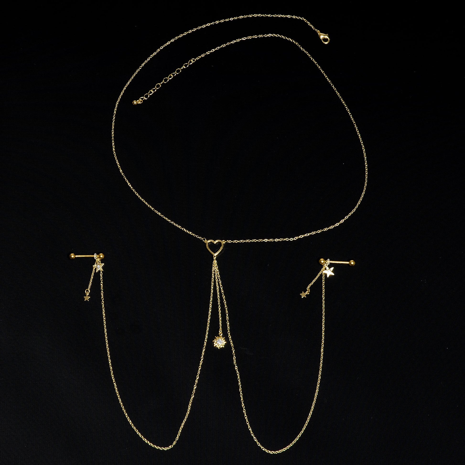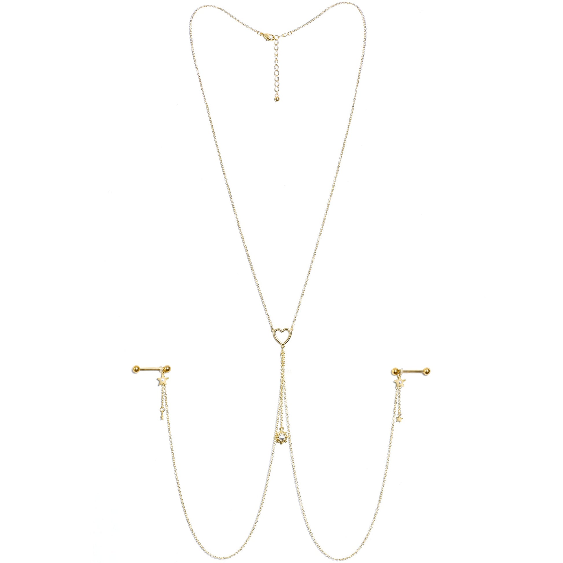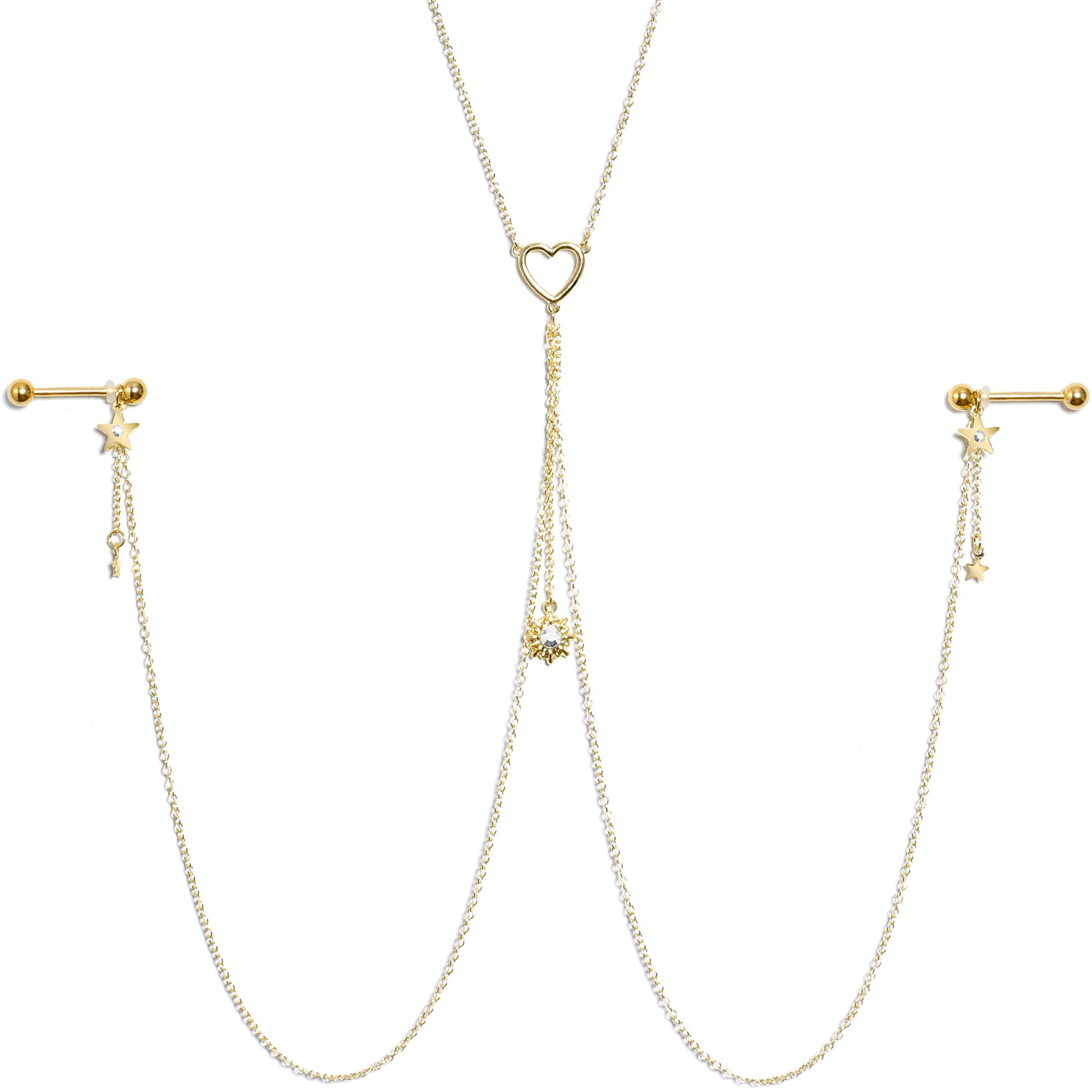 You're going to love this necklace to nipple chain to the stars and back! It features a 14" length necklace that has an openwork heart charm at the center. The heart has three lengths of matching chain dangling from it. The center one is 2" in length and supports gorgeous sun charm that's set with a clear gem in the center. The other two chains are 12" and connect to the 16mm gold tone plated over 316L surgical grade stainless steel straight barbells with 5mm ball ends. Dangling from the barbells are star charms with clear gems and tiny unadorned stars than dangle from 1" lengths of chain. With this stunning necklace nipple chain, your pierced nipples are sure to be stars!Specifications