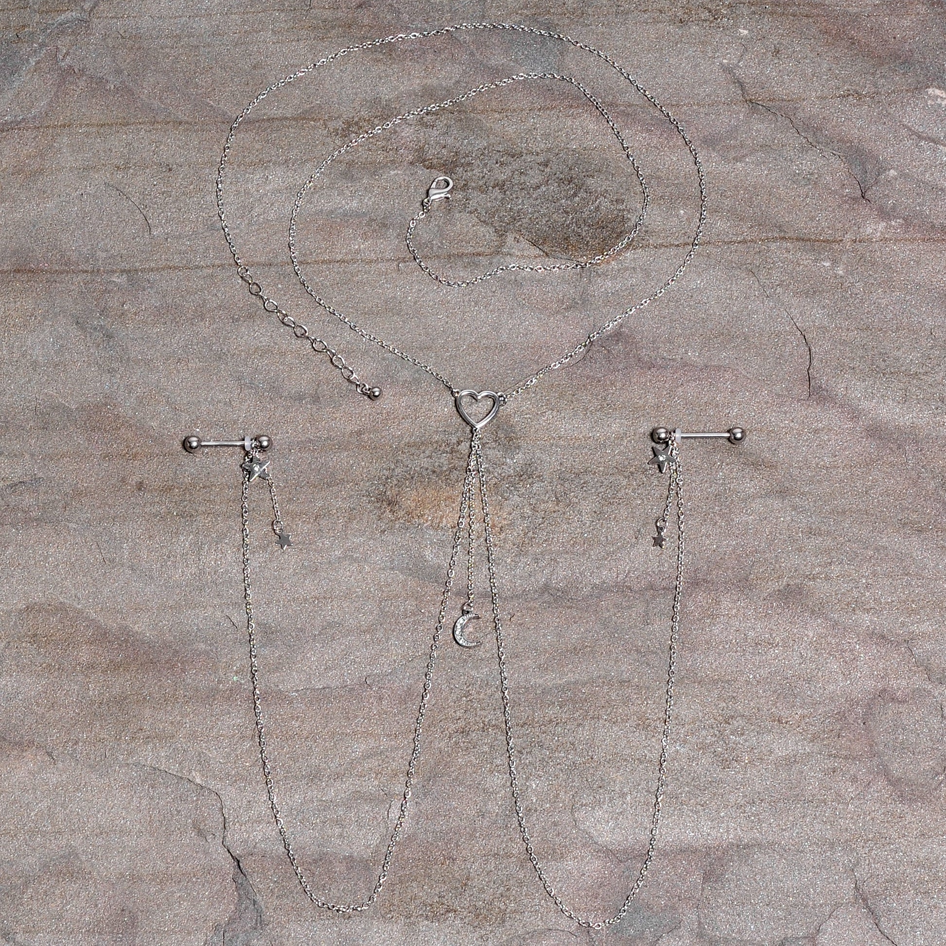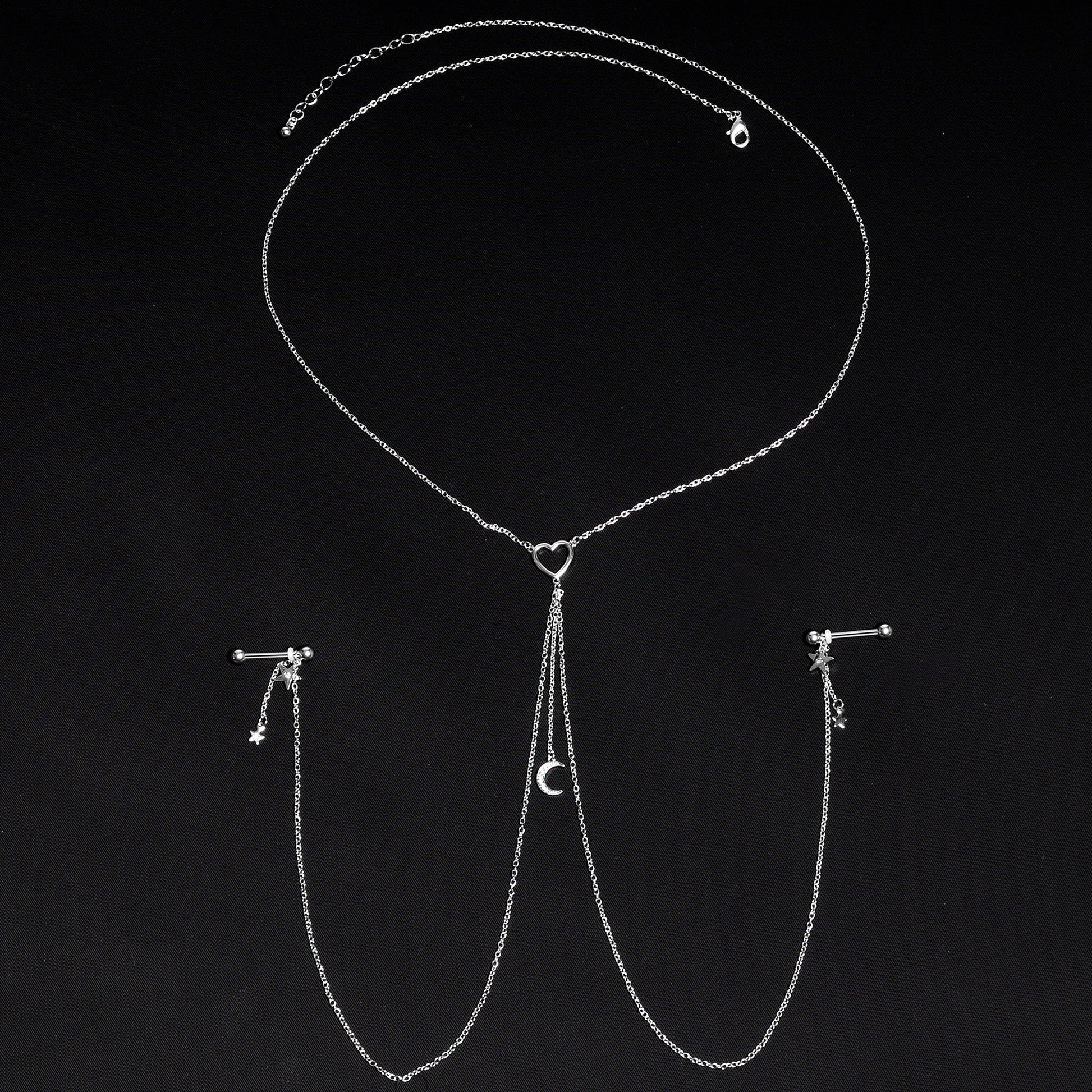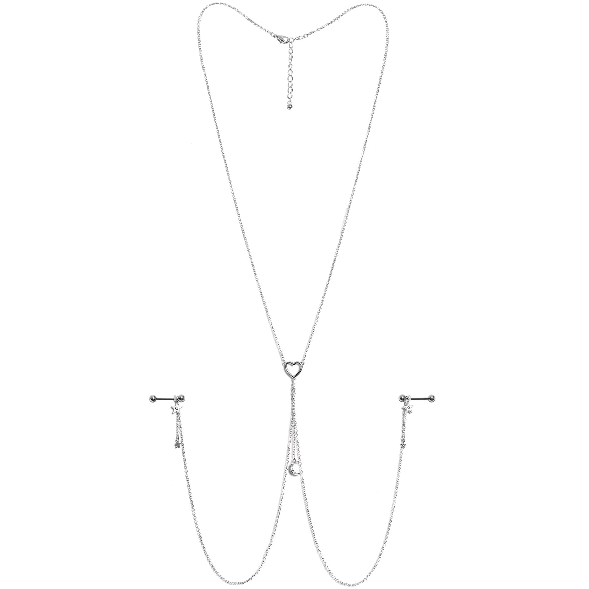 You're going to love this necklace to nipple chain to the stars and back! It features a 14" length necklace that has an openwork heart charm at the center. The heart has three lengths of matching chain dangling from it. The center one is 2" in length and supports gorgeous crescent moon charm that's set with clear gems. The other two chains are 12" and connect to the 16mm durable 316L surgical grade stainless steel straight barbells with 5mm ball ends. Dangling from the barbells are star charms with a single clear gem and tiny unadorned star charms than dangle from 1" lengths of chain. With this stunning necklace nipple chain, your piercings are sure to be stars!Specifications