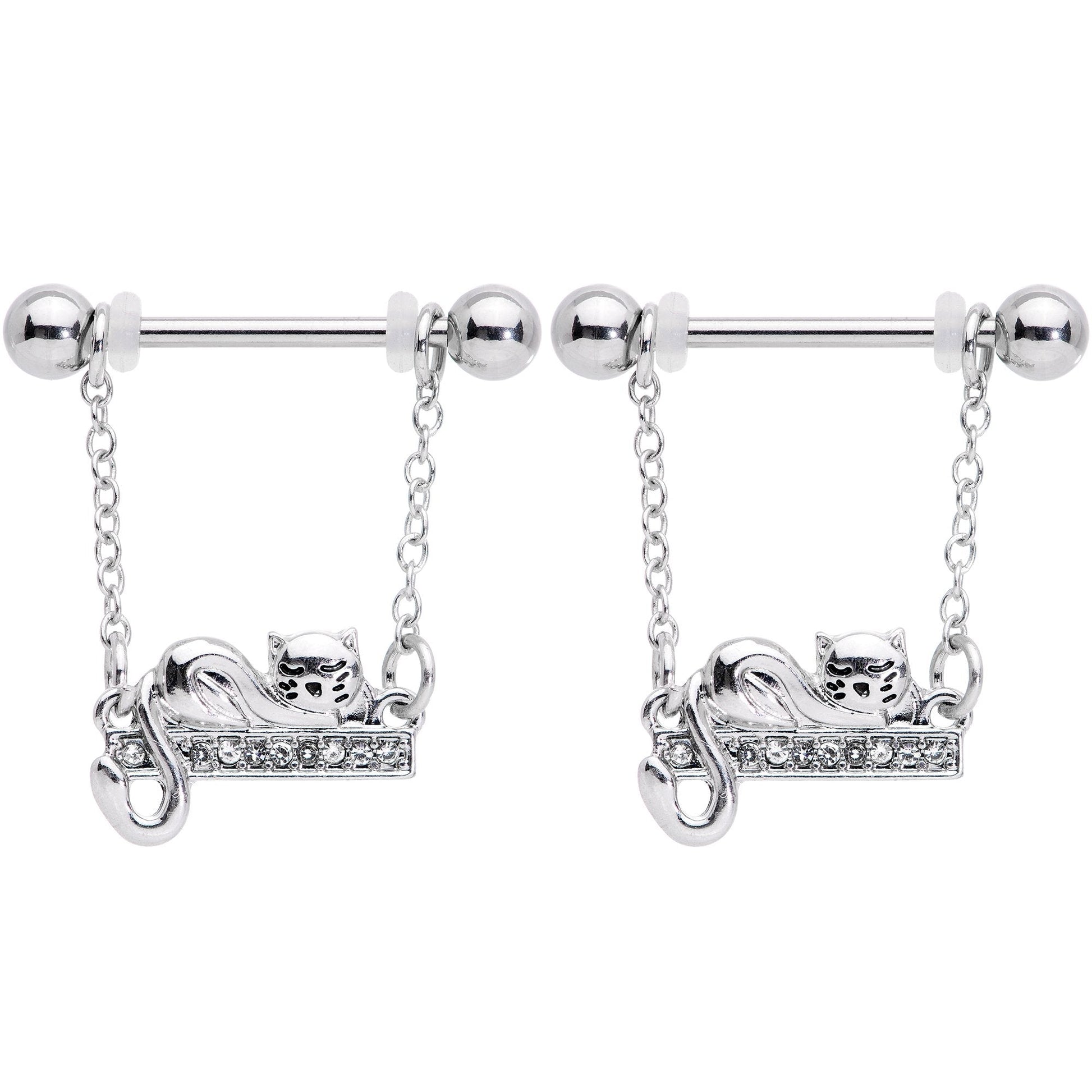 This little kitty has found a perfect perch on which to nap! These 14 gauge nipple piercings are made with 16mm durable 316L surgical grade stainless steel straight barbells with 5mm ball ends. They feature a charm of a cat in a retro 50s style, napping on a row of tiny clear gems. The cat's face has a serene expression and the details really make them stand out. How purrr-fectly charming! Sold as a set of two.
