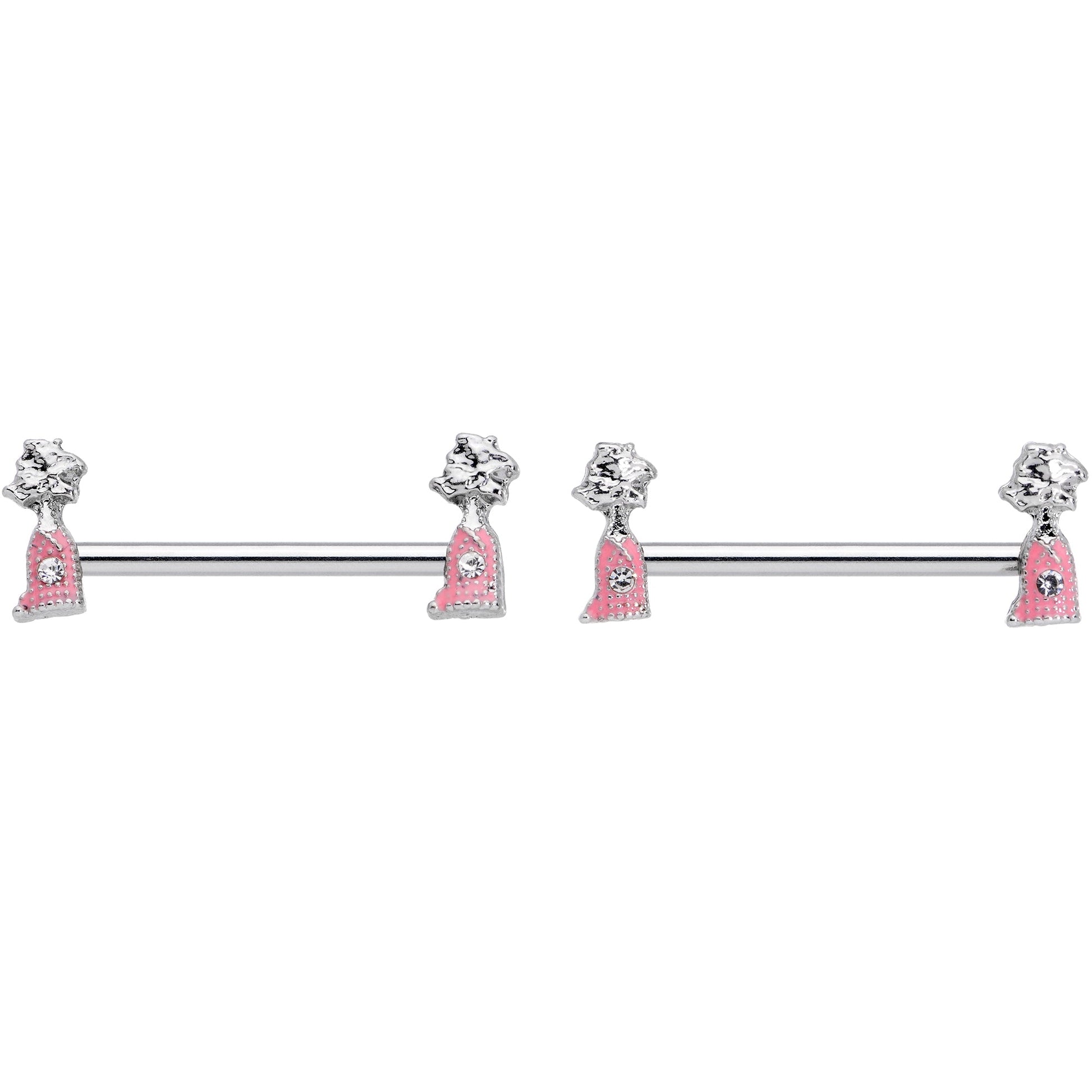 Happy New Year! Pop the cork and celebrate with this 14 gauge nipple jewelry! It's made with 16mm durable 316L surgical grade stainless steel straight barbells. Each of the ends features a pink champagne bottle charm set with a clear gem at the center. The bottles are topped with textured bubbles for a realistic look that's still fun, fashionable, and festive. Ring in the new year with these beautiful bubbly nipple barbells in your piercings! Sold as a set of two.Specifications