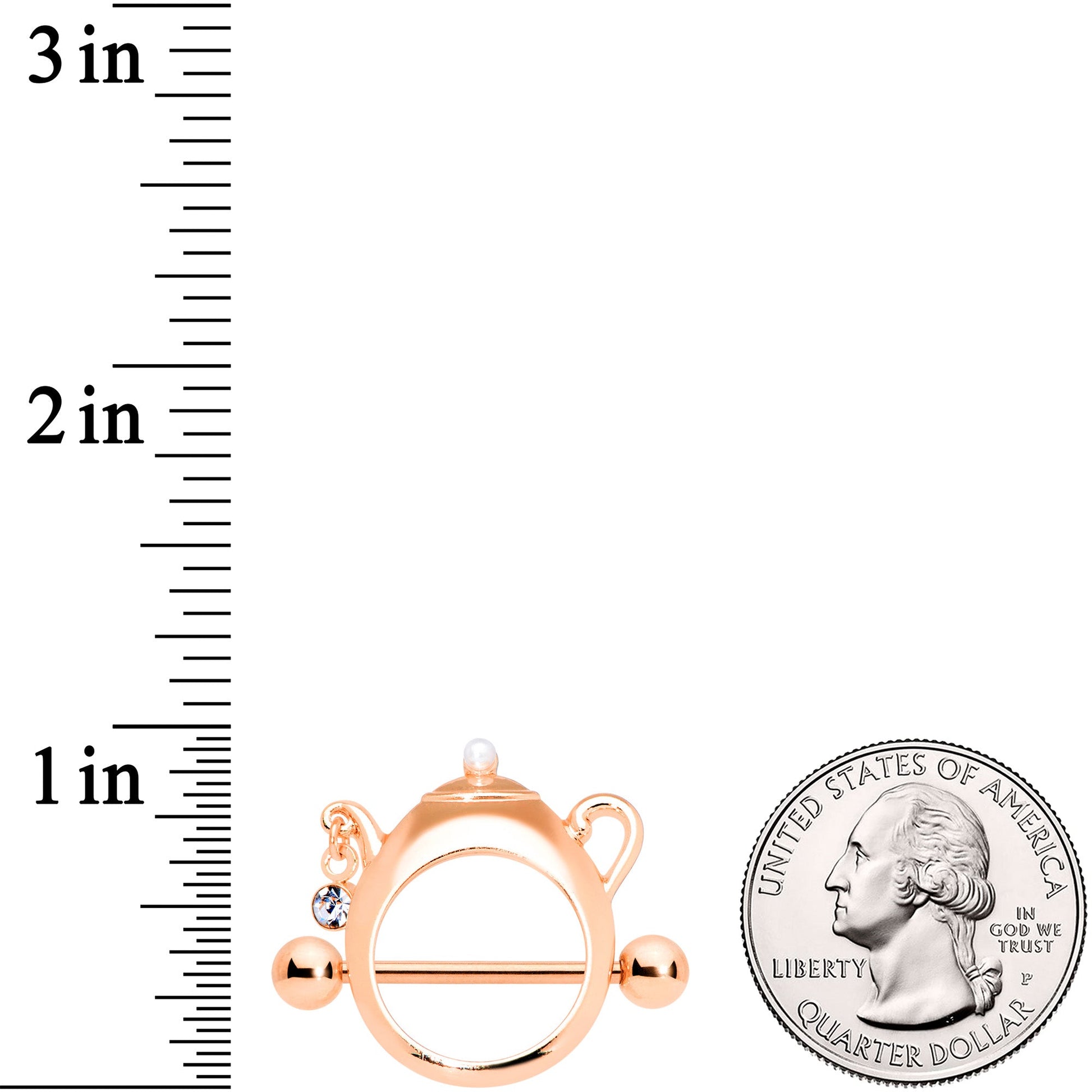 Spill the tea....or don't with this 14 gauge nipple jewelry! It's made with 16mm rose gold tone plated over 316L surgical grade stainless steel straight barbells with 5mm ball ends. The shield portion is shaped like a teapot, with a beautifully curved handle. It's embellished with a white pearlescent orb on the top of the lid and a small clear gem that dangles from the spout. Whether your look is hot and steamy or icy-cool, these teapot-shaped nipple shields will have you looking absolutely delicious! Sold as a set of two.Specifications