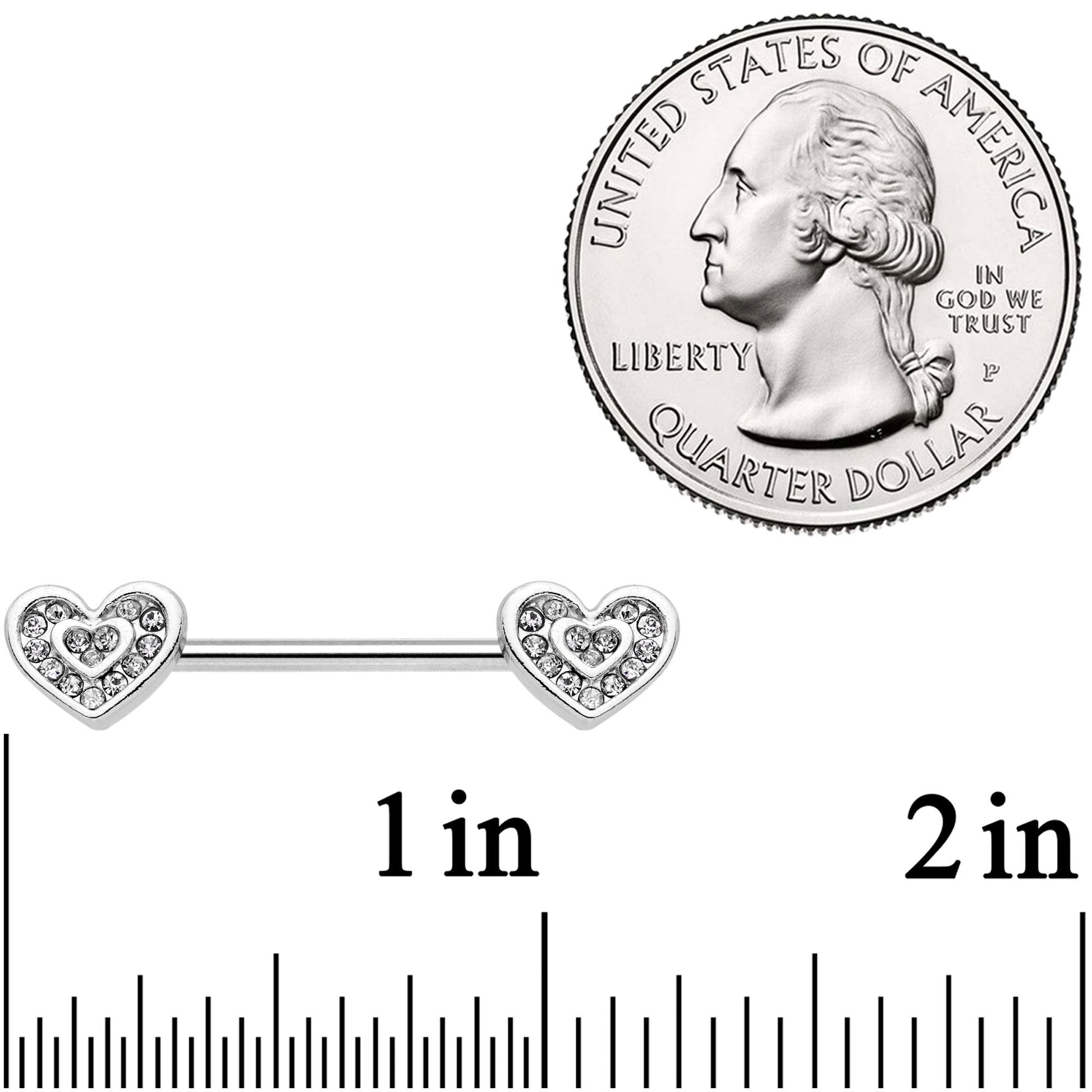 The only thing better than one heart is two! These 14 gauge barbells are tipped with a heart that is set with multiple clear gems, plus ANOTHER heart that's filled with more clear gems. They are 16mm and made with durable 316L surgical grade stainless steel straight barbells, so they last as long as your love. When you have two hearts together, especially hearts that look this sexy, there's nothing you can't do! Sold as a set of two.Specifications