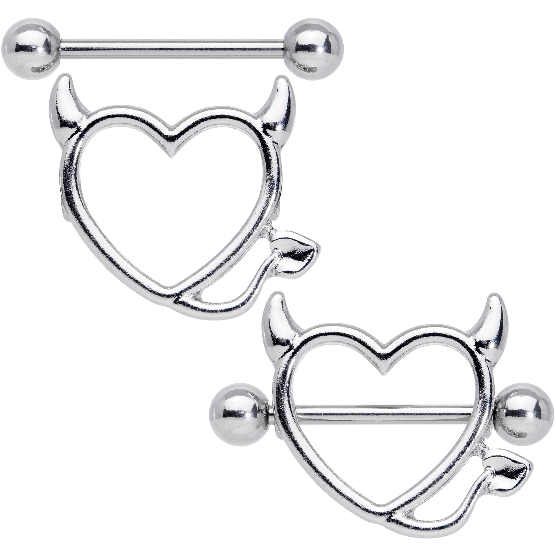 Be a little naughty...and love every minute with these 14 gauge nipple shields! They're made with 16mm durable 316L surgical grade stainless steel straight barbells with 5mm ball ends. The shield portion features a hollow heart shape with tiny horns and a pointed tail - perfect for showing off your devilish side! When worn with the shields, the barbells have a wearable length of 9/16" for a secure fit and the shields feature a 3/8" rise to give you the look you crave. So be a little evil....your nipple piercings will love you for it! Sold as a set of two.Specifications