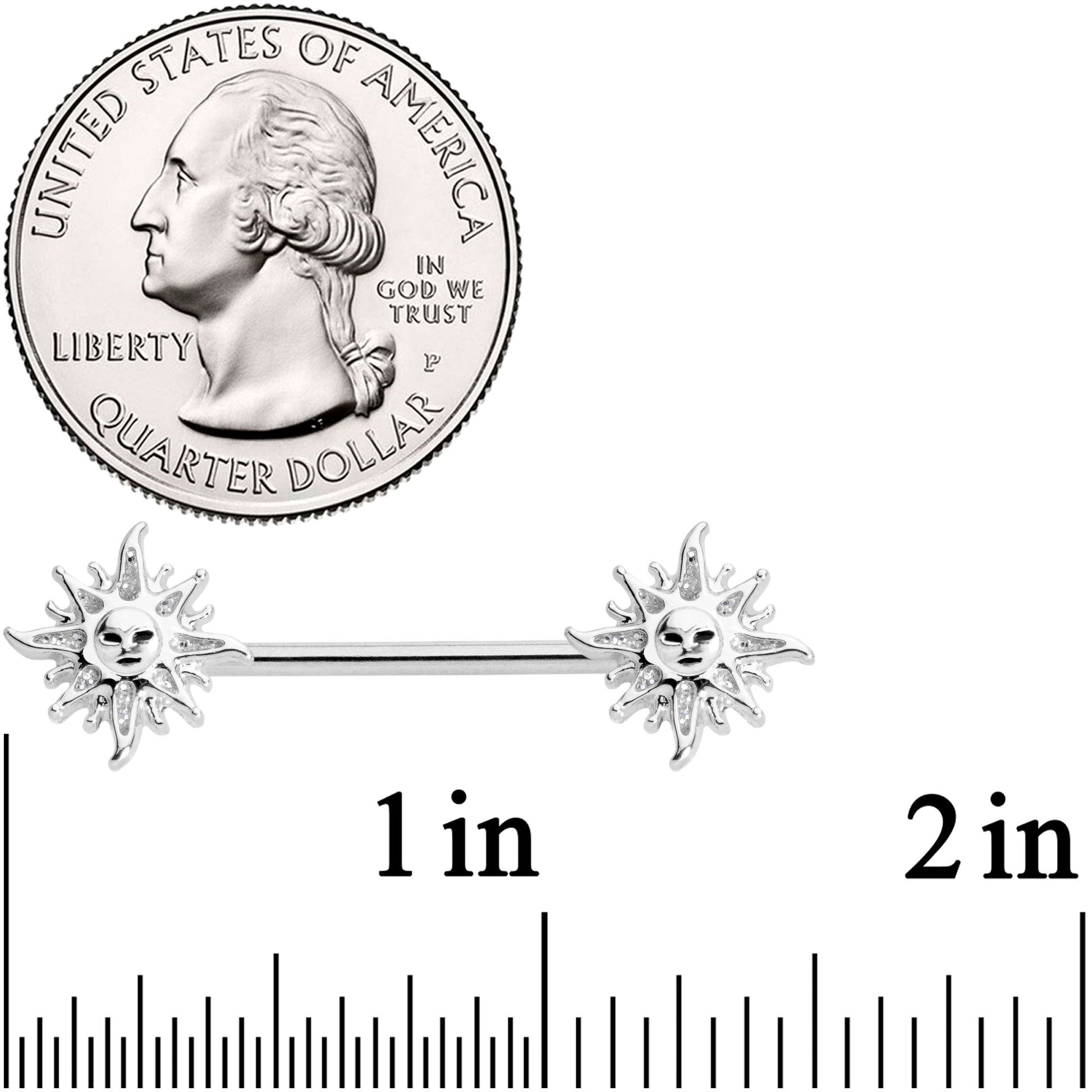 Ever wish you could spend every moment enjoying the sun? Now you really can with these 14 gauge straight barbells. They're 16mm in length and made of durable 316L surgical grade stainless steel straight barbells. Each barbell is capped with detailed suns which are inlaid with glitter, making you and your jewelry as impossible to ignore as the real sun itself. Sold as a set of two.Specifications