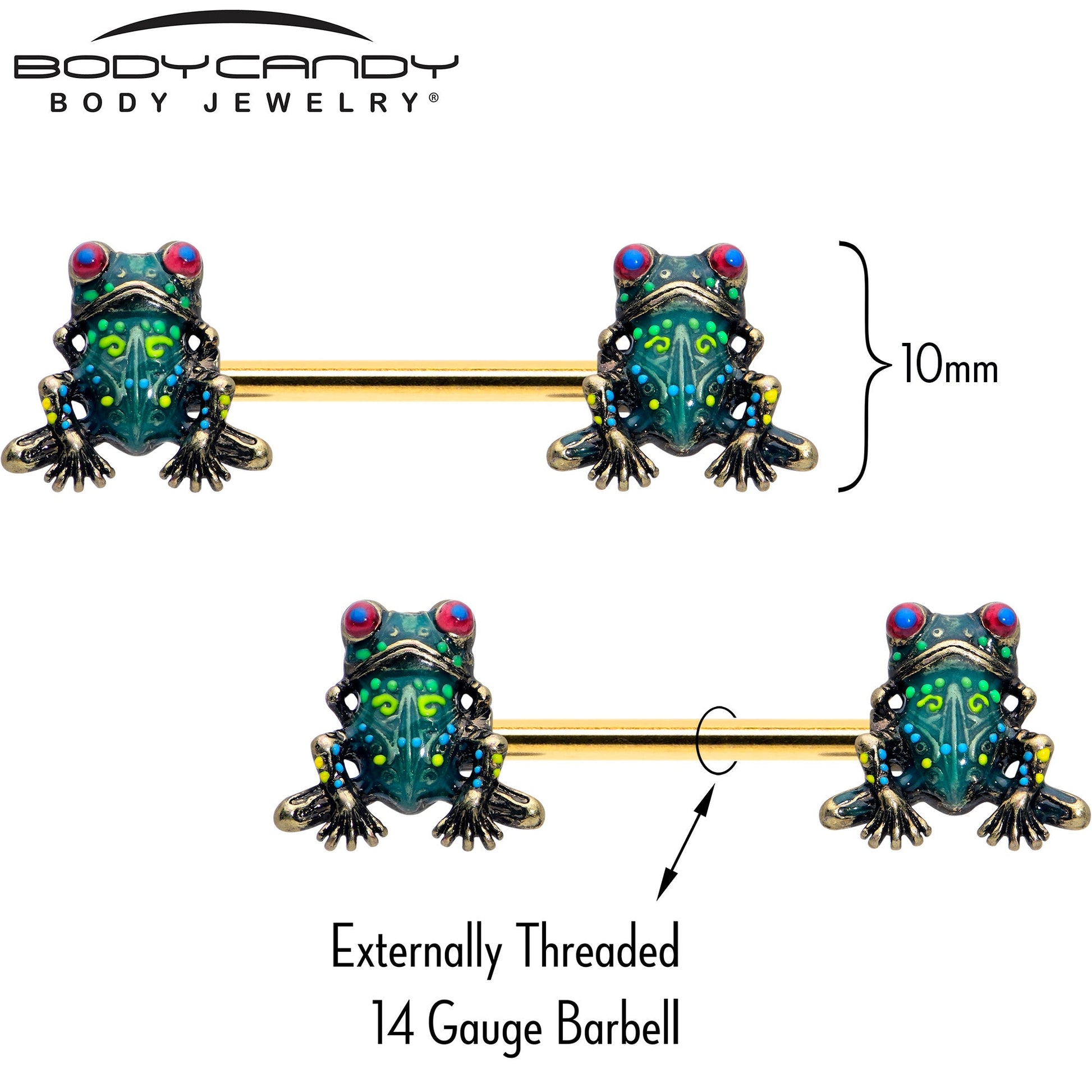 This 14 gauge nipple jewelry features some fabulous looking frogs. It's made with 16mm gold tone anodized over 316L surgical grade stainless steel straight barbells. Each of the ends features a tree frog charm. The frogs are inlaid in multiple colors and wild patterns and even feature red and blue eyes for epic color contrast. If you can't be out in nature, you can express your love for its creatures with these fantastic frog nipple piercing rings. Sold as a set of two.Specifications