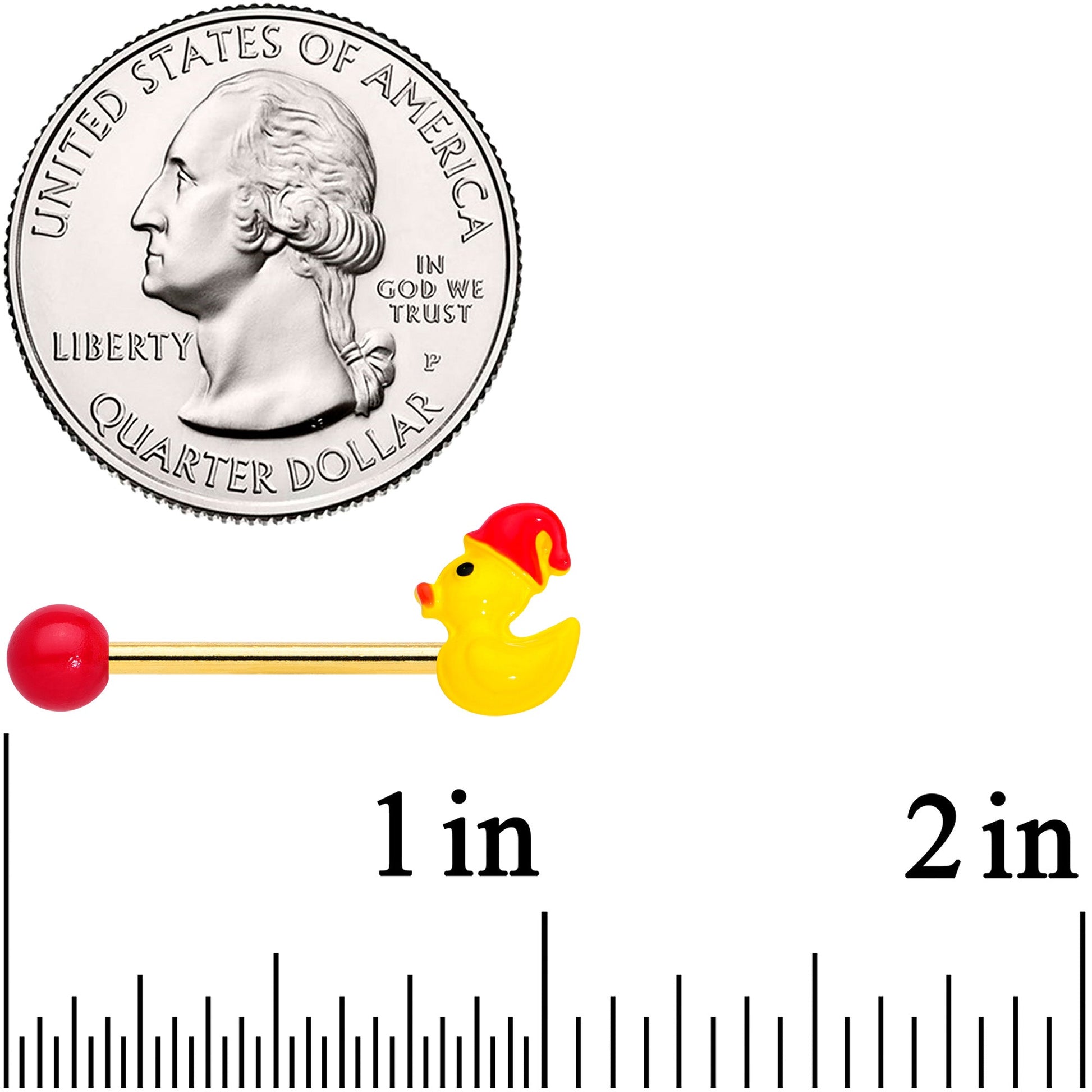 Someone's ready to head to bed on this 14 gauge nipple jewelry! It's made with 16mm gold tone PVD over 316L surgical grade stainless steel straight barbells. One end features an adorable yellow duck charm sporting a jaunty red nightcap. The other end features a 5mm red ball end for a look that is simple, striking, and cohesive. Give your nipple piercings a sweetly dreamy look with these darling ducky nipple rings! Sold as a set of two.Specifications