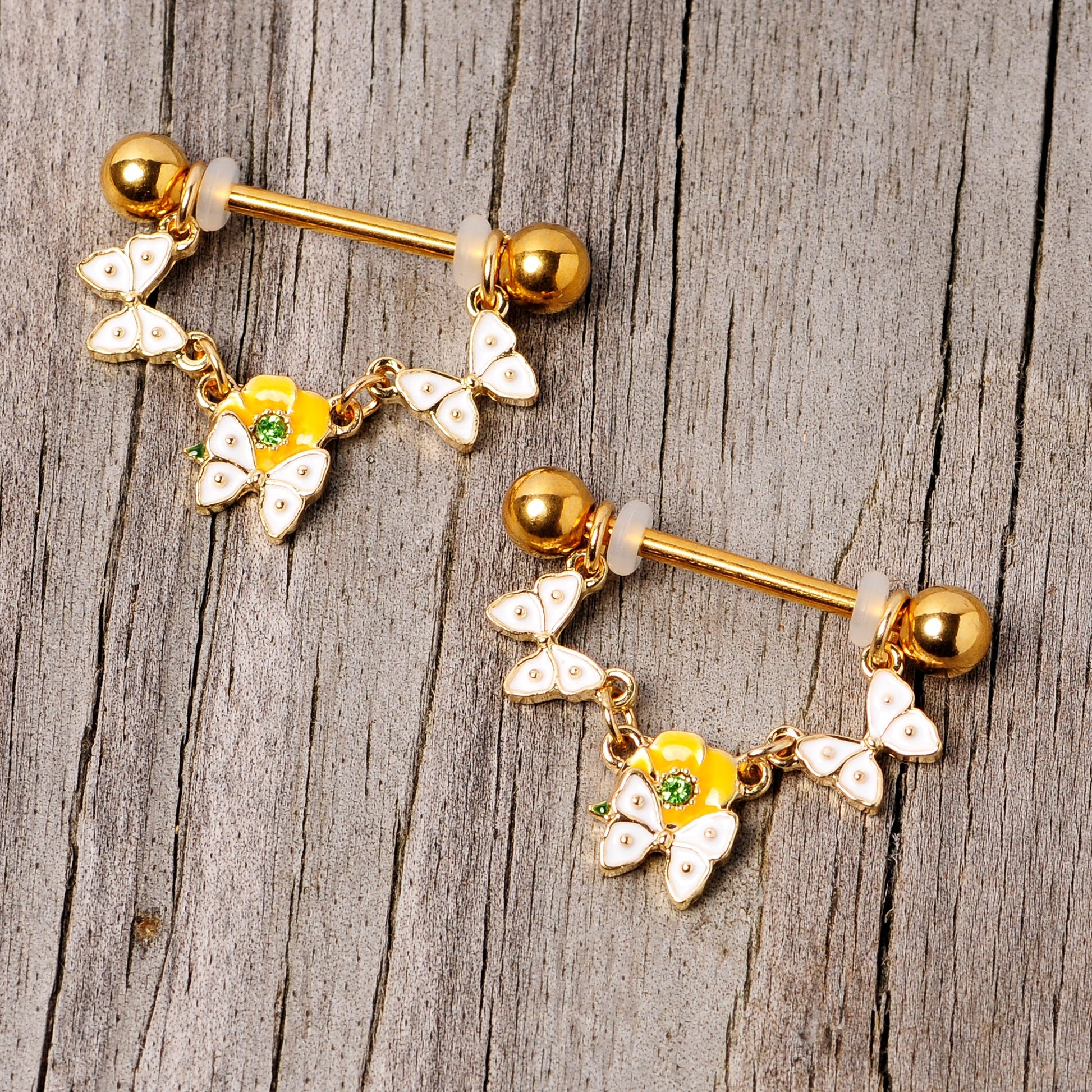 These beautiful butterflies just want to take a breather while hanging from your nipple piercings with this 14 gauge nipple jewelry! It's made with 16mm gold tone PVD over 316L surgical grade stainless steel straight barbells with 5mm ball ends. It features a dangling garland of three white butterfly charms and perched over the center is a yellow flower charm featuring a green gem at the center. This is a look that will have you feeling like springtime all year long! Sold as a set of two.Specifications