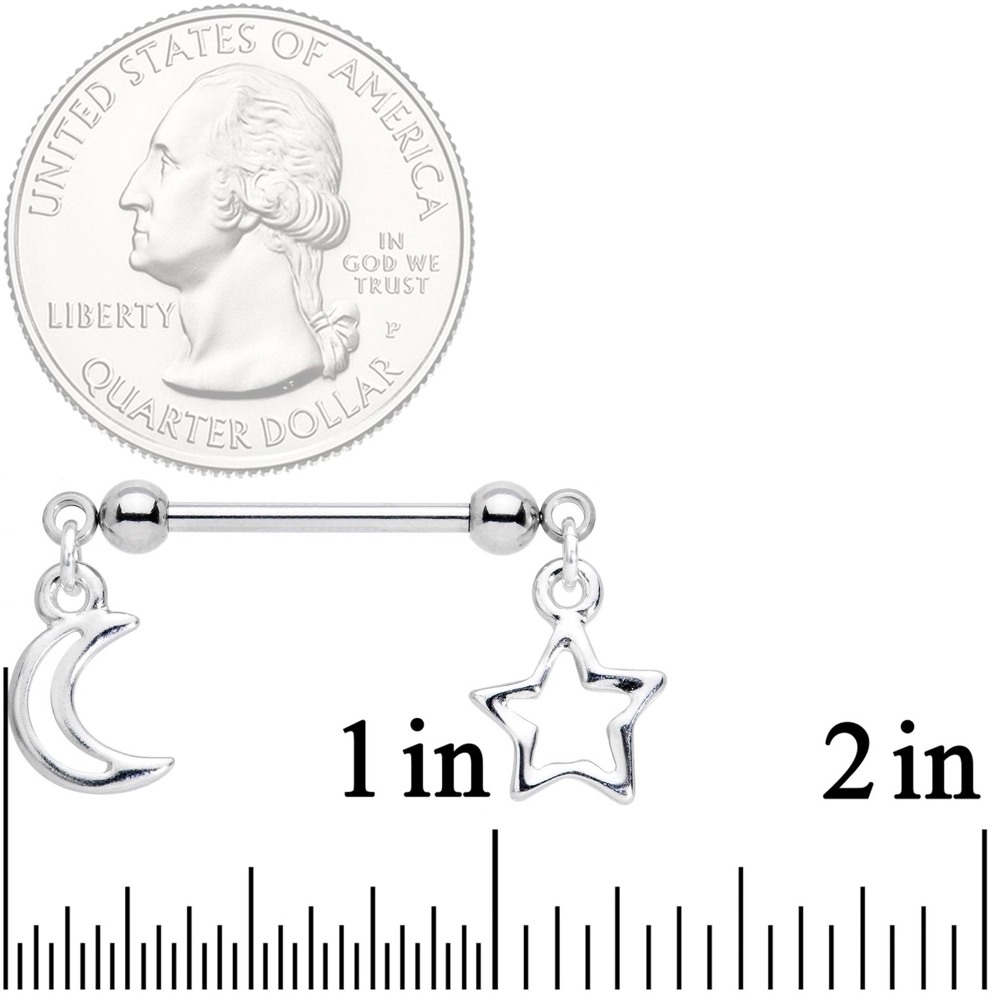The moon and stars have fallen from the sky to make your piercings the most heavenly things around! The 14 gauge nipple piercings are made with 16mm durable 316L surgical grade stainless steel straight barbells. Each one features a crescent moon dangle with an open center for a look that is streamlined and elegant. They are complemented on the opposite end by an open-centered star for a look that is a bit quirky yet still cohesive. Be a star with this beautifully cosmic nipple jewelry. They're handcrafted in the USA! Sold as a set of two.Specifications