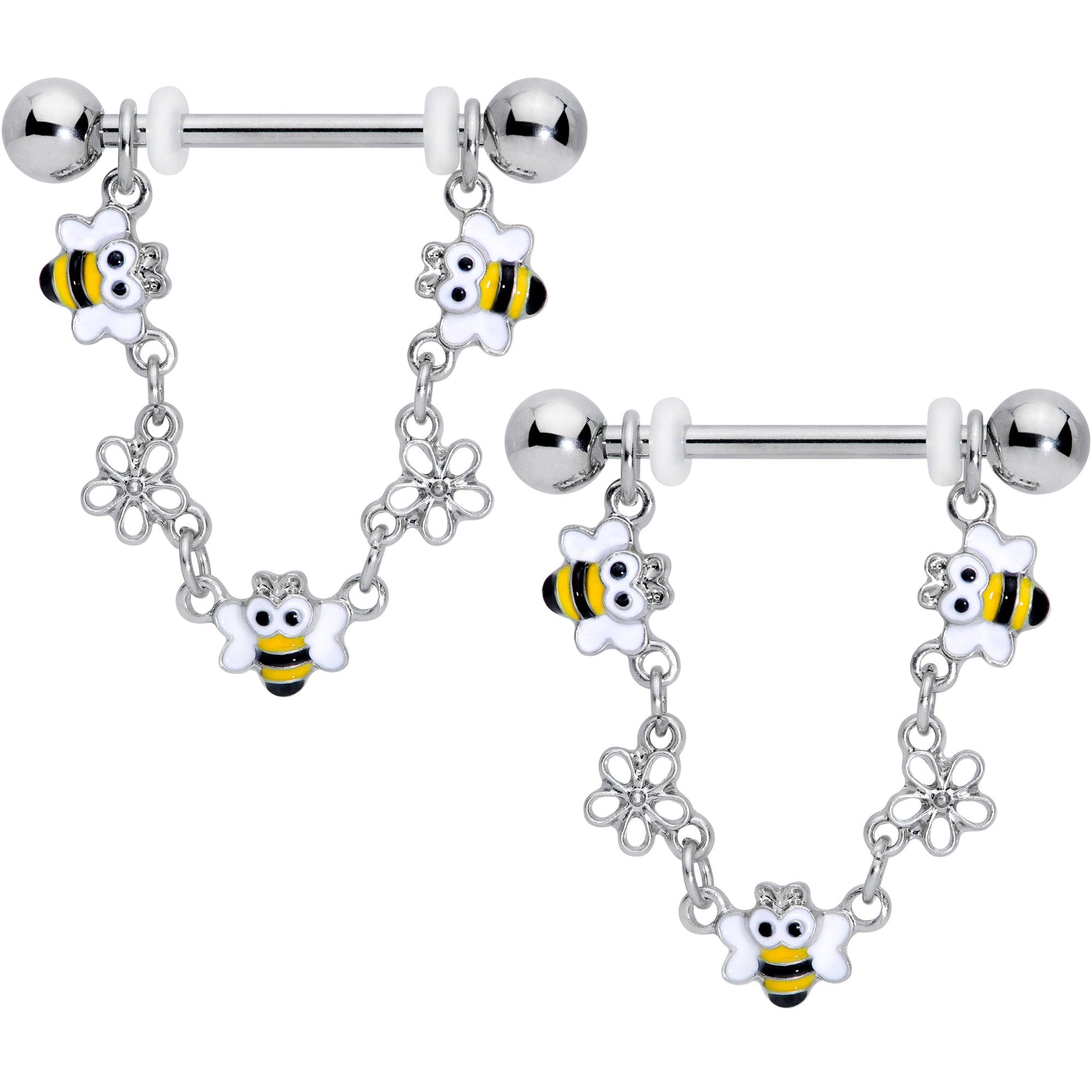 If sexy, springtime-themed nipple jewelry gives you a buzz, you'll love these 14 gauge nipple rings! They're made with 16mm durable 316L surgical grade stainless steel straight barbells with 5mm ball ends. They feature dangling loops composed of alternating bee and flower charms. The flowers are simple, looping flowers with a 1960s feel while the bees are inlaid in black and yellow with white wings and wide white eyes that give them a sweetly surprised expression. The loops can also be adjusted along the length of the barbells to give you the look you want. This springtime nipple piercing jewelry is sweet as honey! Sold as a set of two.Specifications