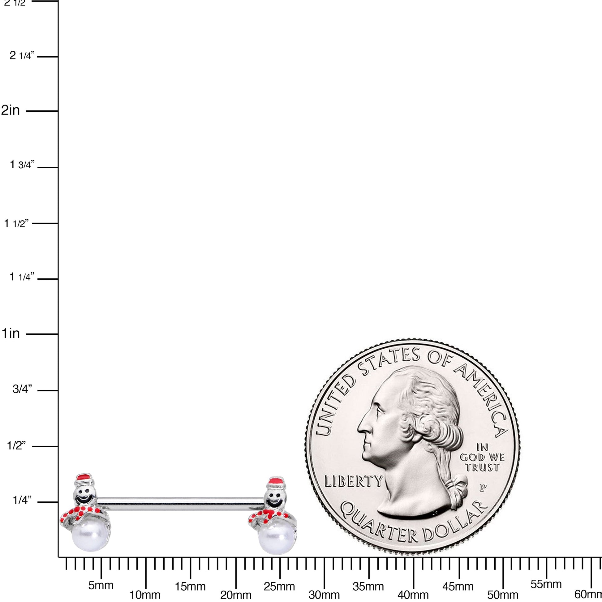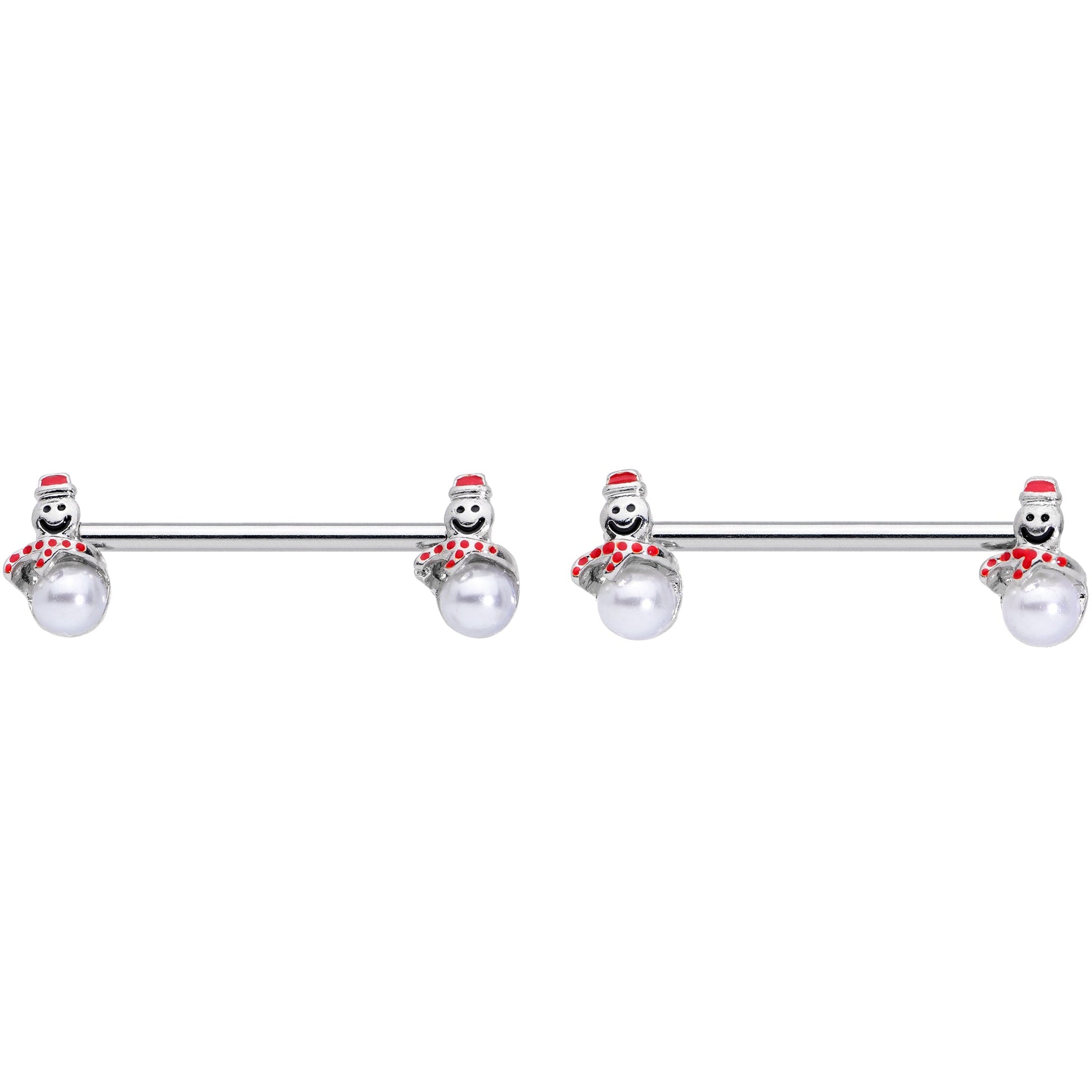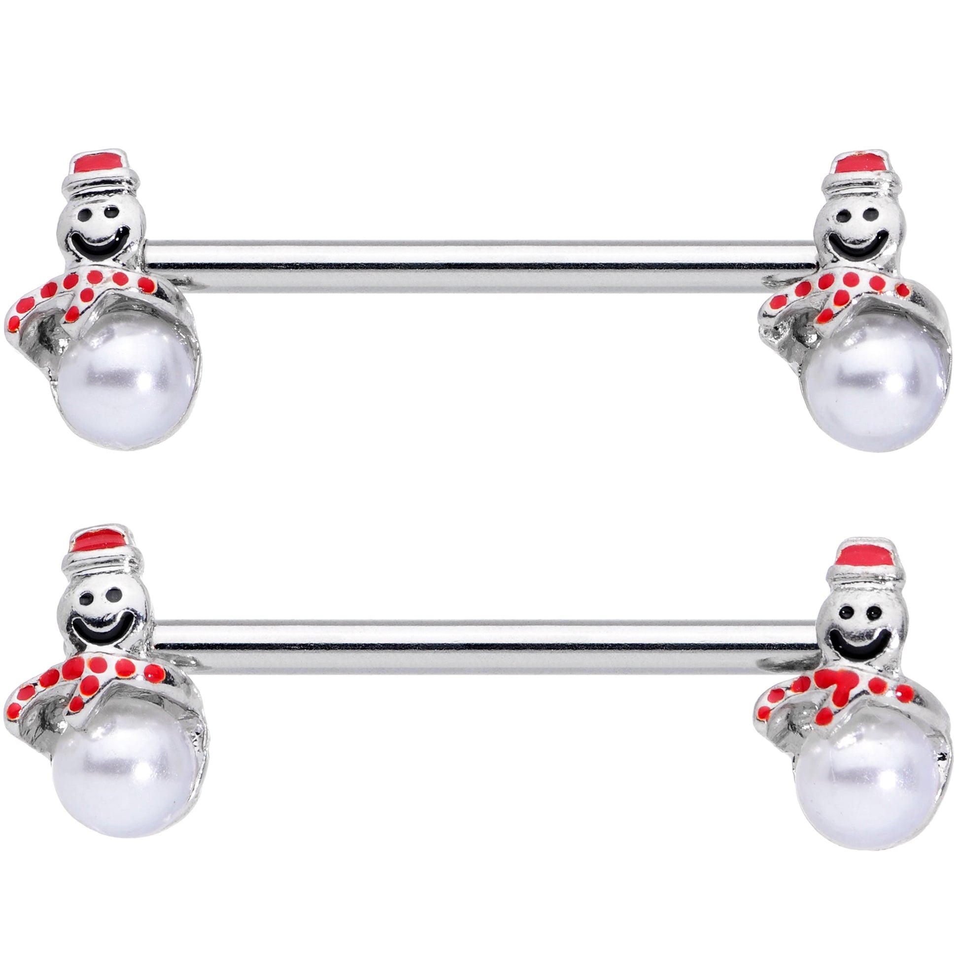 When the weather's frosty, this 14 gauge nipple jewelry is sure to warm your heart! It's made with 16mm durable 316L surgical grade stainless steel straight barbells. Each of the ends features a snowman charm made of a white pearlescent orb and red hat and scarf, and is wearing a big cheerful smile. These happy souls are sure to bring charm and cheer to your nipple piercings this winter! Sold as a set of two.Specifications