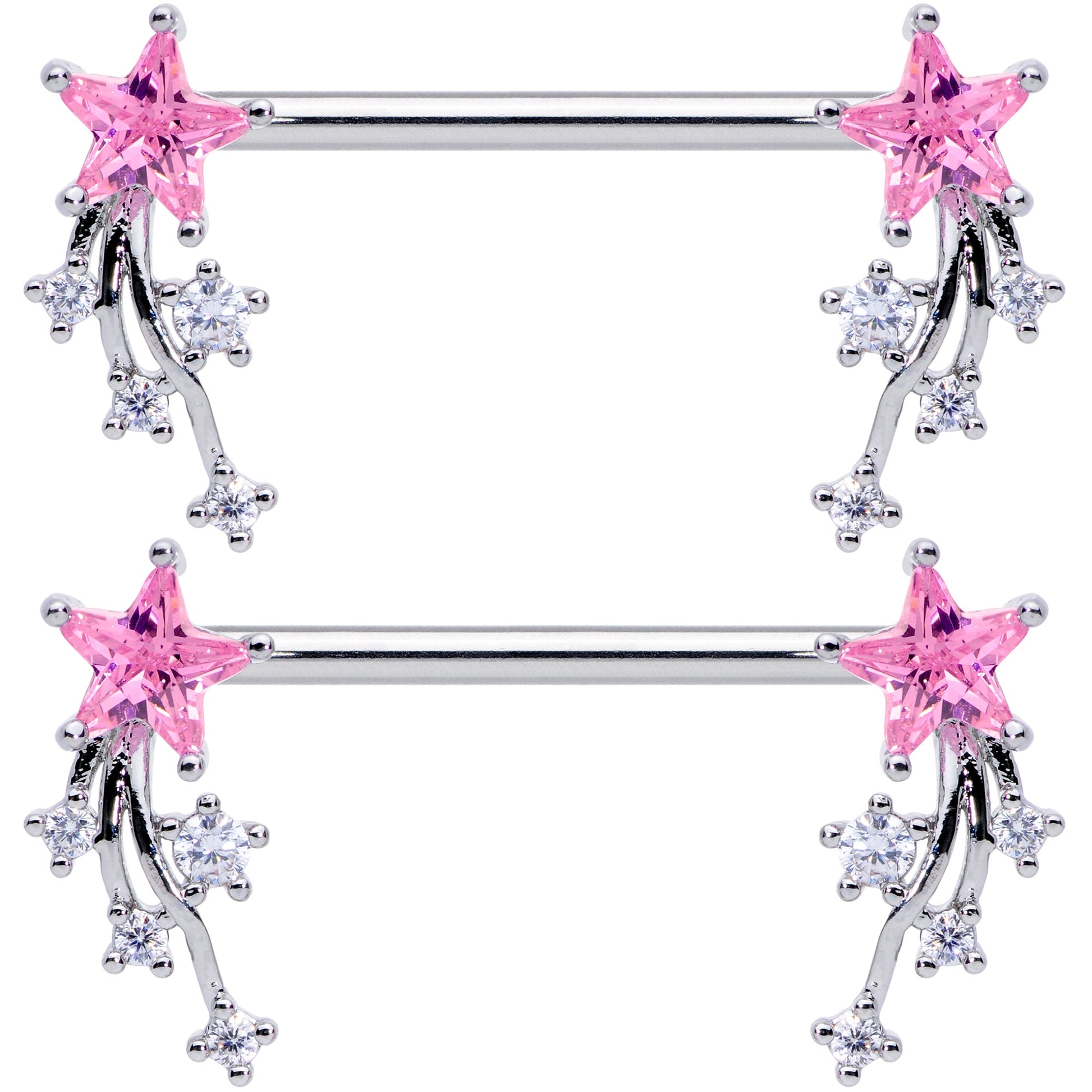 Take your nipple piercings to cosmic heights with this 14 gauge nipple jewelry! It's made with 16mm durable 316L surgical grade stainless steel straight barbells. The ends each feature a cluster of stars charm composed of a large pink cubic zirconia gem and smaller clear cubic zirconia gems. The smaller stars trail out behind each other, as if they were shooting through the cosmos leaving trails across the sky. And the same way the sight of a falling star gives us a renewed appreciation of the vastness of our universe, these stunning starry nipple rings are sure to give you a renewed appreciation of your nipple piercings! Sold as a set of two.Specifications
