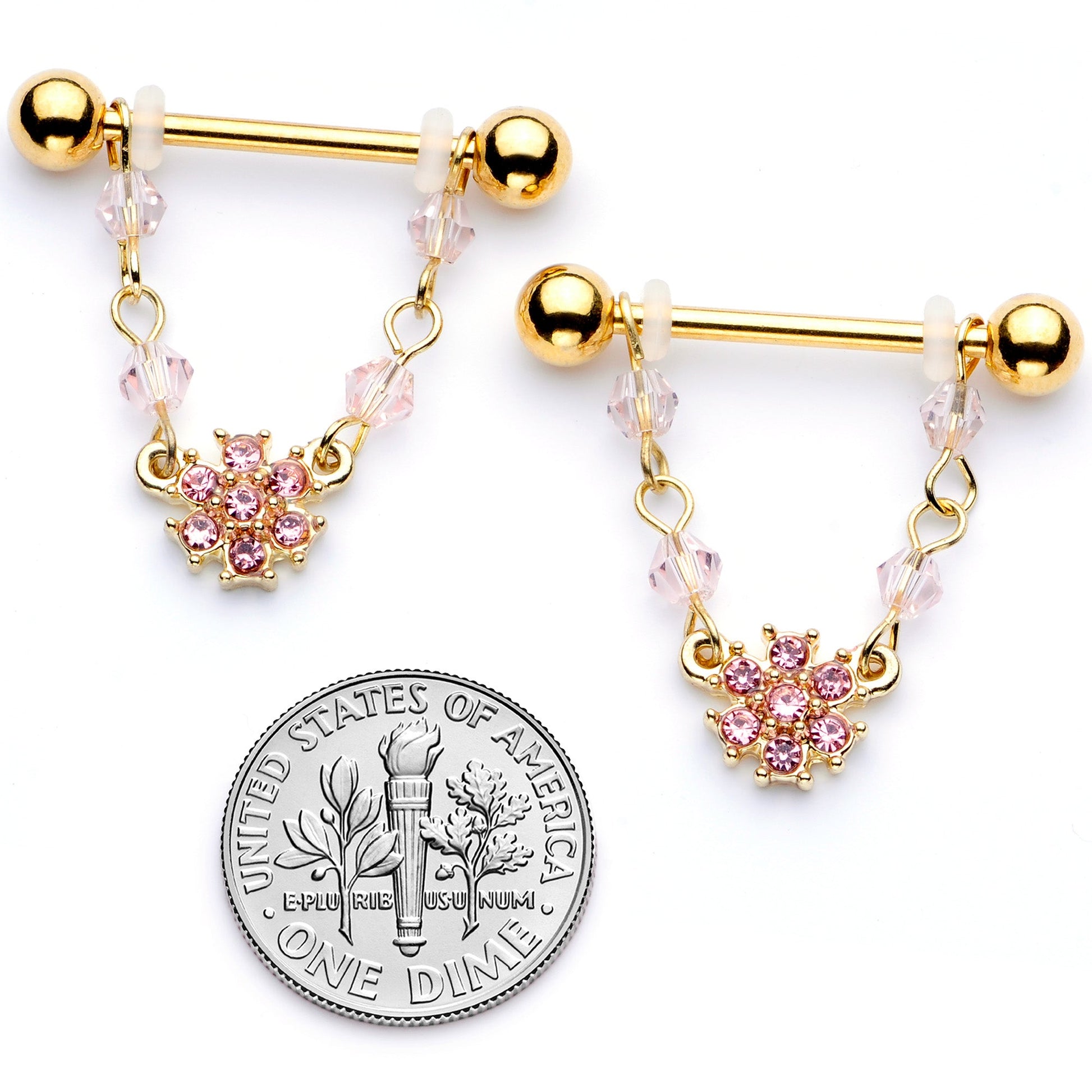 What could be sweeter than this dainty 14 gauge flower-themed nipple jewelry? It's made with 16mm gold tone plated over 316L surgical grade stainless steel straight barbells with 5mm ball ends. It features a dangling chain embellished with two pairs of palest pink gems. At the center of the chain is a petite flower charm set with darker pink gems that add color contrast and visual impact. Best of all, you can slide the chain up and down the length of the barbell so you get just the look you're after. Let these fetching flowers add some precious pink to your piercings with these beautiful floral nipple rings. Sold as a set of two.Specifications