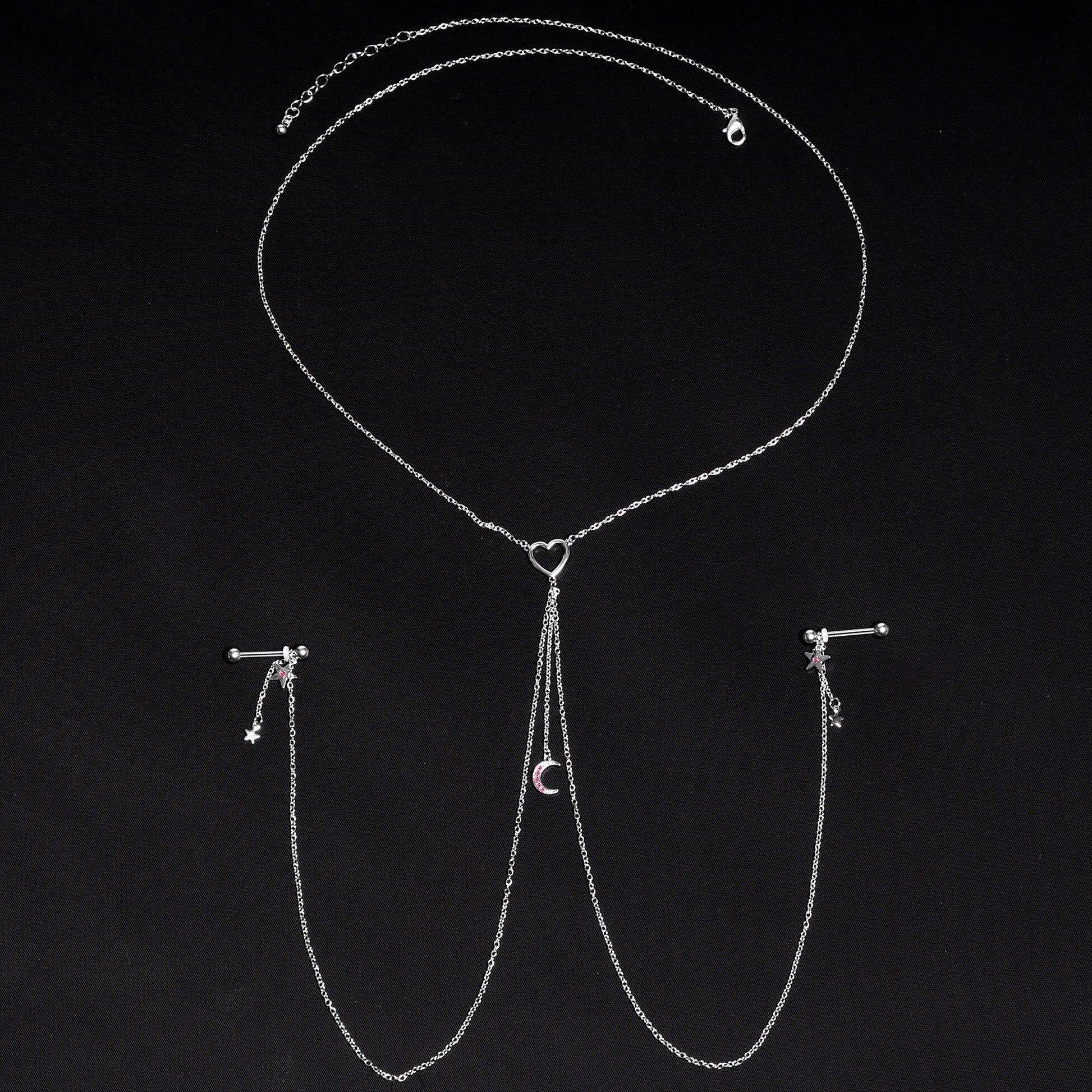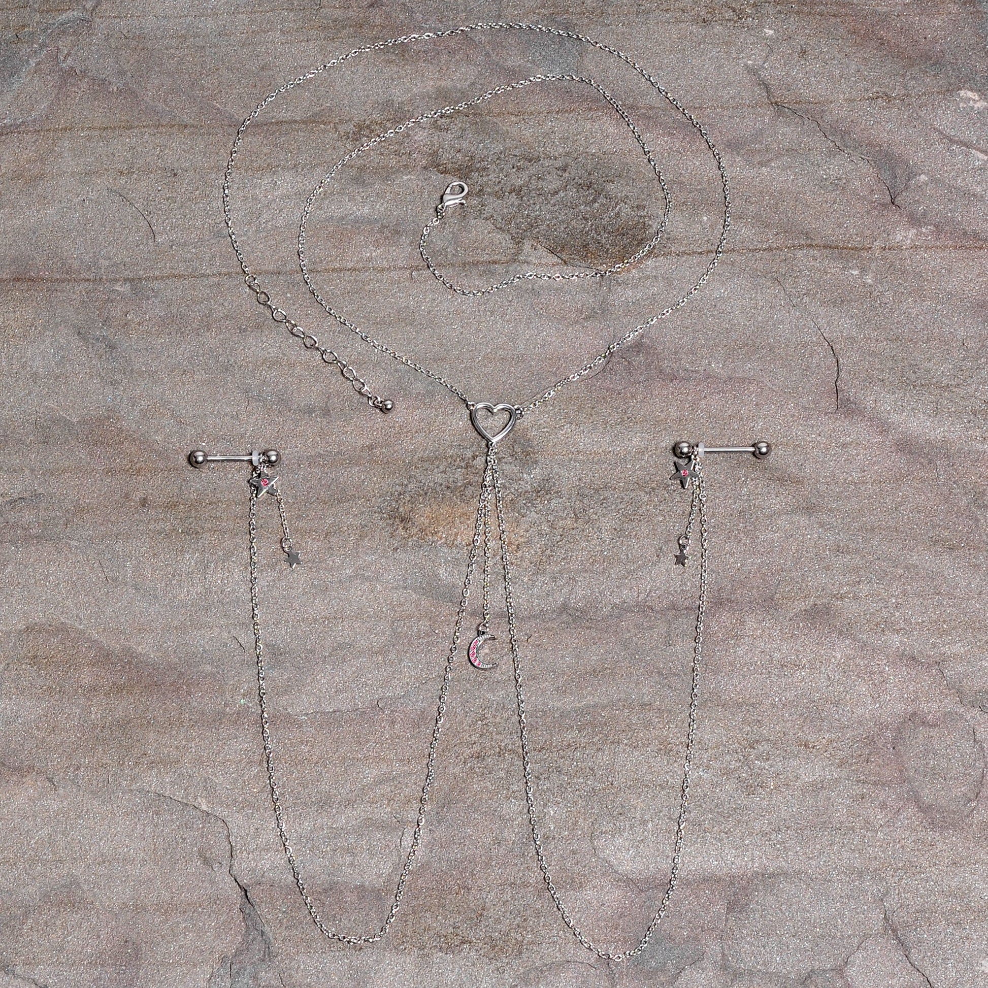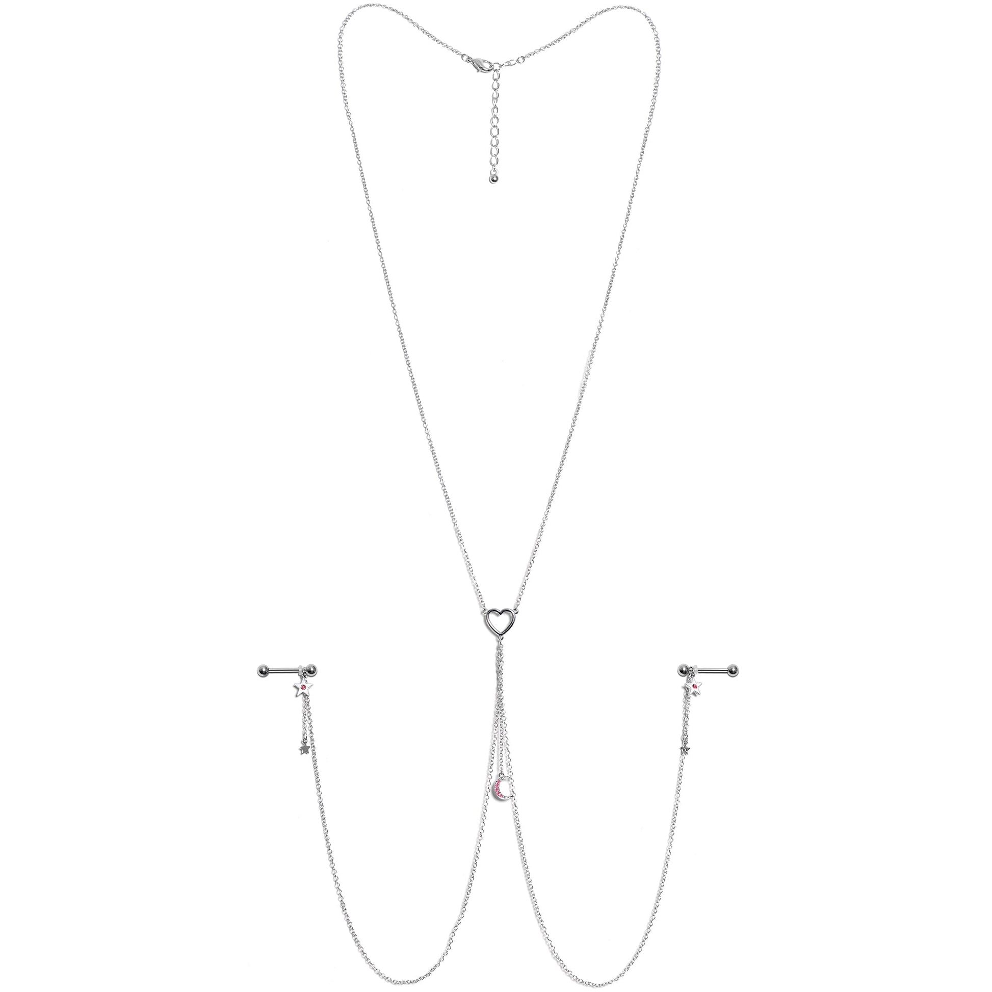 You're going to love this nipple chain necklace to the stars and back! It features a 14" maximum necklace that has an openwork heart at the center. The heart has three lengths of matching chain dangling from it. The center one is 2" in length and supports gorgeous crescent moon charm that's set with pink gems. The other two chains are 12" and connect to the 16mm durable 316L surgical grade stainless steel straight barbells with 5mm ball ends. Dangling from the barbells are star charms with pink gems set at the center and tiny unadorned star charms than dangle from a 1" length of chain. With this stunning necklace nipple chain, your piercings are sure to be stars!Specifications