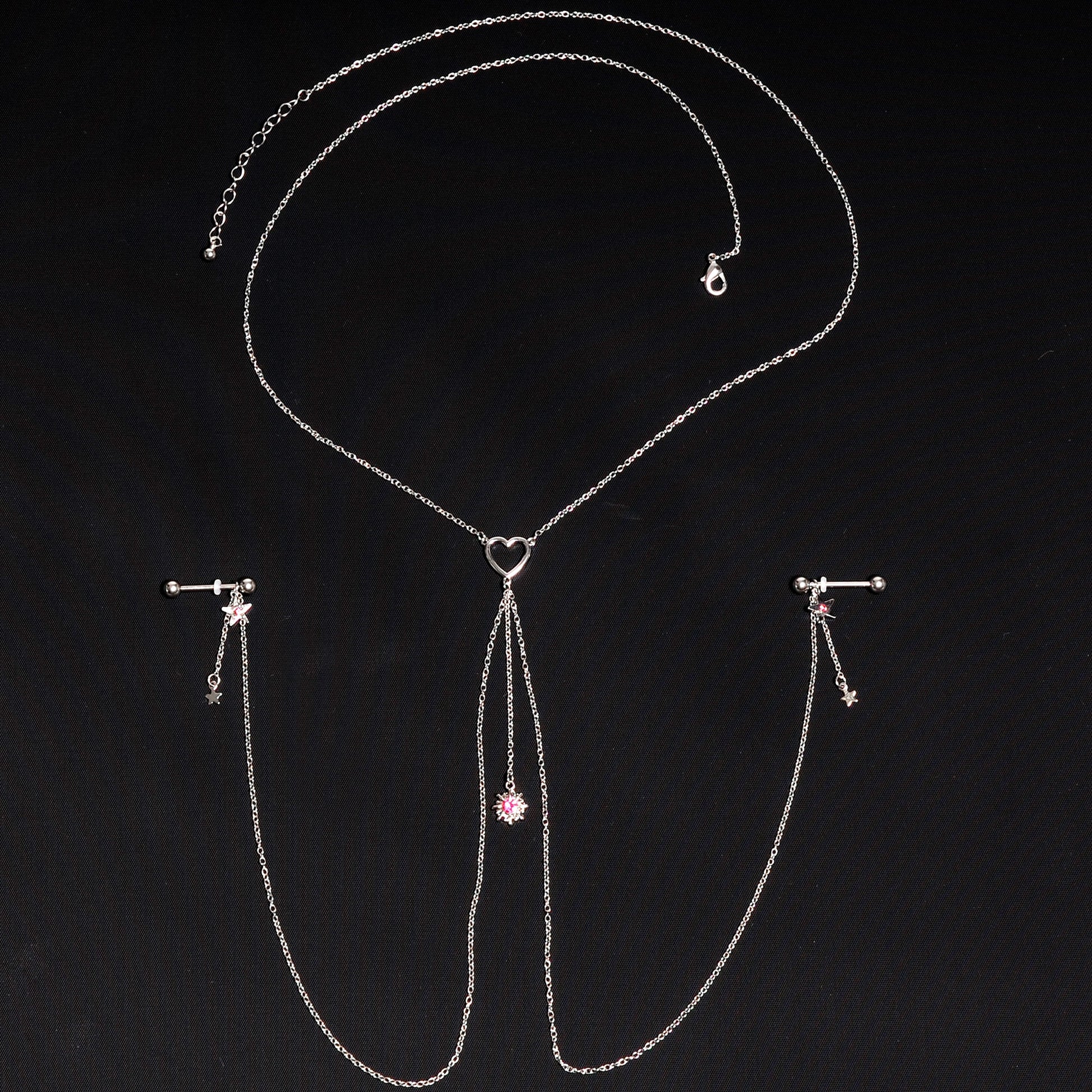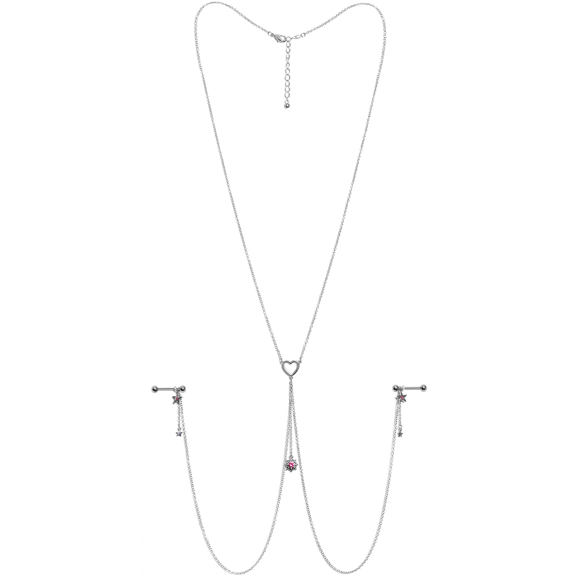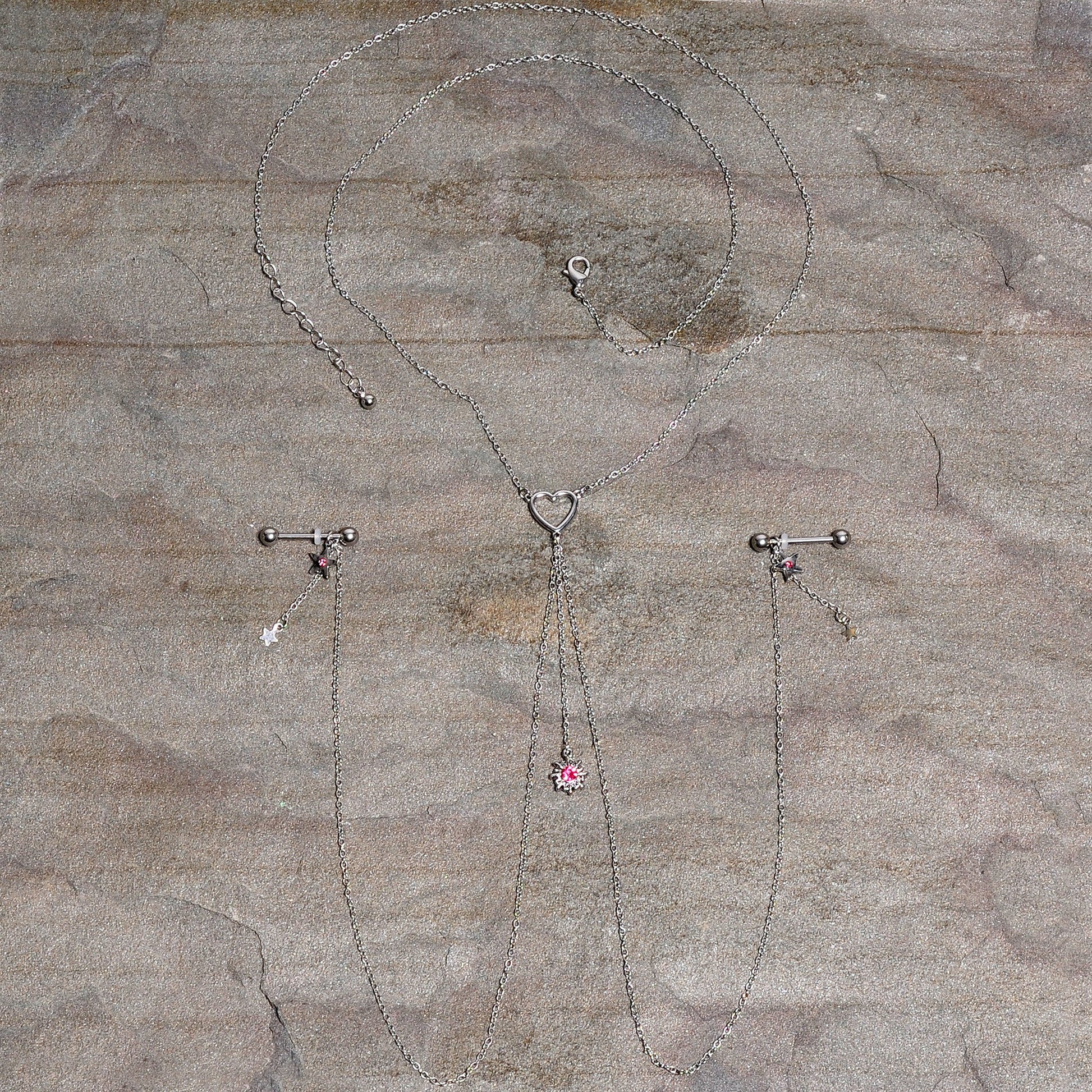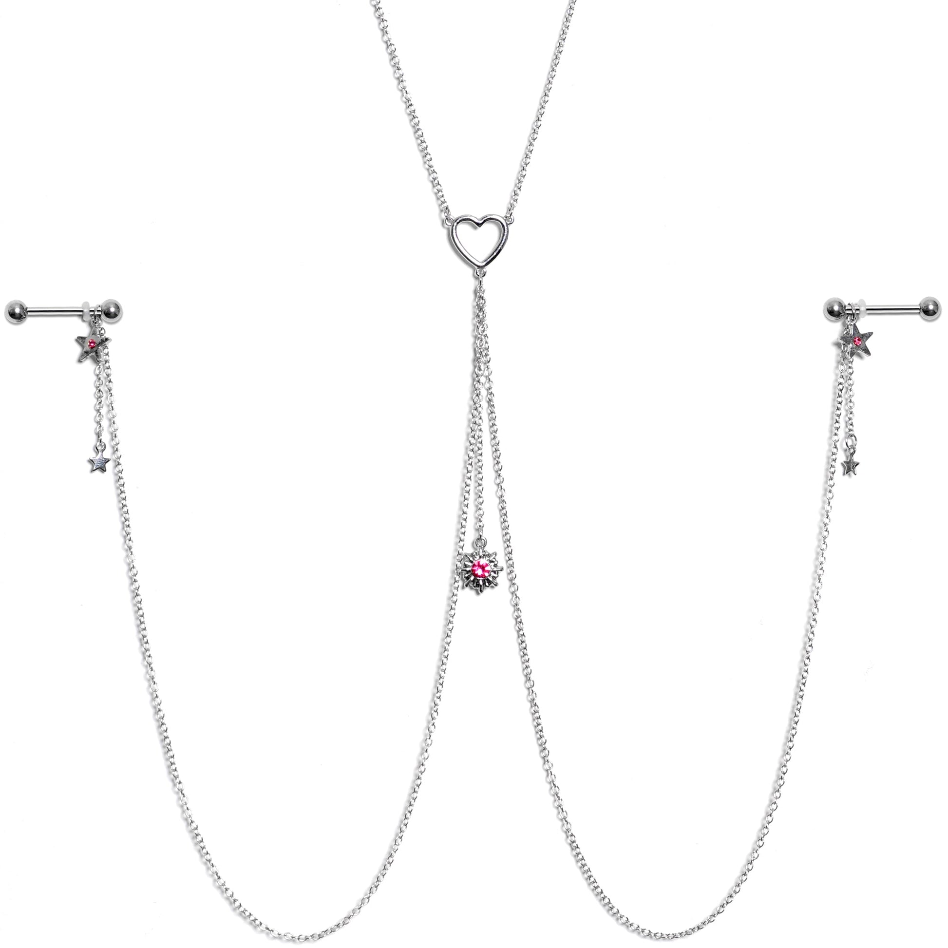 You're going to love this necklace to nipple chain to the stars and back! It features a 14" length necklace that has an openwork heart charm at the center. The heart has three lengths of matching chain dangling from it. The center one is 2" in length and supports gorgeous sun charm that's set with a pink gem in the center. The other two chains are 12" and connect to the 16mm durable 316L surgical grade stainless steel straight barbells with 5mm ball ends. Dangling from the barbells are star charms with pink gems and tiny unadorned stars than dangle from 1" lengths of chain. With this stunning necklace nipple chain, your pierced nipples are sure to be stars!Specifications