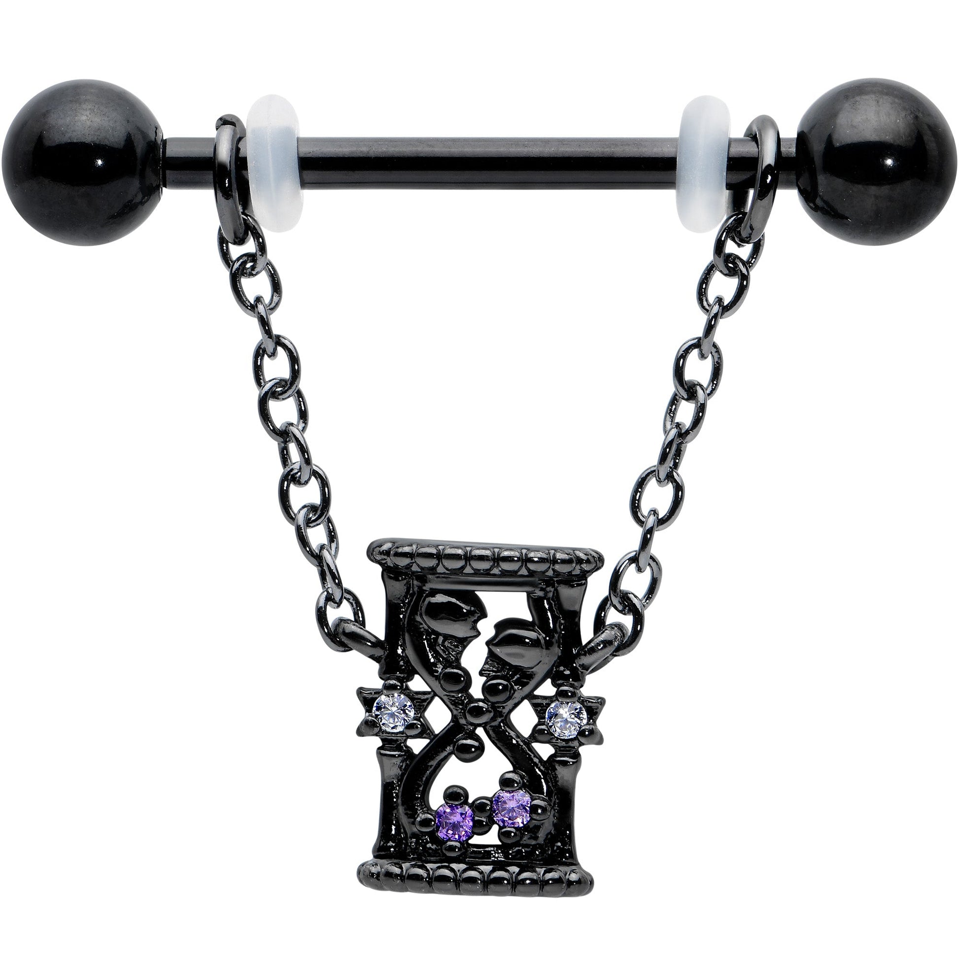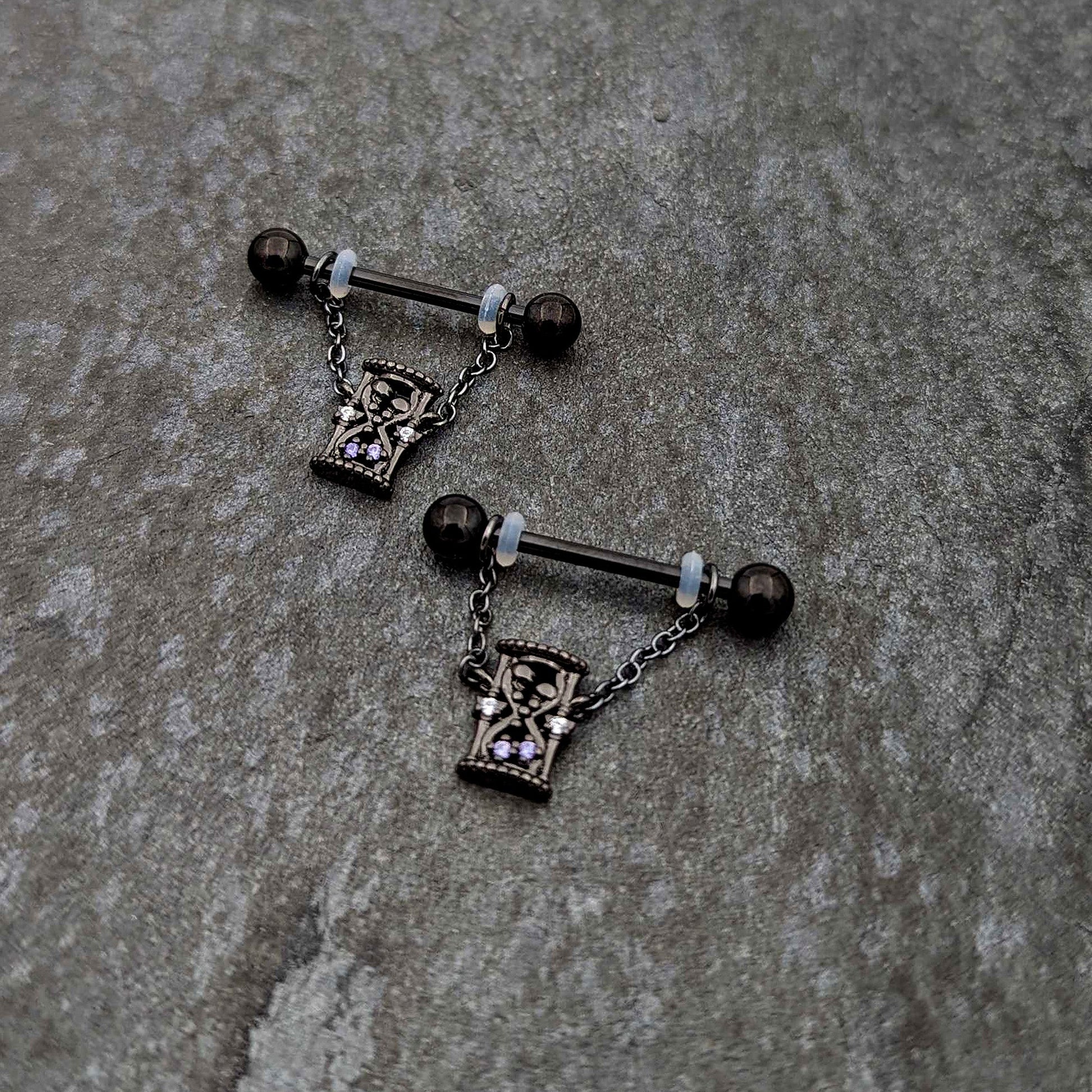 It's time....to add some dark elegance to your look with this 14 gauge nipple jewelry! It's made with 16mm wearable length black PVD over 316L surgical grade stainless steel straight barbells with 5mm ball ends. Each of the barbells features a dangling length of black chain that supports an hourglass charm, with purple gems for the sand. They're embellished with two halves of a broken heart, one on each side. The hourglasses are also embellished with a pair of stars with clear gem centers. You'll want these gothic beauties in your nipple piercings all the time! Sold as a set of two.Specifications