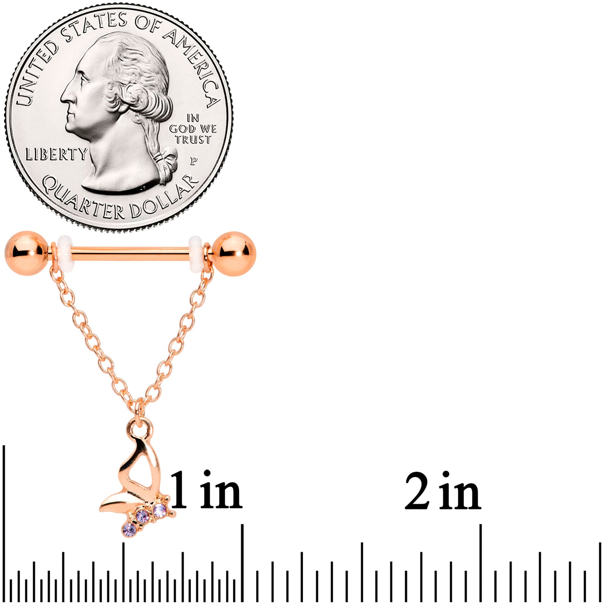 Transform your nipple piercings from blah to butterflies with this 14 gauge nipple jewelry! It's made with 16mm rose gold tone plated over 316L surgical grade stainless steel straight barbells with 5mm ball ends. A length of chain dangles from the barbells, supporting a butterfly charm with purple gems. Let your look take flight with these beautiful butterfly nipple rings! Sold as a set of two.Specifications