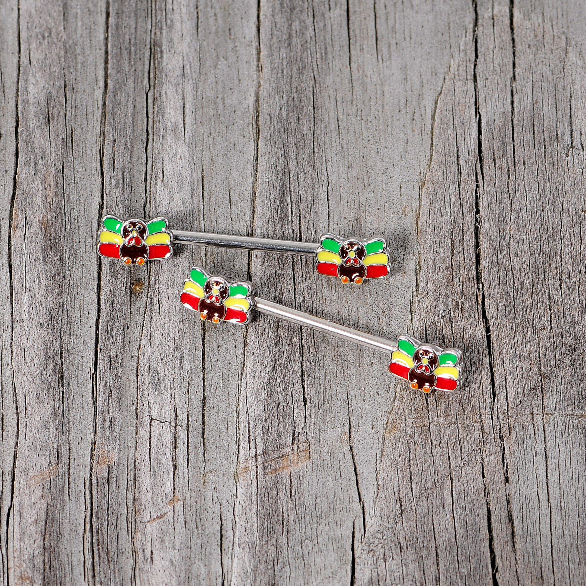 If you can't wait to celebrate Thanksgiving with ganja and turkey then you will love these 14 gauge nipple piercings! Made with 16mm durable 316L surgical grade stainless steel straight barbells, this nipple jewelry features Thanksgiving turkey charms with Rasta colored green, red and yellow wings that will have you saying "Happy Danksgiving" to every rude boy and girl you see. Sold as a set of two.Specifications