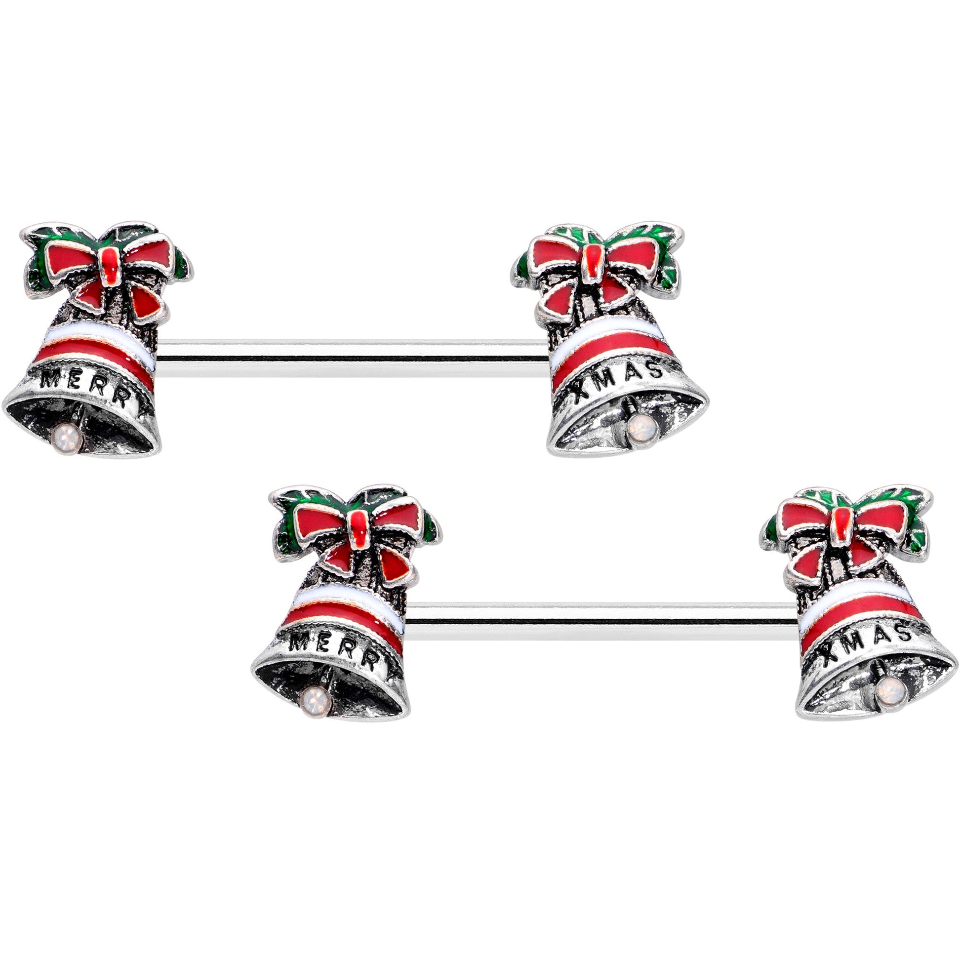 Why hang your stocking by the fire when you can hang bells from your piercings with this 14 gauge nipple jewelry? It's made with 16mm durable 316L surgical grade stainless steel barbells. Each of the ends features a Christmas bell charm, inlaid in green, red, and white stripes and embellished with a red inlaid bow at their top. Get your nipple piercings all ready for Santa with these Christmas-themed nipple rings! Sold as a set of two.Specifications