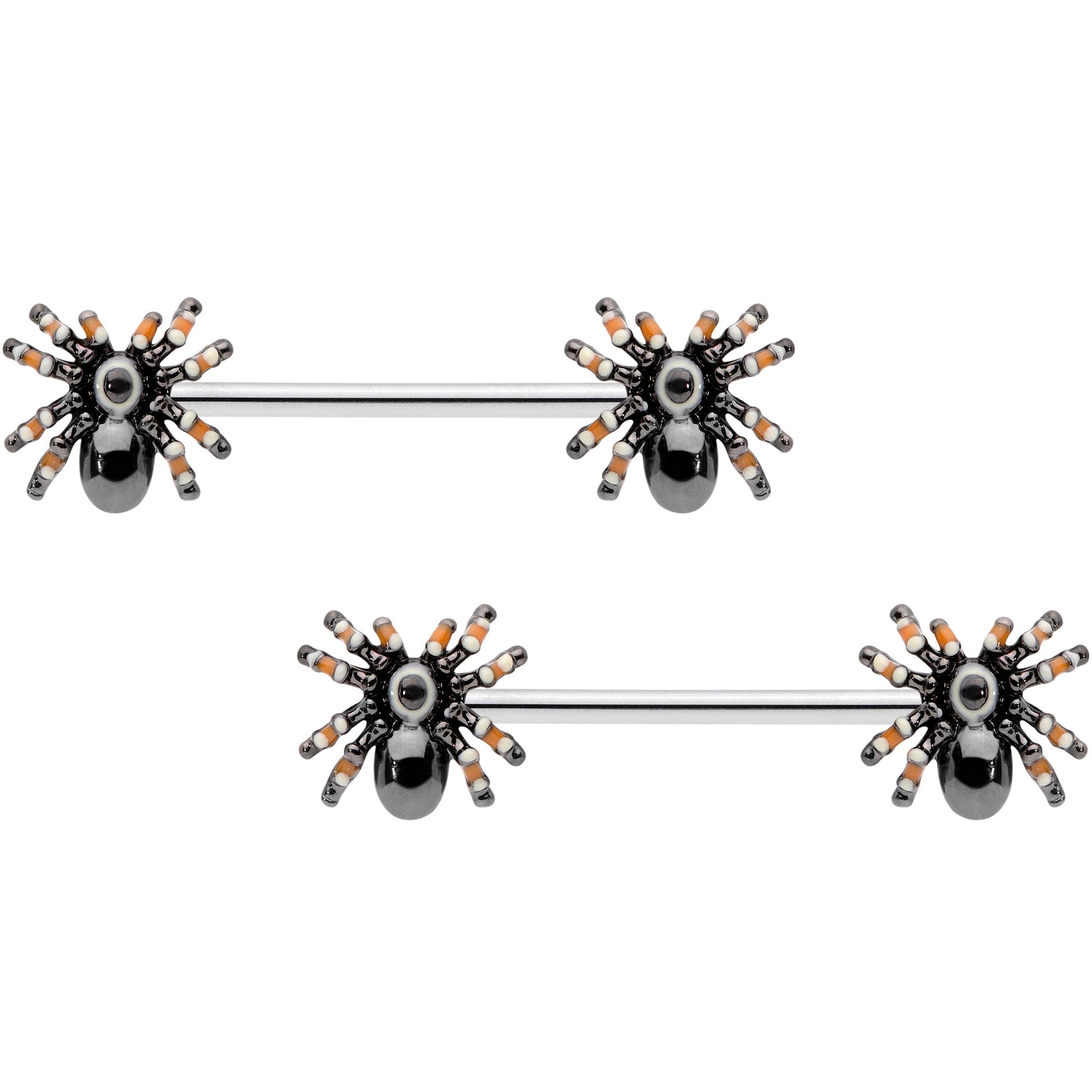 These eight-legged creepy-crawlies are ready to wriggle into your nipple piercings and make themselves at home on this 14 gauge jewelry! It's made with 16mm durable 316L surgical grade stainless steel straight barbells. Each end features arachnid spider charm ends, bedecked in sleek black with orange and white detailing for a realistic appearance. Whether you're smitten with spiders or just love Halloween, these tarantulas are going to spin a wonderful web of style in your nipple piercings! Sold as a set of two.Specifications