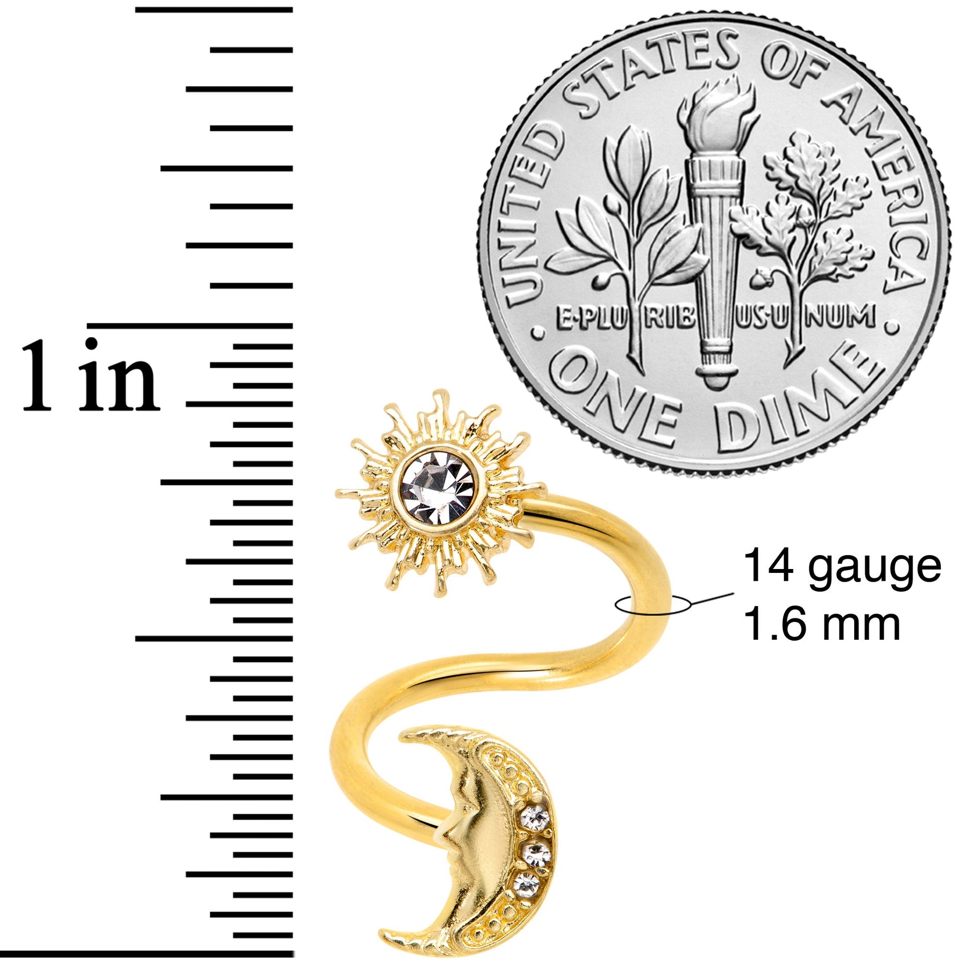Now the moon and stars can give a whole new twist to your piercings with this 14 gauge spiral twister ring! It's made with an 11mm gold tone plated over 316L surgical grade stainless steel spiral curved barbell. One end is a multi-pointed star charm with a clear gem. The other end is a crescent moon set with more clear gems. Even better, this style of body jewelry works well in multiple piercings including the lip, navel, and eyebrow as well as cartilage piercings like the helix and more. Let the world orbit around you when you're wearing this gorgeous celestial twister belly button ring!Specifications