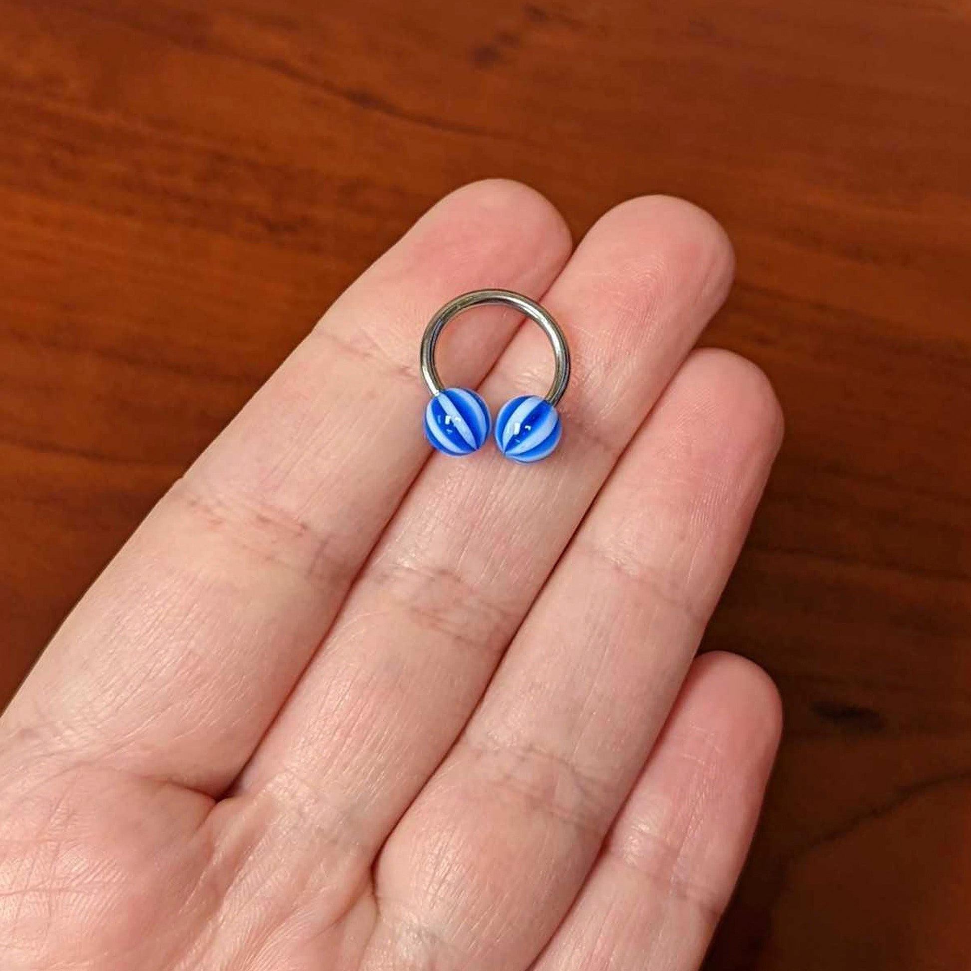 If you love for all of your basic body jewelry to have a touch of color we've got you covered with this 14 gauge horseshoe piercing. Made with an 11mm durable 316L surgical grade stainless steel circular barbell and features 6mm blue and white striped acrylic ball ends. You can rock this ring in multiple piercings including your stretched earlobes, septum, nipple, and some lip piercings. If this horseshoe jewelry is the right fit for you it will be a mighty addition to your body jewelry collection.Specifications