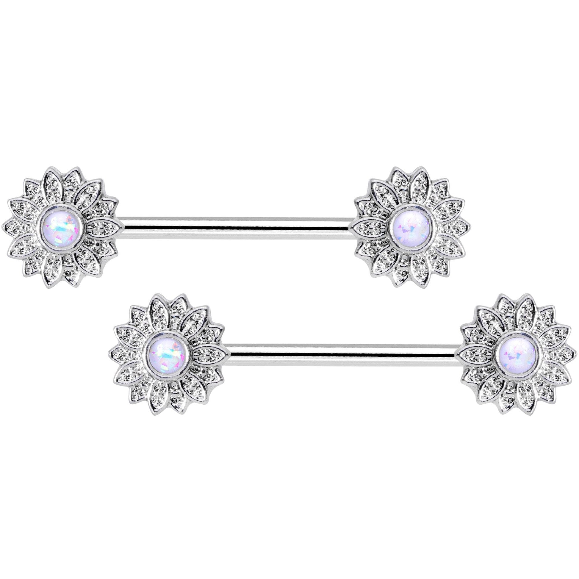 The days are getting longer so why not celebrate the sun with some sunflowers? This 14 gauge set of nipple jewelry includes a pair of 14mm durable 316L surgical grade stainless steel straight barbells. The ends are tiny sunflowers with a white faux opal set in their centers. You also get a pair of 12mm durable 316L surgical grade stainless steel circular barbells. These have 5mm ball ends, each set with a clear gem. Let the sun shine regardless of what the forecast holds with this comely set of nipple piercings! Sold as a set of four.Specifications