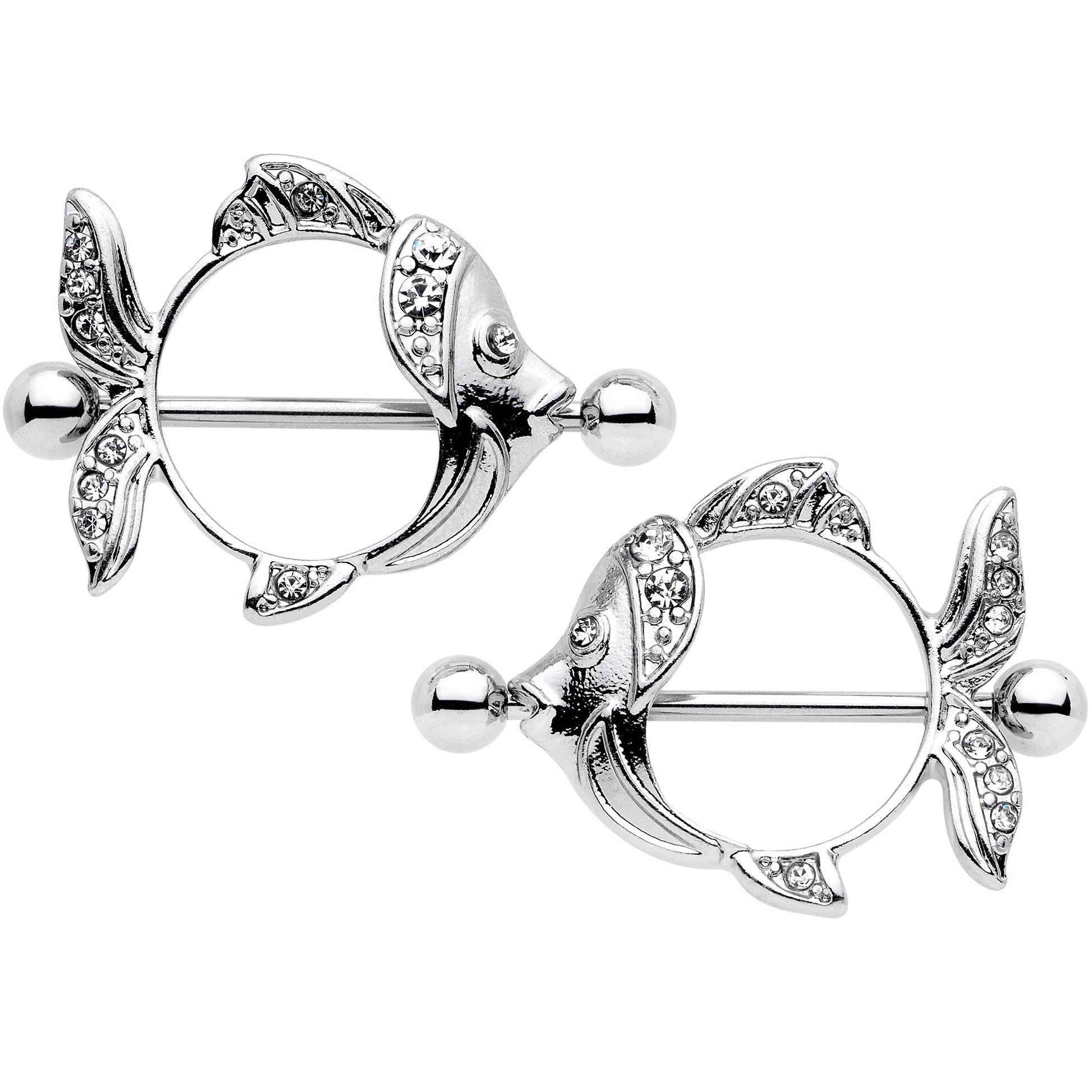 Enjoy the serenity of the ocean without having these lovely little swimmers float away! These elegantly crafted angelfish are 14 gauge lovelies are made with durable 316L surgical grade stainless steel straight barbells which measure at 14mm, The shields have a rise and width of 7mm each for that perfect fit. Now you can admire the beauty of nature's sealife from anywhere on earth, with our gorgeous angelfish nipple shield set. Sold as a set of two.Specifications