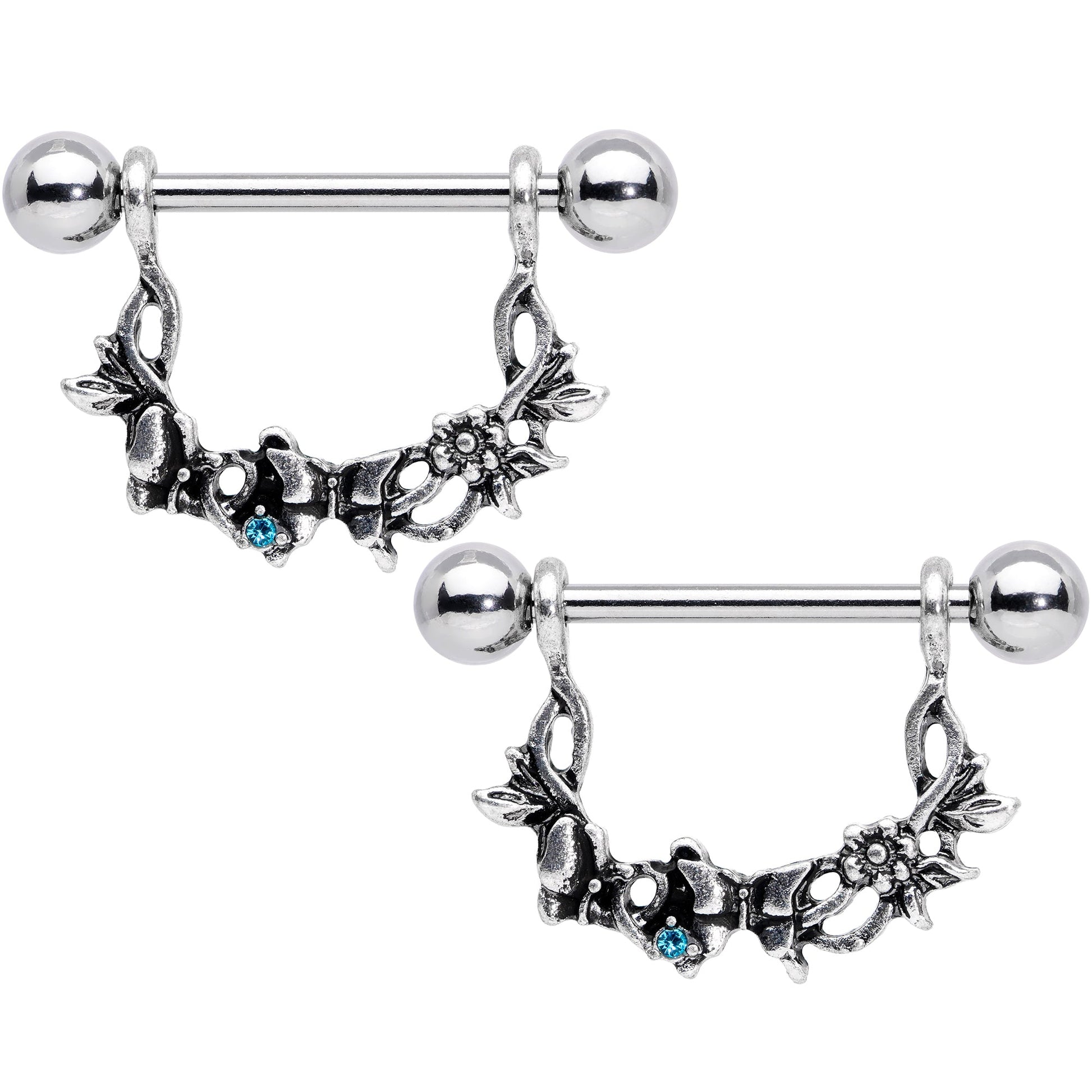 The butterfly on this 14 gauge nipple jewelry is bedecked with bows! It's made with 14mm durable 316L surgical grade stainless steel straight barbells with 5mm ball ends. Dangling beneath is an abstract butterfly, set between two stylized bows. The butterfly is set with an aqua gem for an added pop of color that is truly eye-catching. Give your nipple piercings all things beautiful with these abstract butterfly and bows nipple rings! Sold as a set of two.Specifications