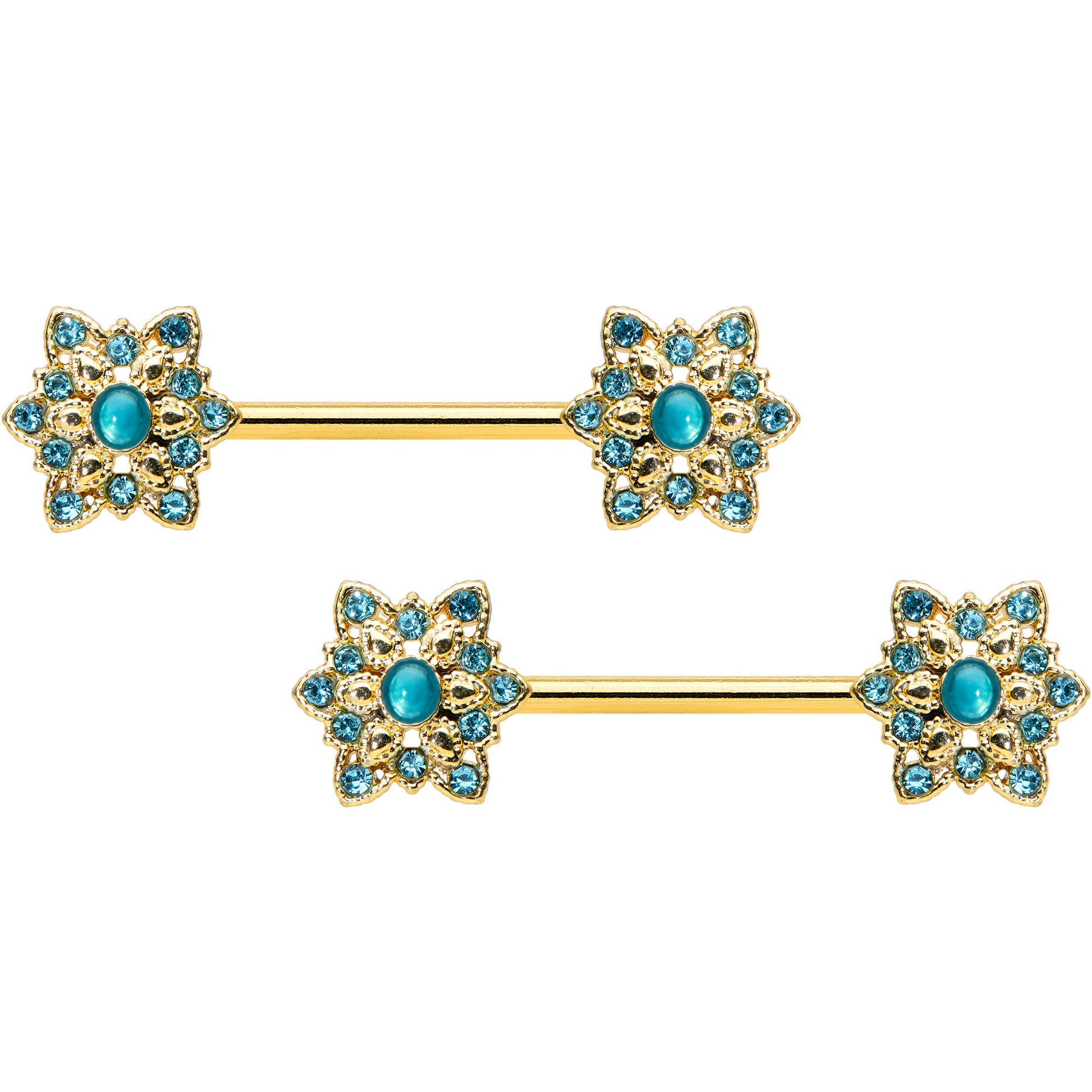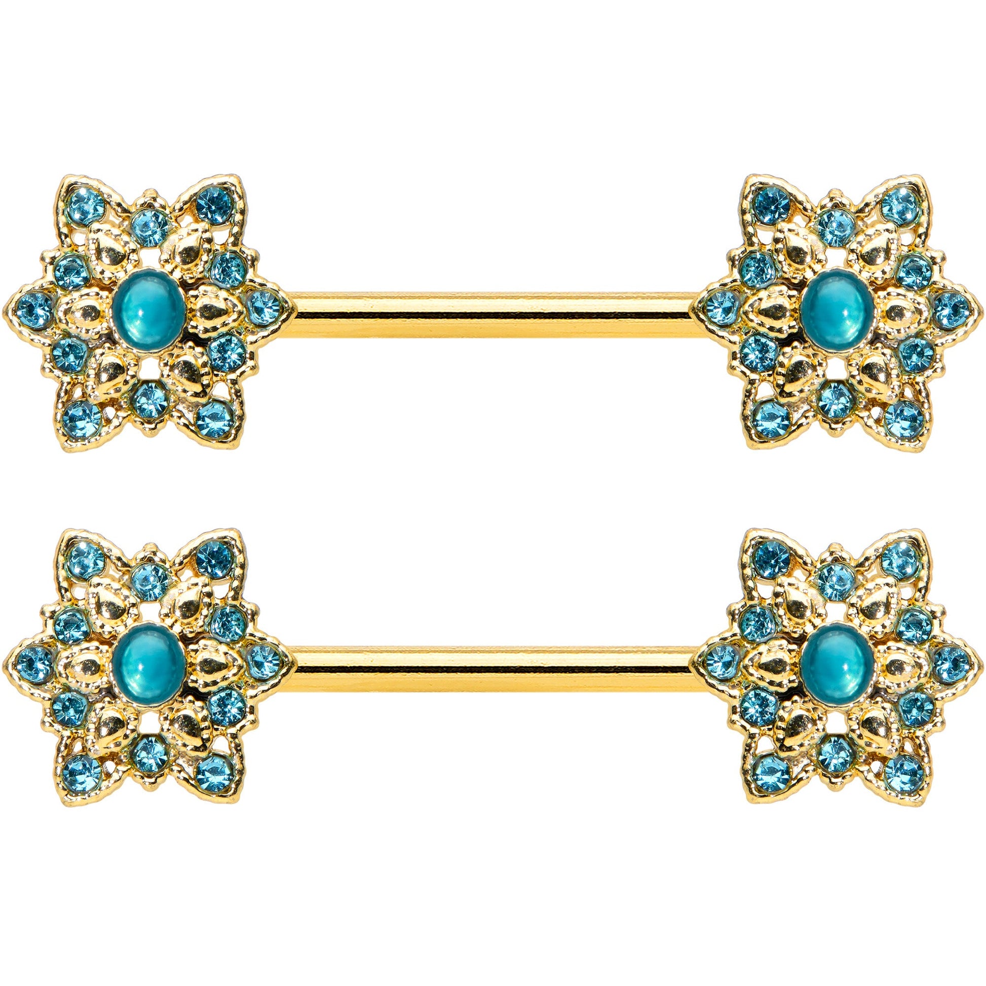 14G 9/16 Aqua Gem Gold Tone Snowflake Christmas Nipple Ring Set