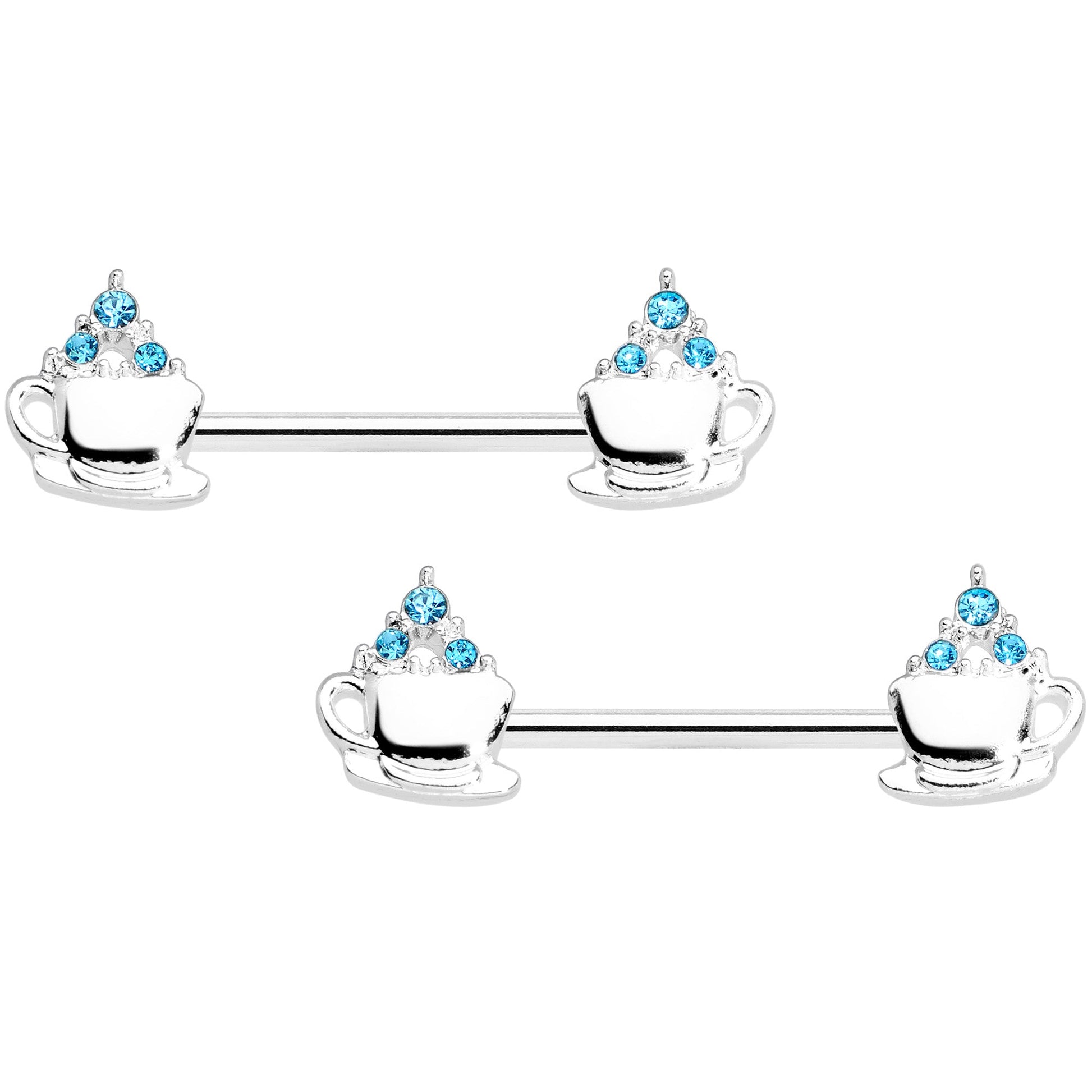 Mmmm......what could be sweeter than a cup of cocoa on a cold day? The sweet cups of cocoa on this 14 gauge nipple jewelry! It's made with 14mm durable 316L surgical grade stainless steel straight barbells with ends that feature matching teacup charms sitting on their own little saucers. Each one appears to be filled to the brim and features small aqua gems taking the place of marshmallows floating on the top. These cups of cocoa are sure to make your nipple piercings look absolutely delicious, all year round! Sold as a set of two.Specifications