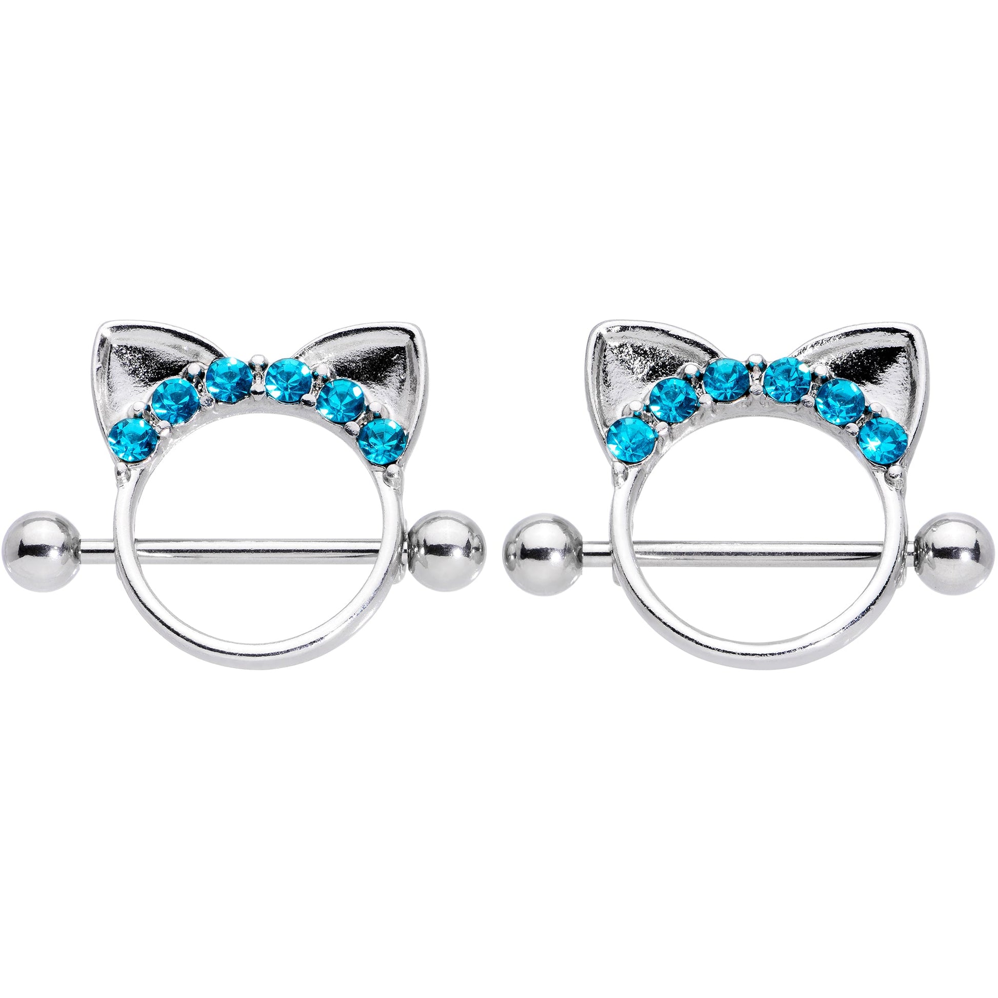 Here's a pair of kitties to make your nipple piercings pretty, on these 14 gauge nipple shields! They're made with 14mm wearable length 316L surgical grade stainless steel straight barbells with 5mm ball ends. The barbells have a total length of 3/4". The shield portion features a fashion-forward feline theme, with cat ears on the top. The ears are embellished with a row of aqua gems for an added touch of glamour that every cool cat and kitten can appreciate! Give your nipple piercings the purr-fect look with this fabulous feline nipple jewelry! Sold as a set of two.Specifications