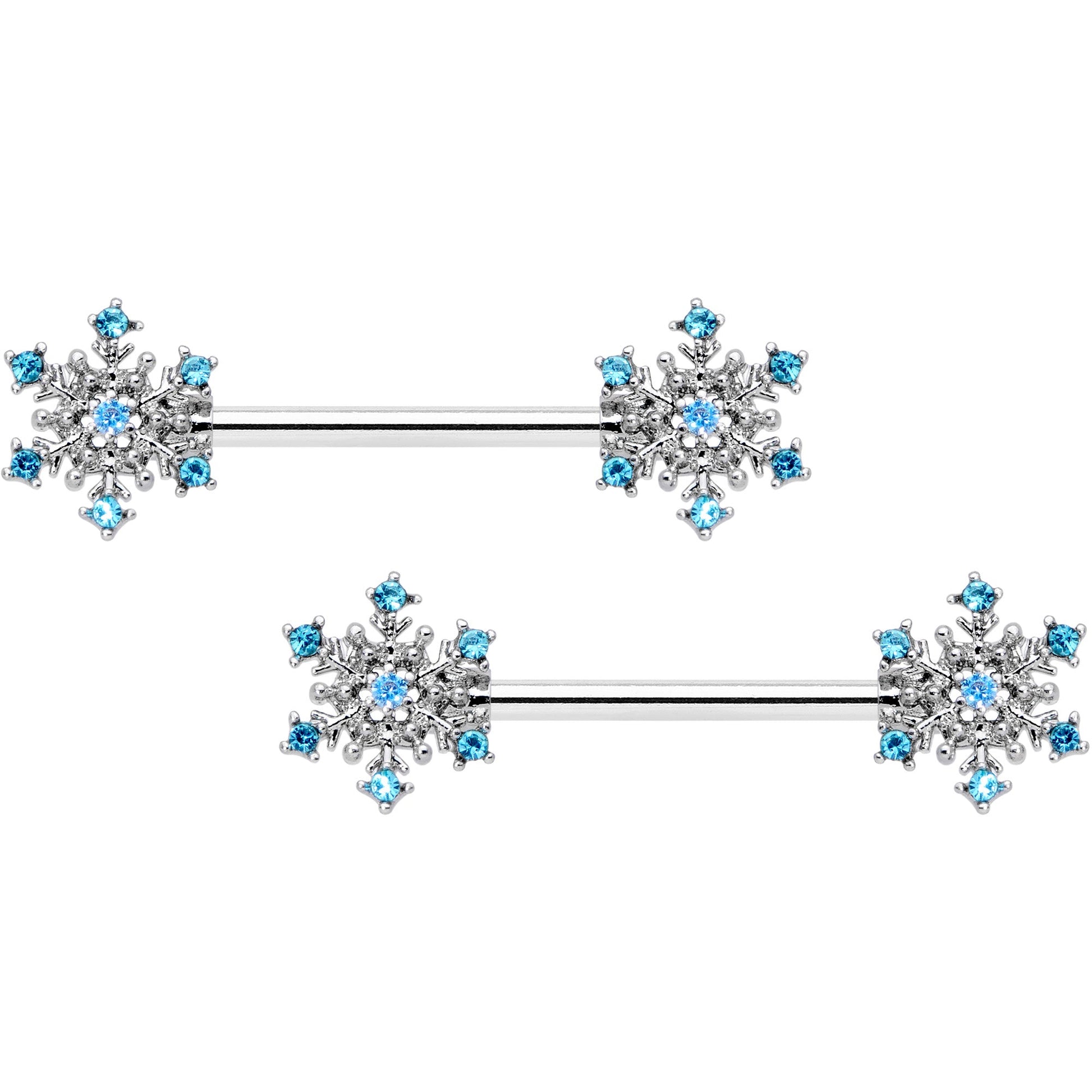 Be a special snowflake this Christmas with this 14 gauge nipple jewelry! It's made with 14mm durable 316L surgical grade stainless steel straight barbells. Each end features a snowflake charm set with aqua gems. Make your nipple piercings look as special as the rest of you this winter with these striking snowflake nipple rings! Sold as a set of two.Specifications