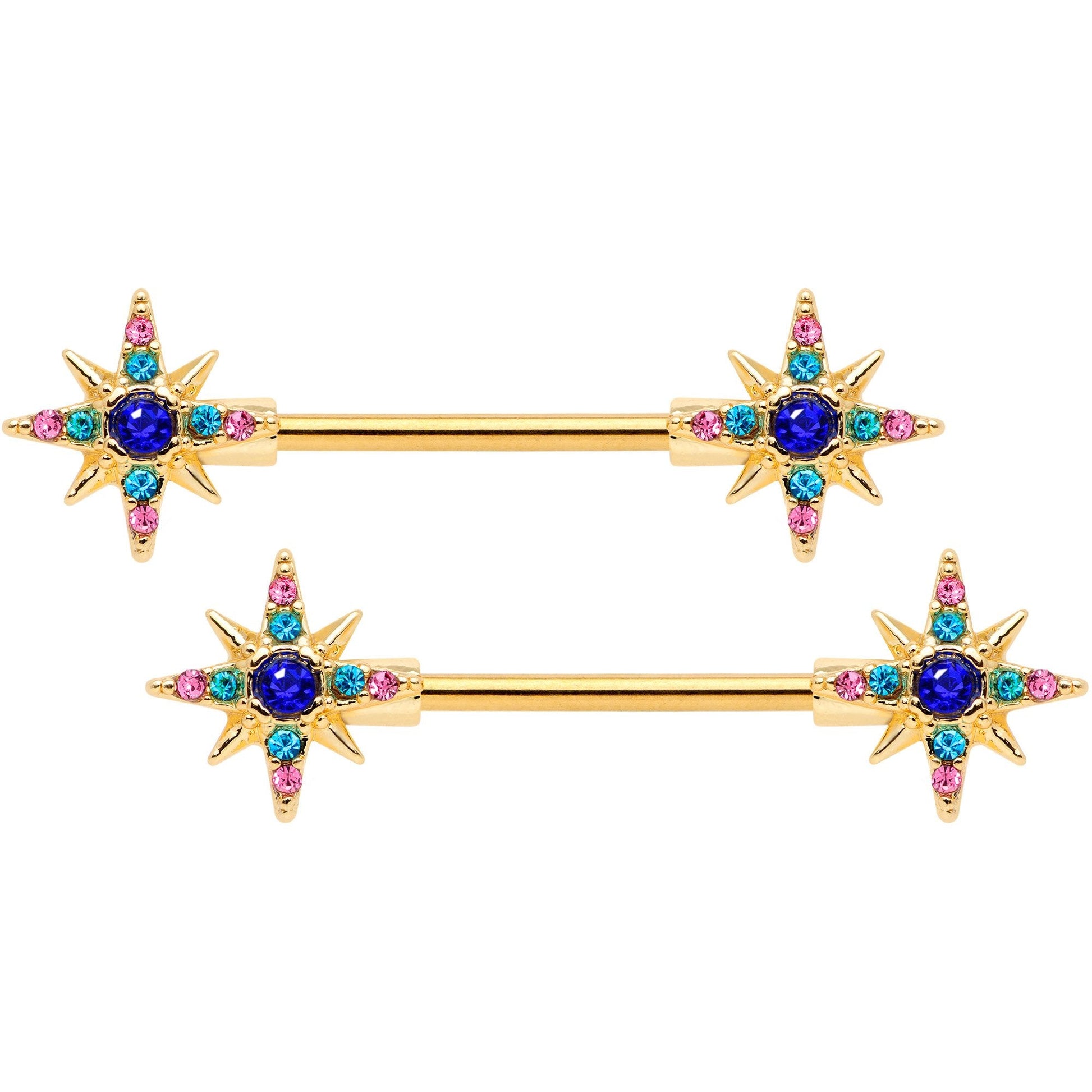 These 14 gauge nipple piercings are going to make you a star! Made with 14mm gold tone PVD over 316L surgical grade stainless steel straight barbells, they feature ends shaped like eight-pointed stars. Each star is set with numerous tiny gems in pink and aqua. At the center of each star is a larger gem in a deep royal blue for a truly regal appearance. You'll love these so much you'll be absolutely starry-eyed! Sold as a set of two.Specifications