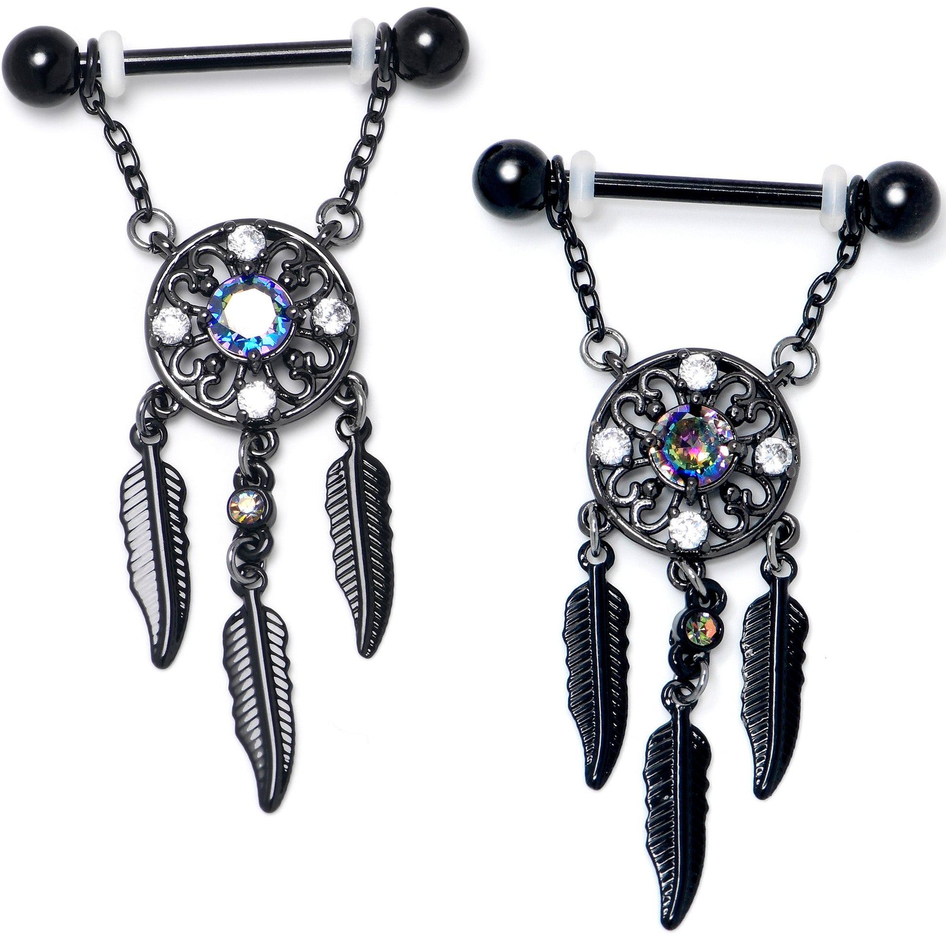 14 Gauge 9/16 Aurora CZ Gem Black Dreamcatcher Dangle Nipple Ring Set