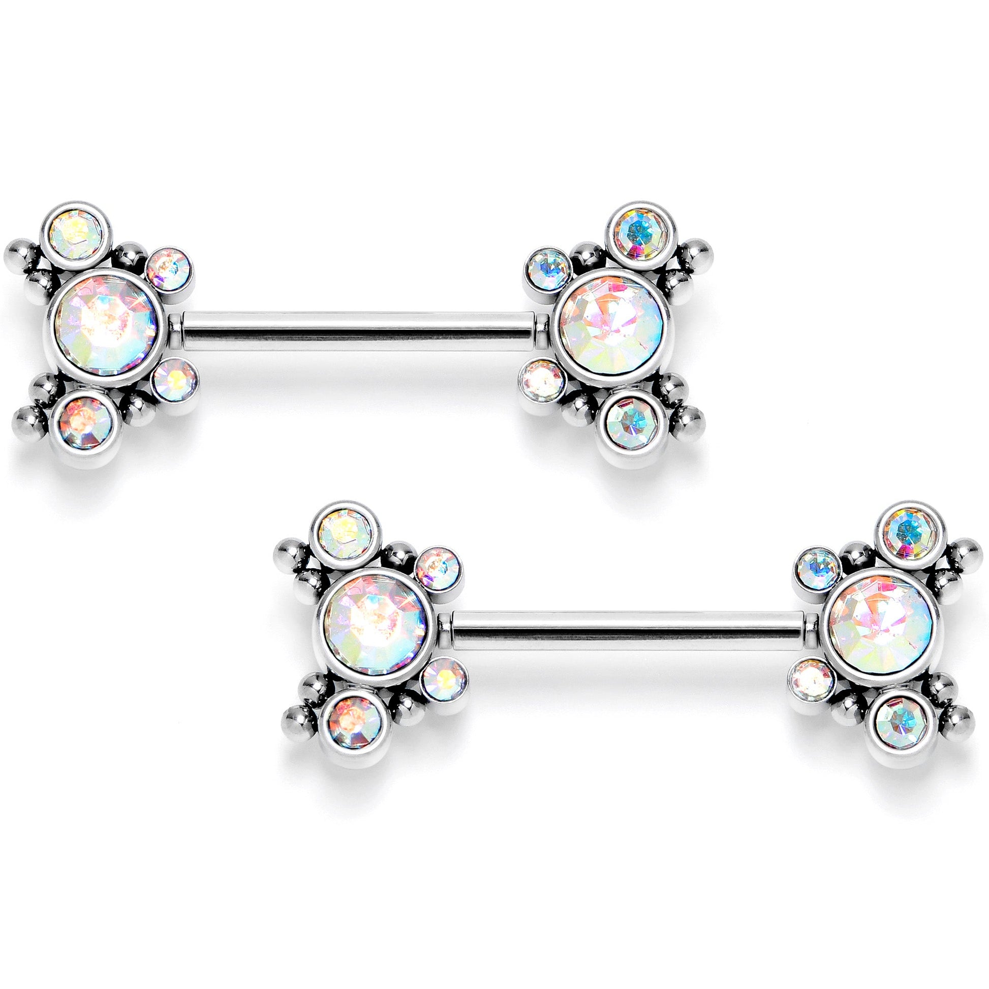 Simple style that goes with everything is what you get with with these 14 gauge nipple rings. They are made with 14mm durable 316L surgical grade stainless steel straight barbells. The ends are set with forward facing aurora cubic zirconia gems with a quartet of smaller aurora cubic zirconia gems surrounding a larger aurora cubic zirconia gem. They feature raised detailing and an threadless design for maximum comfort on insertion and removal while keeping a secure fit. Keep it simple while still keeping it stylish with this eternally elegant nipple piercing jewelry. Sold as a set of two.Specifications