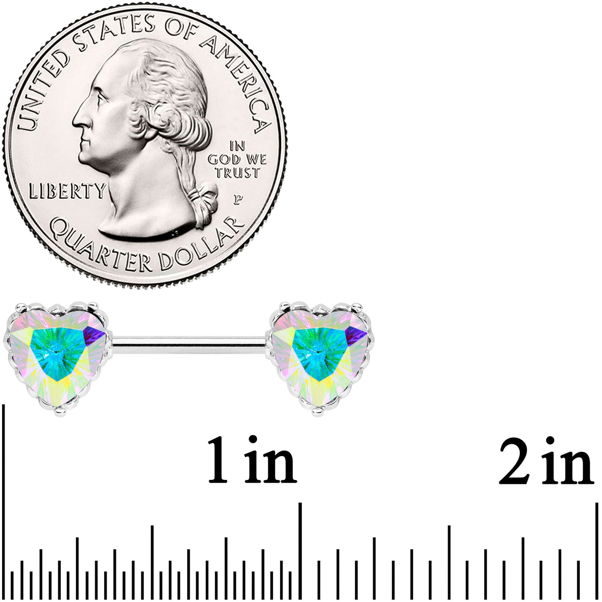 Love your piercings with all your hearts when you're rocking this 14 gauge nipple jewelry! It's made with 14mm durable 316L surgical grade stainless steel straight barbells. Each of the ends features a single aurora cubic zirconia gem in the shape of a heart for a look that's timeless, elegant, and perfect for Valentine's Day! Feel the love in your nipple piercings with these elegantly understated nipple piercing rings! Sold as a set of two.Specifications