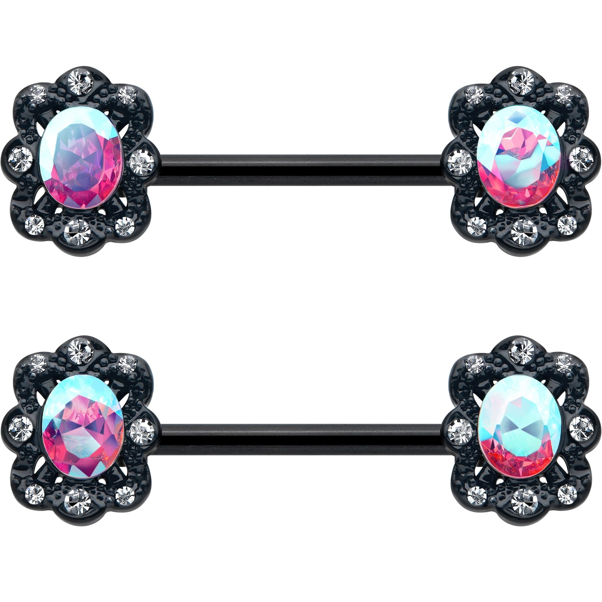 This 14 gauge nipple jewelry is full of fairy tale elegance. It is made with 14mm black PVD over 316L surgical grade stainless steel straight barbells. Each of the ends features a filigree styled charm, with clear gems set along the edges and aurora gem centers. You can not help but feel the magic when you are wearing these fairy tale-worthy nipple piercing rings. Sold as a set of two.Specifications