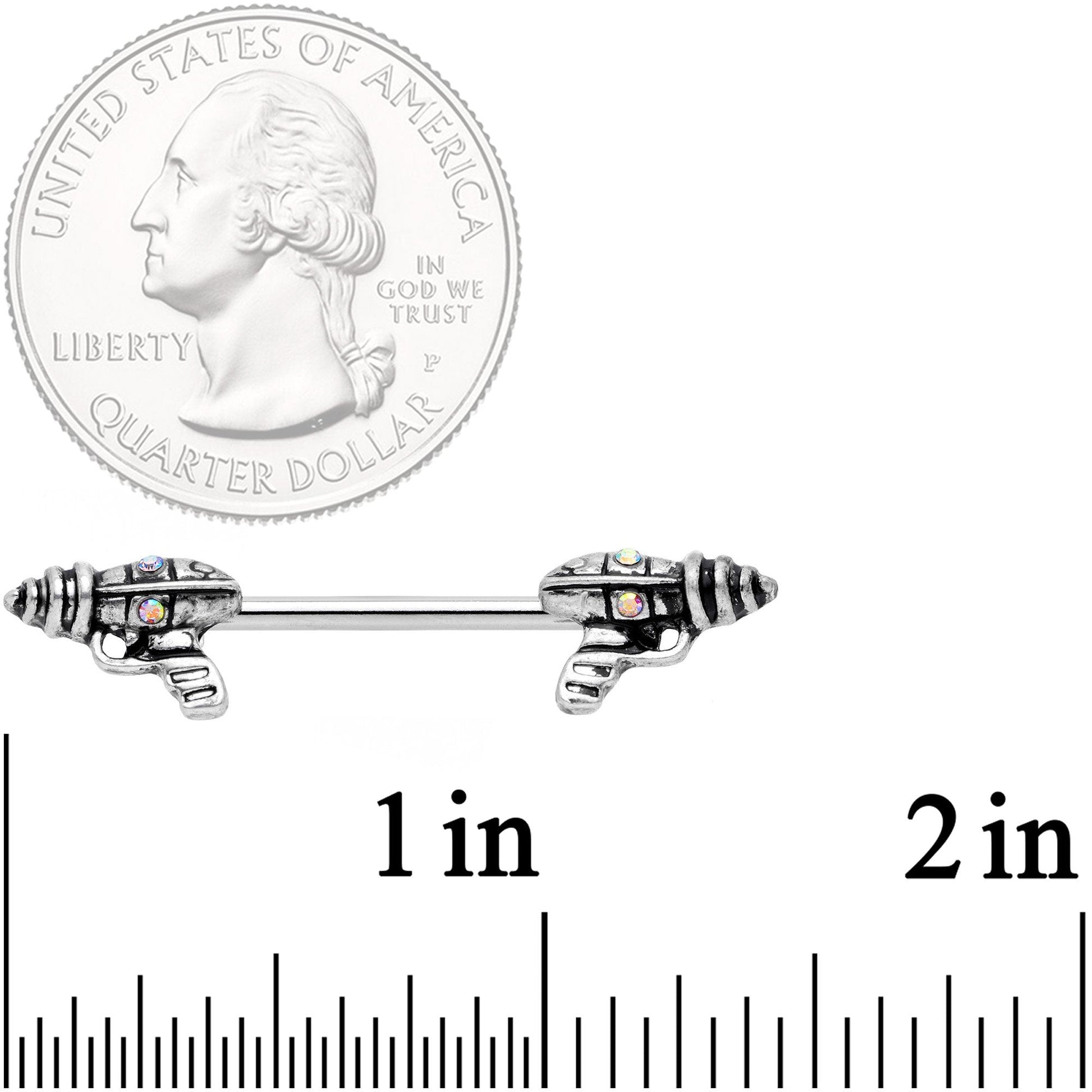 Are they shrink rays? Are they teleporter beams? These 14 gauge nipple piercings will zap your look with a big dose of futuristic style! The 14mm nipple jewelry is made with durable 316L surgical grade stainless steel straight barbells. Each end is a mysterious, ultra-modern looking raygun. The body is embellished with tiny aurora gems that really catch the eye and keep it from being overwhelmed by all the intricate detailing. These are nipple rings that are bound to leave your inner space traveler beaming with joy! Sold as a set of two.Specifications