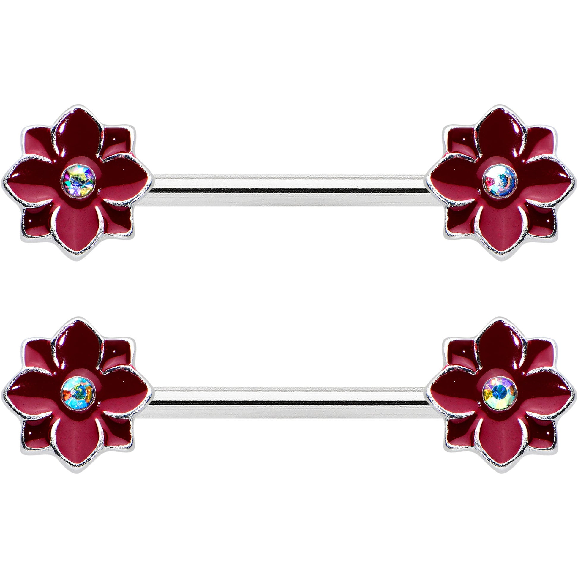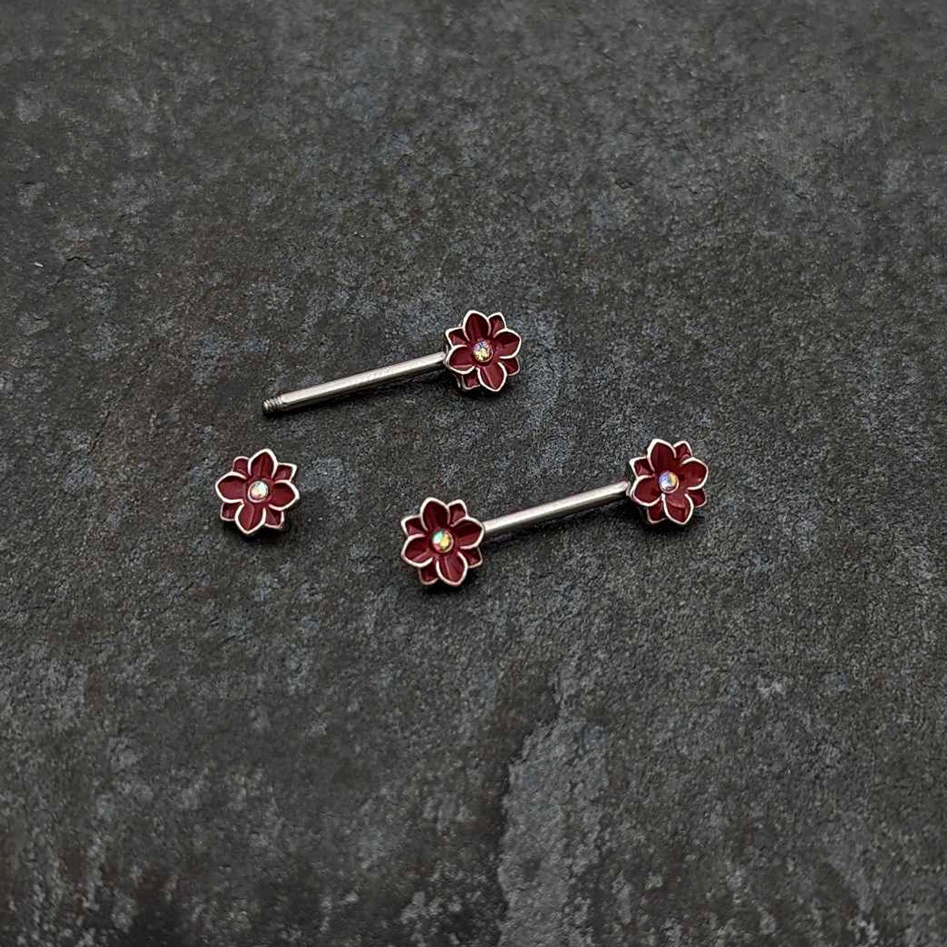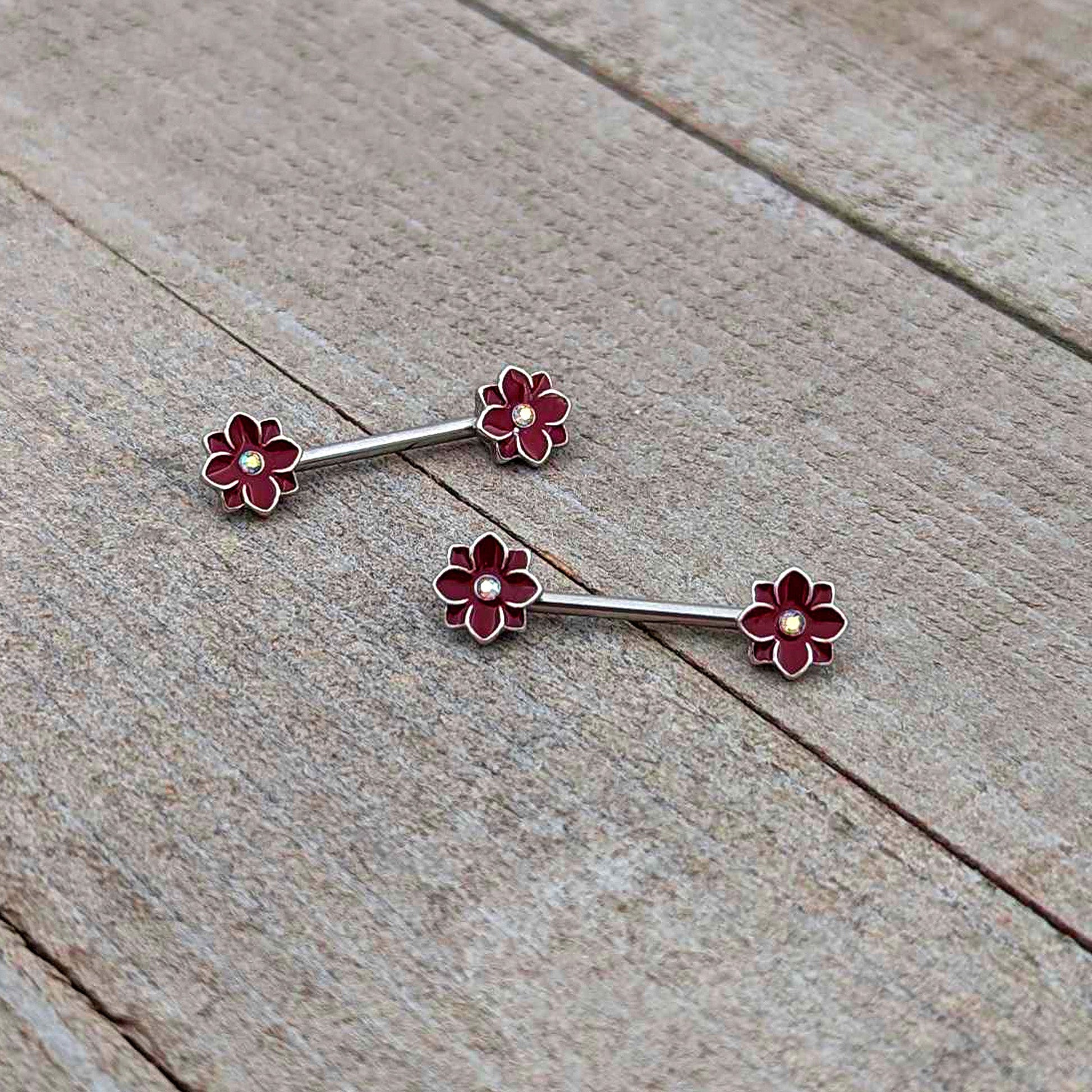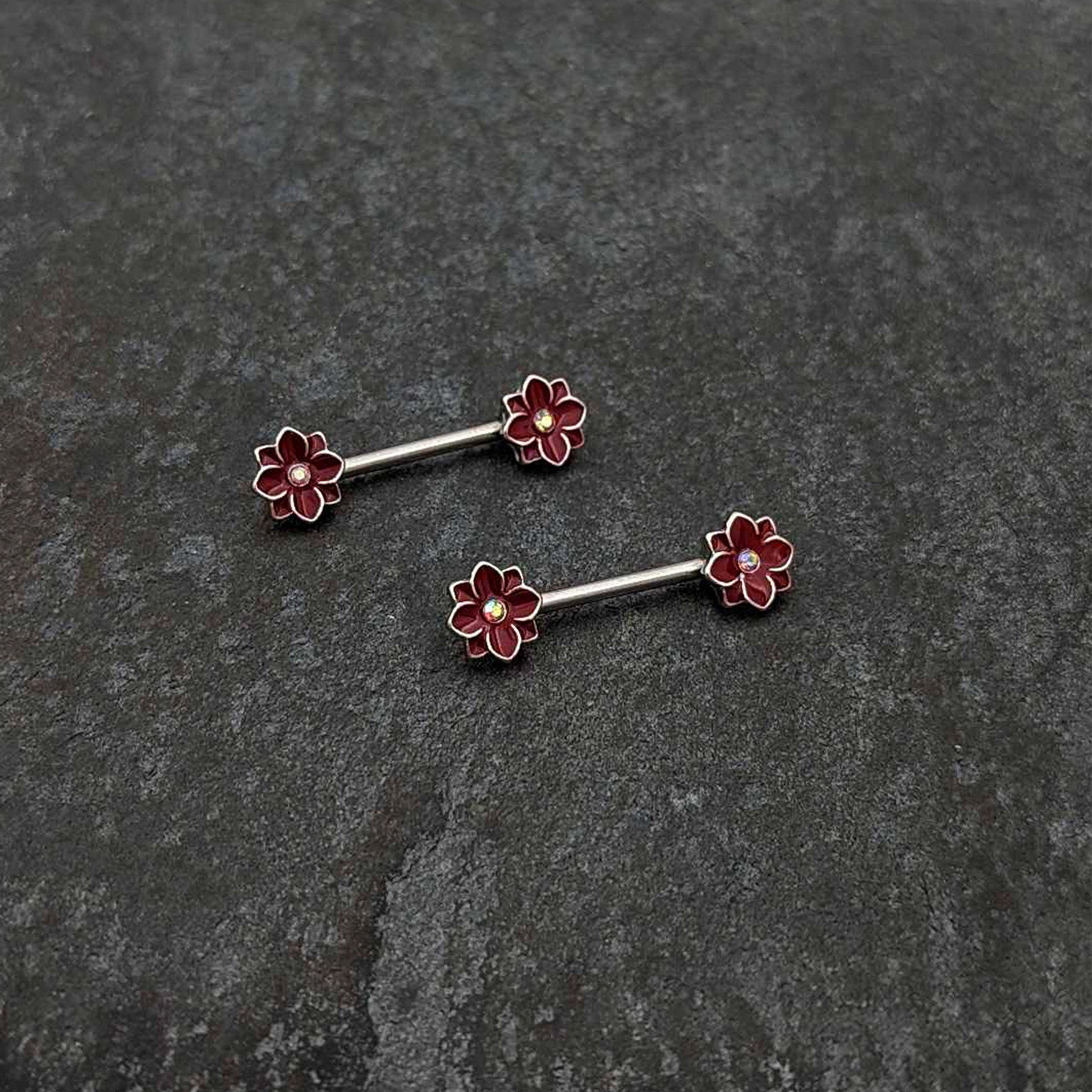 Add a festive touch to your look with this 14 gauge nipple jewelry! It's made with 14mm durable 316L surgical grade stainless steel straight barbells. Each of the ends features a poinsettia flower charm with the petals inlaid in deep burgundy red and an aurora gem center. With such glamorous styling and thoughtful details, these nipple piercing rings are sure to wow you! Sold as a set of two.Specifications